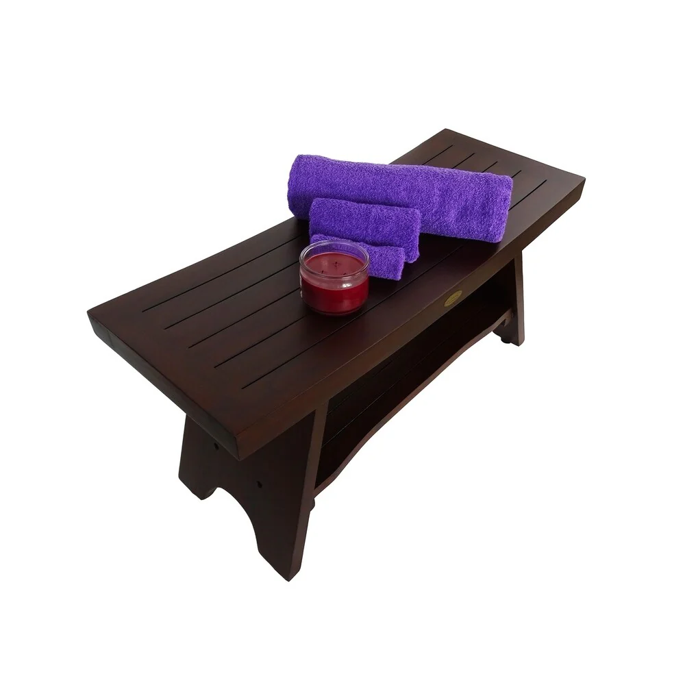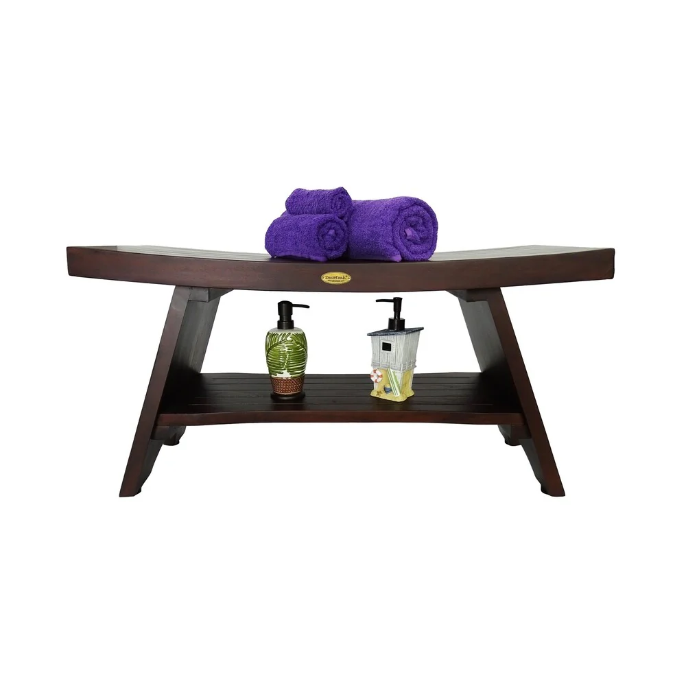 The DecoTeak solid teak 35' Zen inspired Shower Bench with shelf. It provides the feeling of the East to your shower, bathroom, living room, or patio. The included shelf gives added versatility for storage of toiletries, books, or other essentials. It has a compact footprint of 35' long, and 13' wide, with a comfortable height of 18'. The sides gently slope upwards giving its Eastern Zen flavor. It has been styled on Zen design themes that provide calm, tranquility, and elegance to your setting. This is a large piece but it does not overpower its surroundings. The gentle slope and large underneath shelf gives this bench the ability to be used in your hallway, outdoors, as an end table, a small coffee table, or in front of your bed for modern compact urban interiors or exteriors. For use in the shower, doors or outdoors. Rich WoodLand brown finish that we pioneered. Provided by a woman owned small business. Some assembly is required