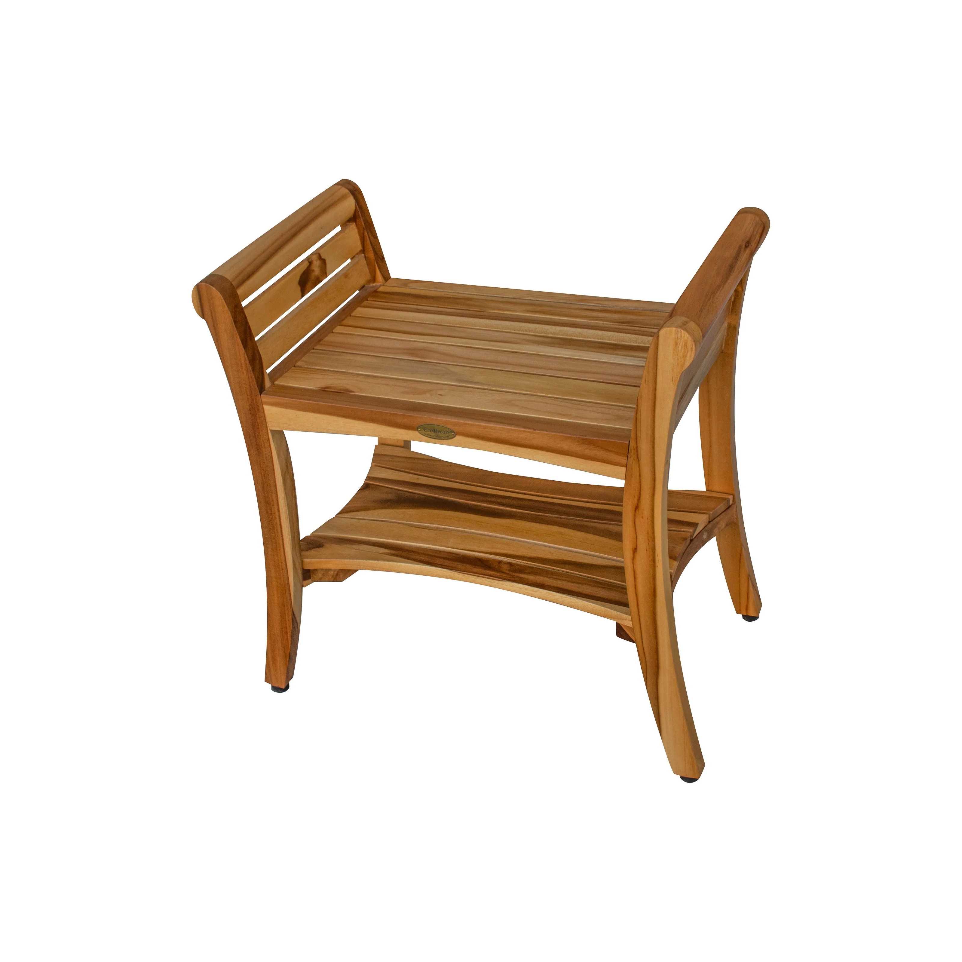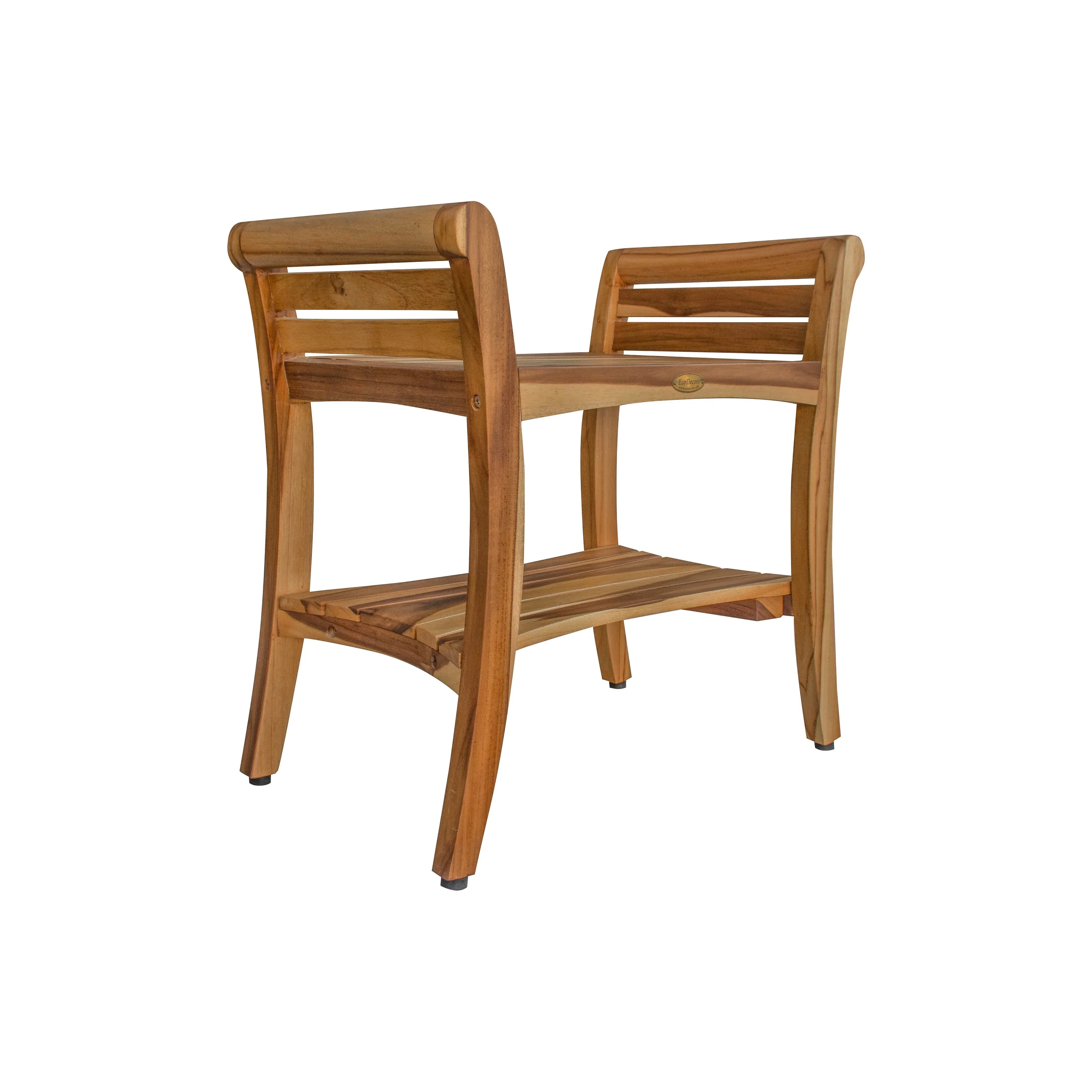 - Compact, Elegant Design: The EcoDecors shower bench offers a compact 24-inch seat and includes LiftAide arms for both style and practical support. The ergonomic arms allow for a safe transition between sitting and standing, while the two-tier shelf offers ample space for bath essentials. This teak shower bench combines elegance with ease for a refined bath experience.