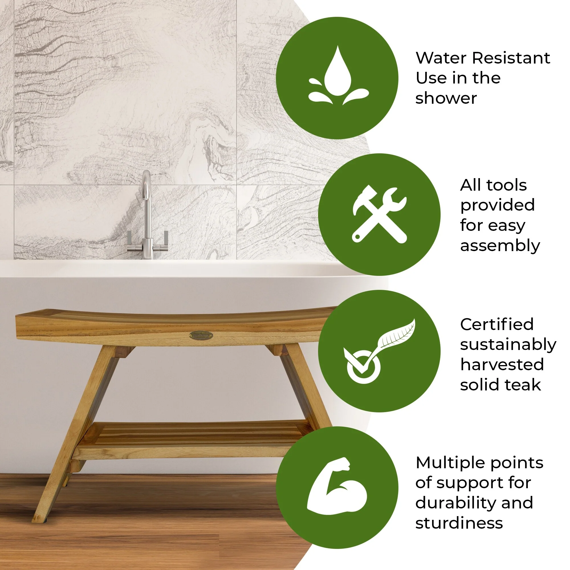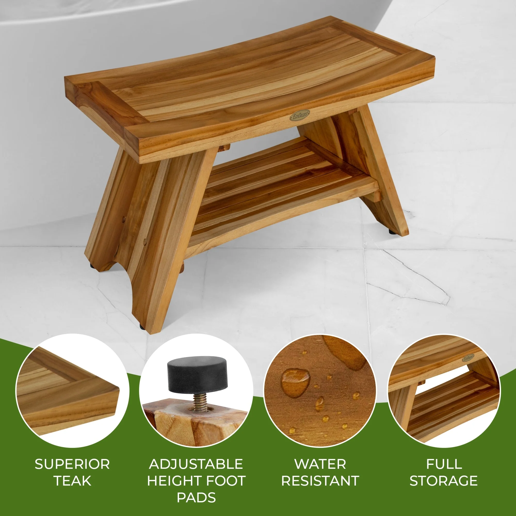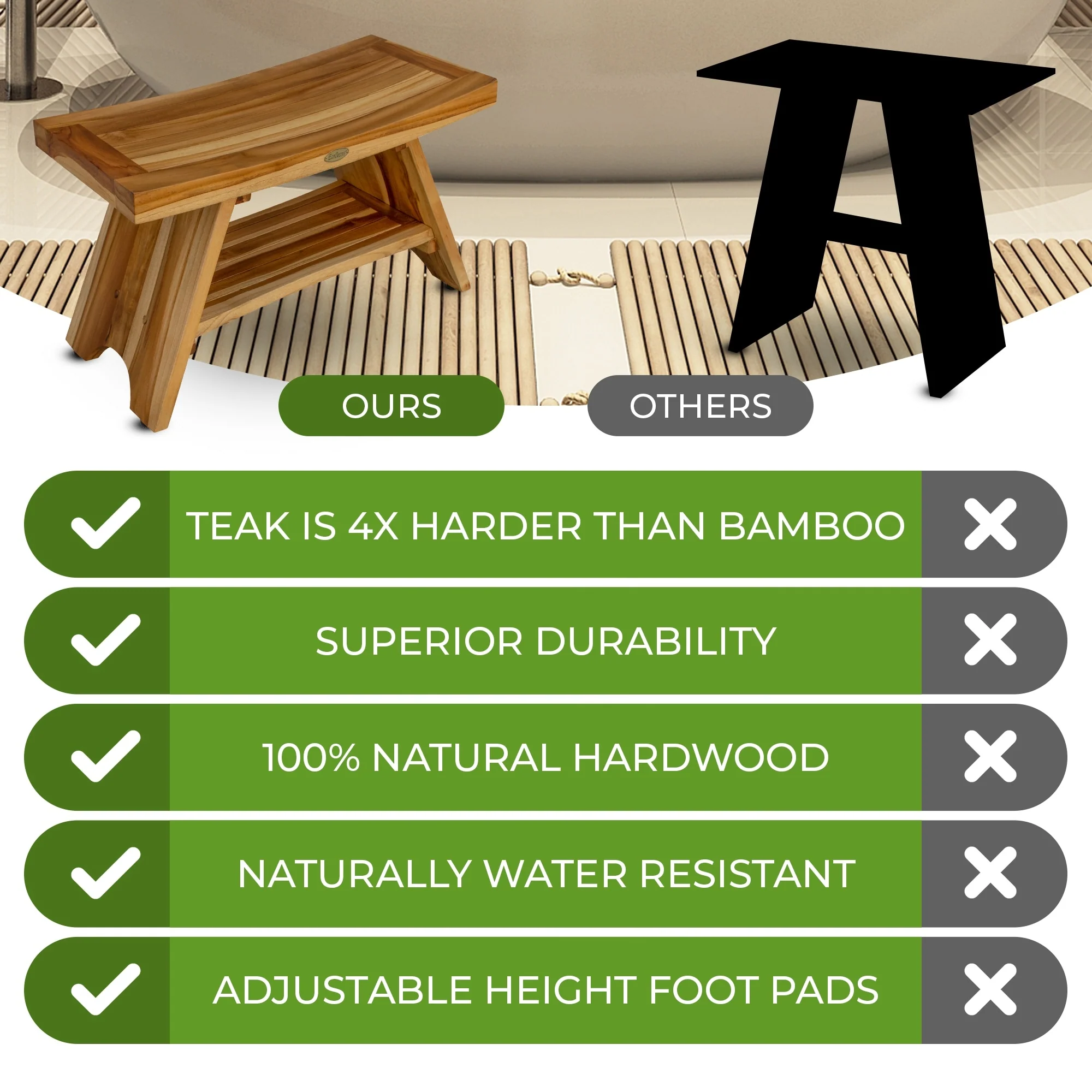 Elevate your bathroom with the 30' Serenity teak bench, a beautifully crafted piece that combines luxury and functionality. Designed to enhance your shower experience, this bench is made from 100% Indonesian plantation-grown teak wood, known for its high oil content and exceptional durability. Its dimensions—30 inches in length, 14 inches in depth, and 18 inches in height—provide generous seating space, making it the perfect teak shower chair for inside your shower. Created by a woman-owned company, this bench features height-adjustable rubber feet, ensuring it stays stable on any surface. The built-in shelf adds a touch of convenience, offering easy access to your shower essentials. Whether you need a spacious teak shower bench or a versatile stool, this piece brings both style and reliability to your bathroom. With the natural water-resistant properties of teak, it's ideal for humid environments, ensuring long-lasting beauty and function.