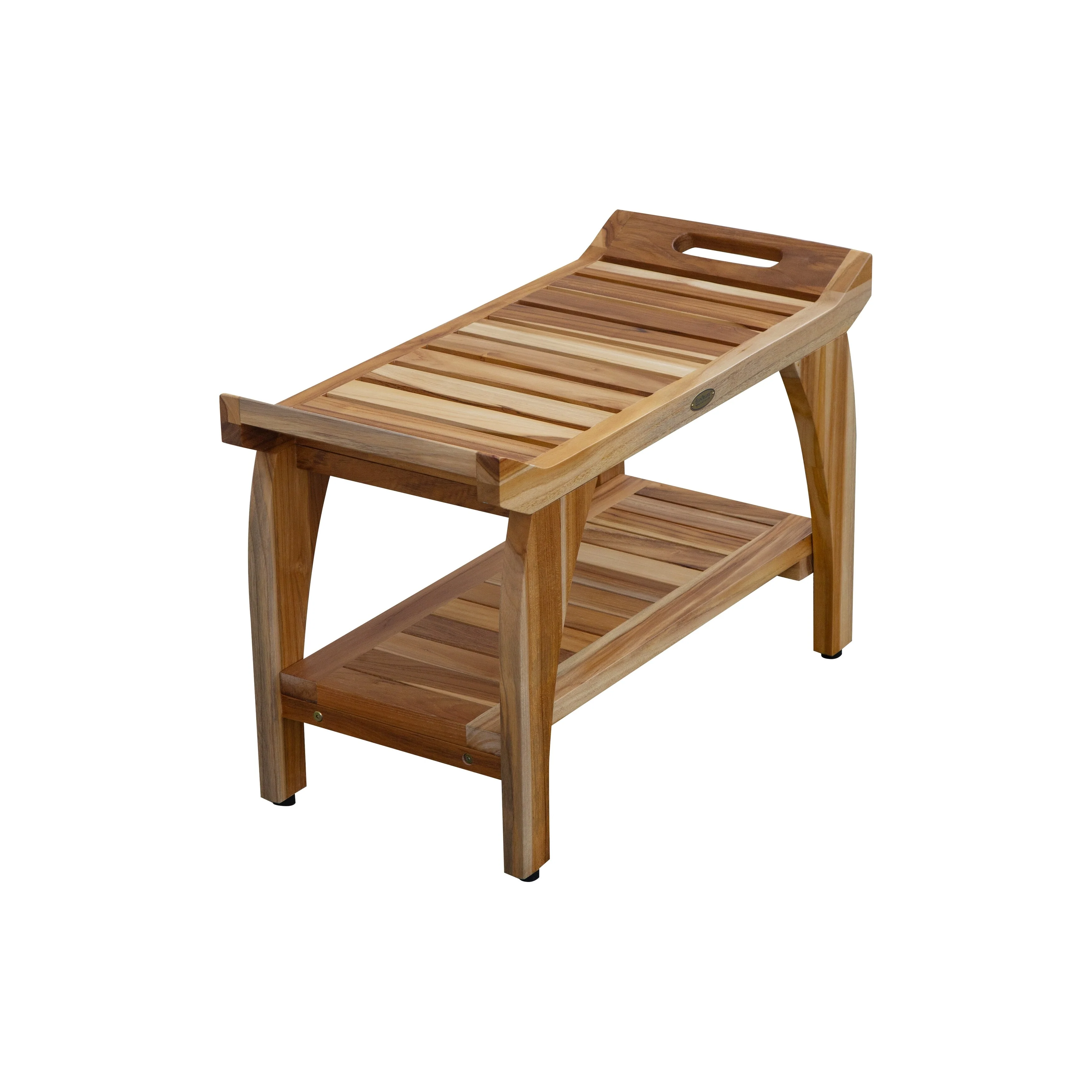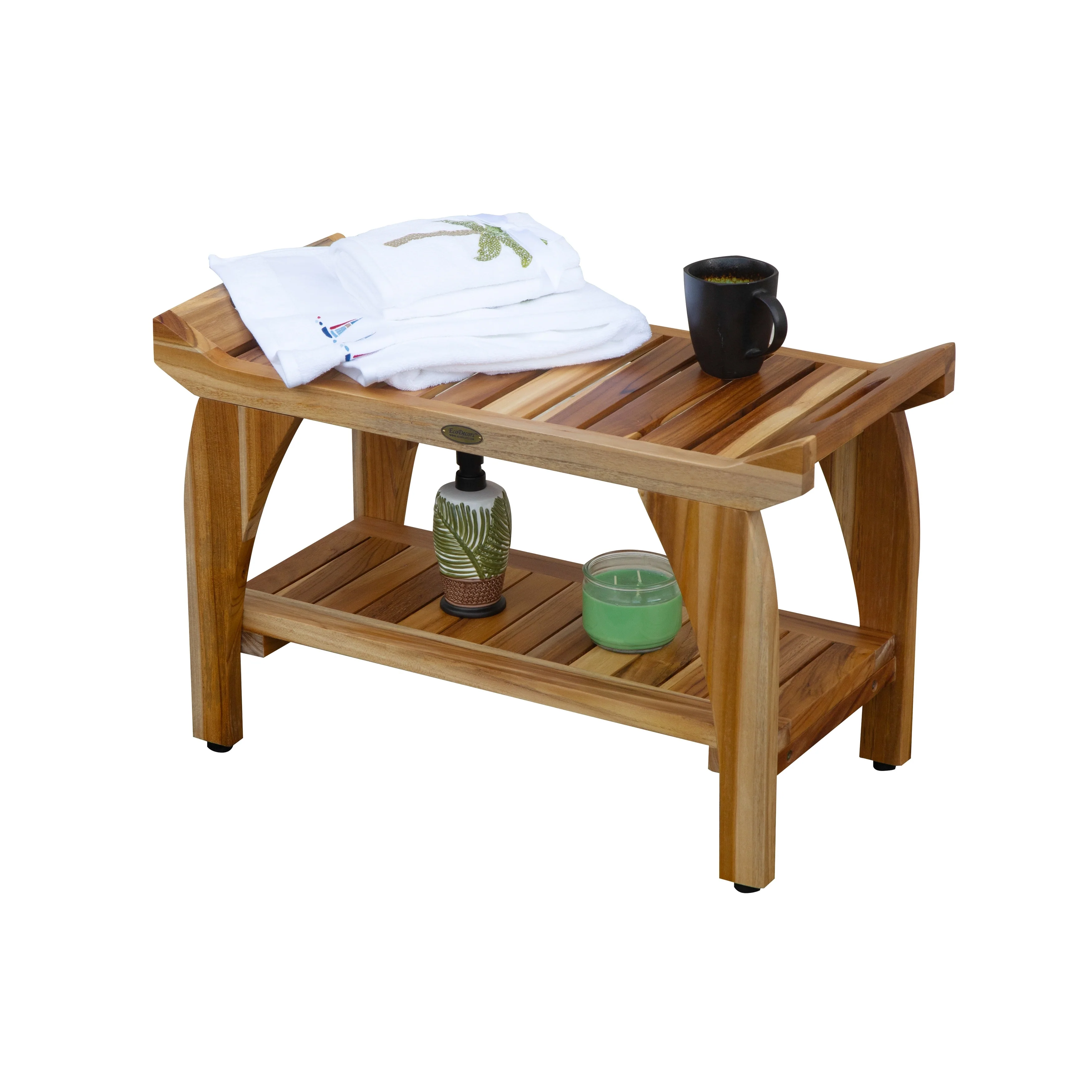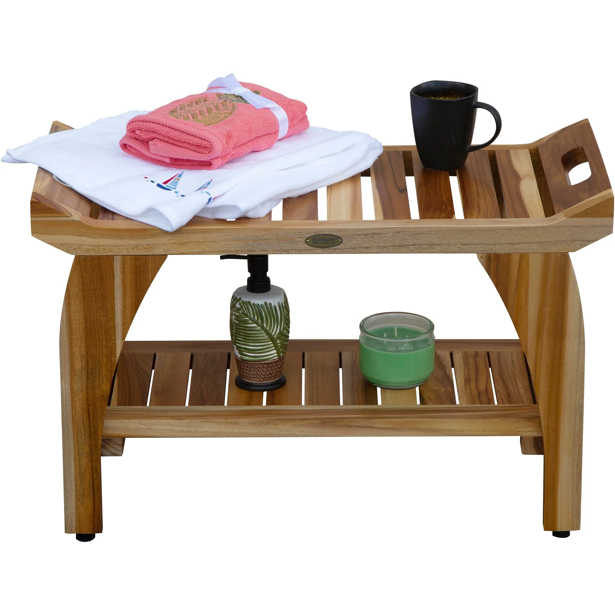 - Functional Design: This teak shower bench comes with a built-in shelf for extra storage. It's perfect for keeping your shower essentials close, while adding a stylish touch to your bathroom. It's not just practical, but also super versatile and made to last.Stability and Comfort: Designed for easy use, this wood shower bench features flared LiftAide arms for added support. The secure handles make it easy to transition from sitting to standing, giving you more comfort and mobility during your shower.Adjustable Rubber Feet: No worries about uneven shower floors! Our teak bench has adjustable rubber feet that keep the bench stable, even on sloped surfaces. These foot pads allow you to easily adjust the height, making your bathroom experience even more relaxing.100% Plantation Grown Teak: Each teak shower stool is made from top-quality, sustainably grown teak. The high density and natural oils in the wood make it perfect for wet environments, both indoors and outdoors. It's built to last and perform well over time.Women-Owned Business: Proudly crafted by a woman-owned company, this teak stool blends style, quality, and value. We care about offering products that enhance your life, providing safe and stylish designs that you can rely on.Assembly Required: Easy to follow instructions, tools, and hardware are all included.