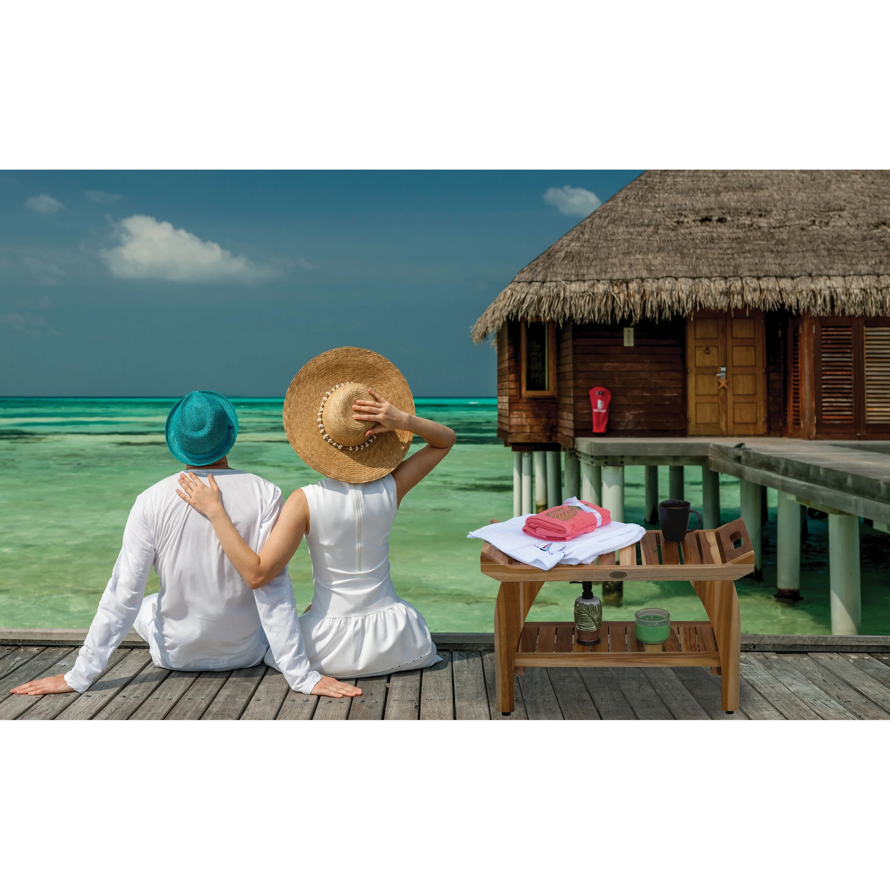Our earthy teak wood shower stool is 18 inches tall and 30 inches wide, offering both stability and safety. The foot leveling pads help keep things steady, even if your shower floor isn't perfectly flat. You can even hang towels on the bench, and it doubles as a towel rack when you're done showering. The shelf gives you extra storage for toiletries, towels, or other essentials. With a weight capacity of 300 pounds and water-resistant teak, this bench is made for durability. Update your bathroom with this stylish EcoDecors teak shower stool collection. Its natural finish works with any decor style, making it perfect for your home.