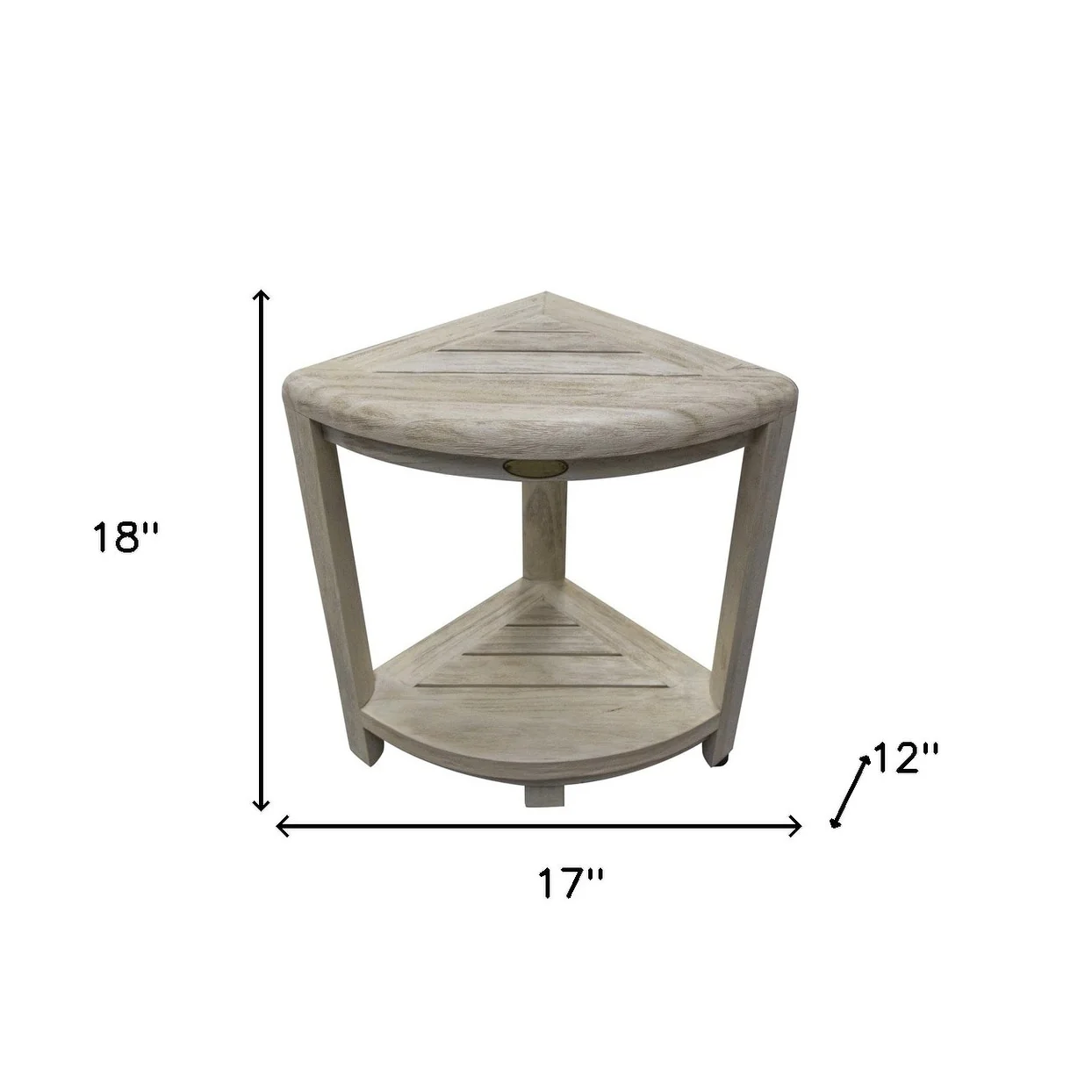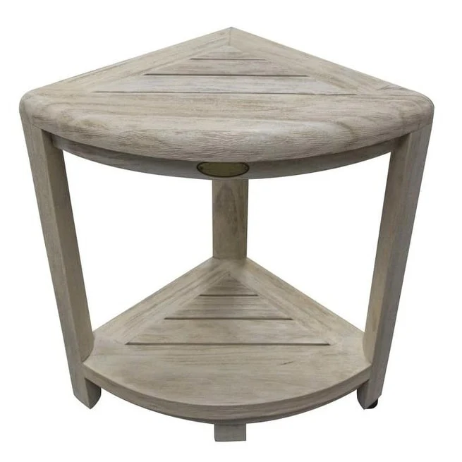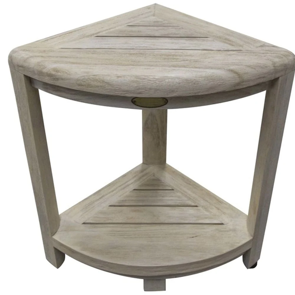 Enhance your shower experience with this 18-inch x 17-inch white washed teak corner shower bench. Crafted from water-resistant teak, this contemporary-style bench not only adds a touch of elegance to your bathroom but also provides durability and longevity. Its corner design allows for efficient use of space, fitting perfectly into any shower area. The white washed finish adds a modern and stylish appeal, effortlessly blending with any bathroom decor. Whether you need a convenient place to sit or simply want to add a touch of luxury to your shower routine, this teak shower bench is the perfect addition to your bathroom oasis. 18-inch H x 17-inch W x 12-inch D