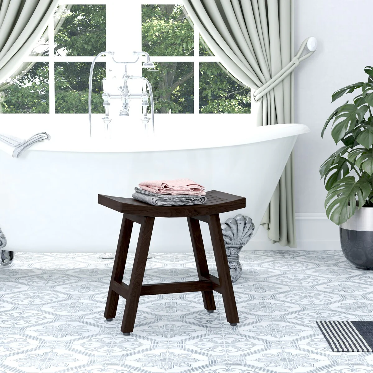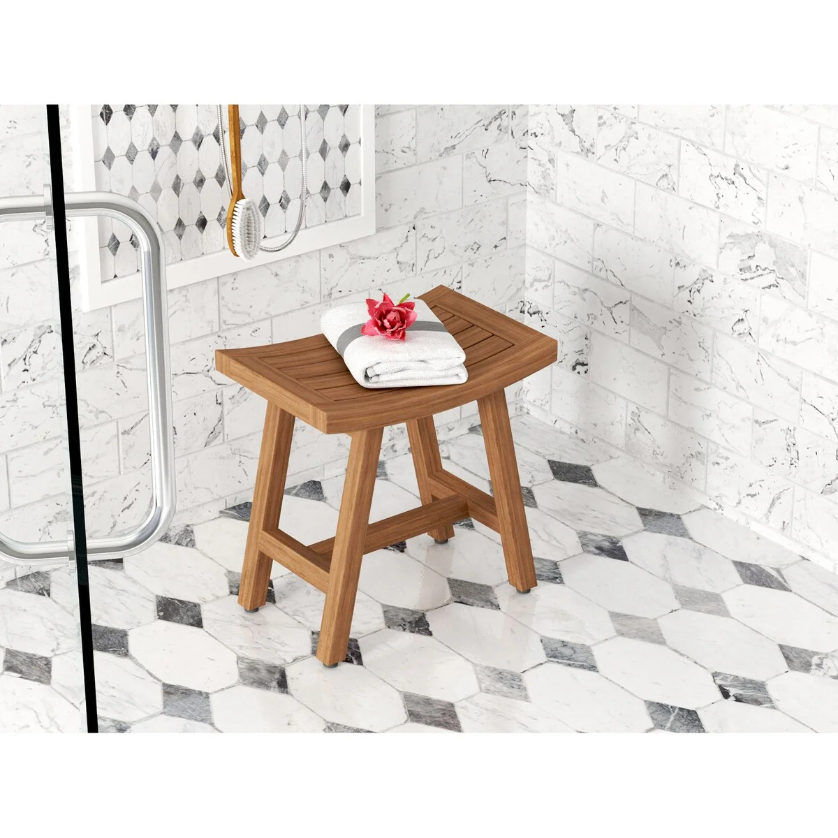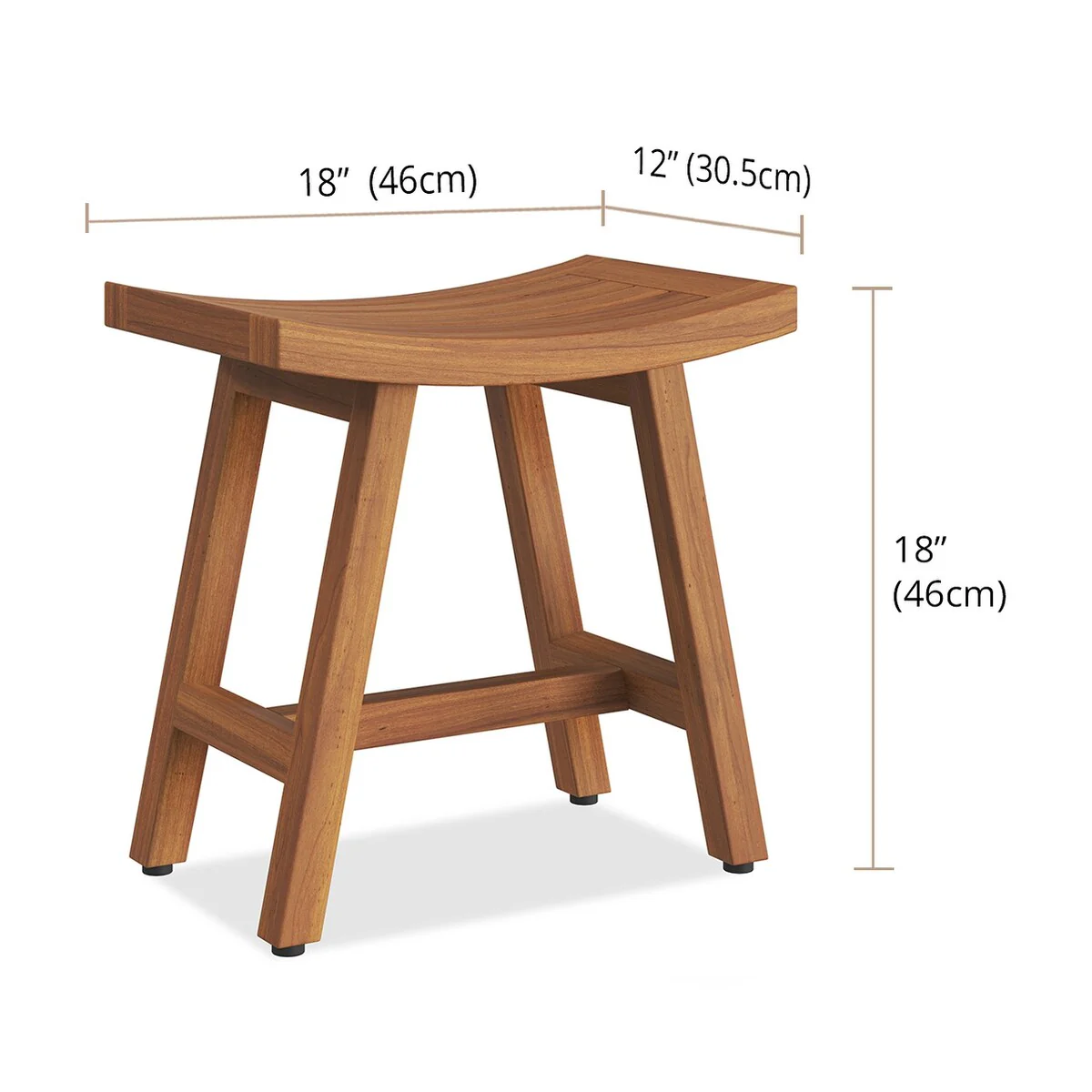 Amplify your personal home decor style with teak!A small piece of furniture can make all the difference in any space. Our 18 inch teak shower bench is compact enough to fit in small spaces but big enough to provide a luxurious place for you to sit or rest your shower things.CompactAdded base supportComfortable, curved top designWhether you need a nice accent for your spa or it's time to add a little luxury to your personal shower, this teak shower bench is what you need. 18' heightBeautiful Indonesian teakRubber feetGracious designUnique benchSome Assembly RequiredTeak wood is impervious to moisture, and its rich gold-brown color makes it absolutely gorgeous. The gently curved seat of this teak shower bench is inviting and designed to drain water. Enjoy our 30-day satisfaction guarantee and five year warranty.