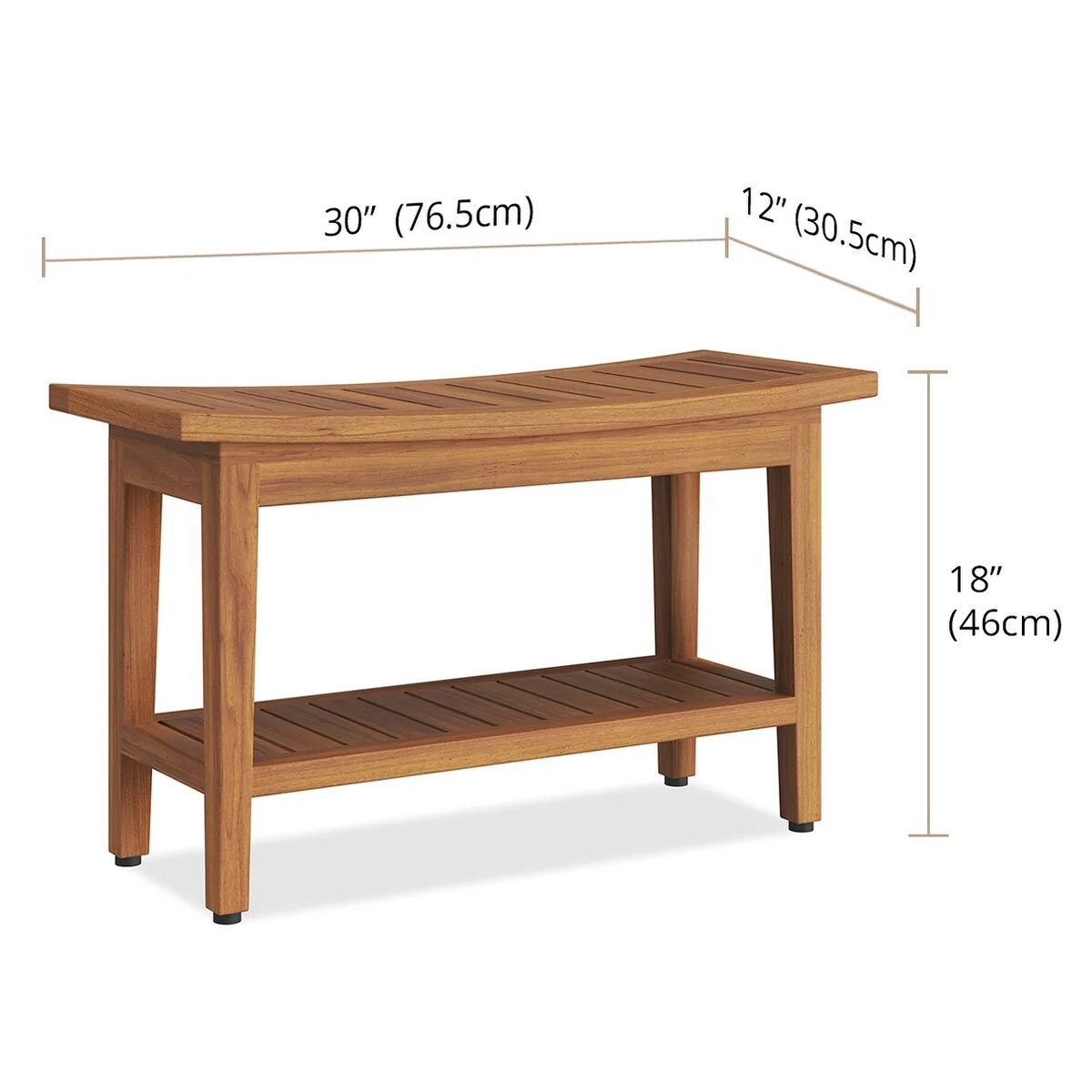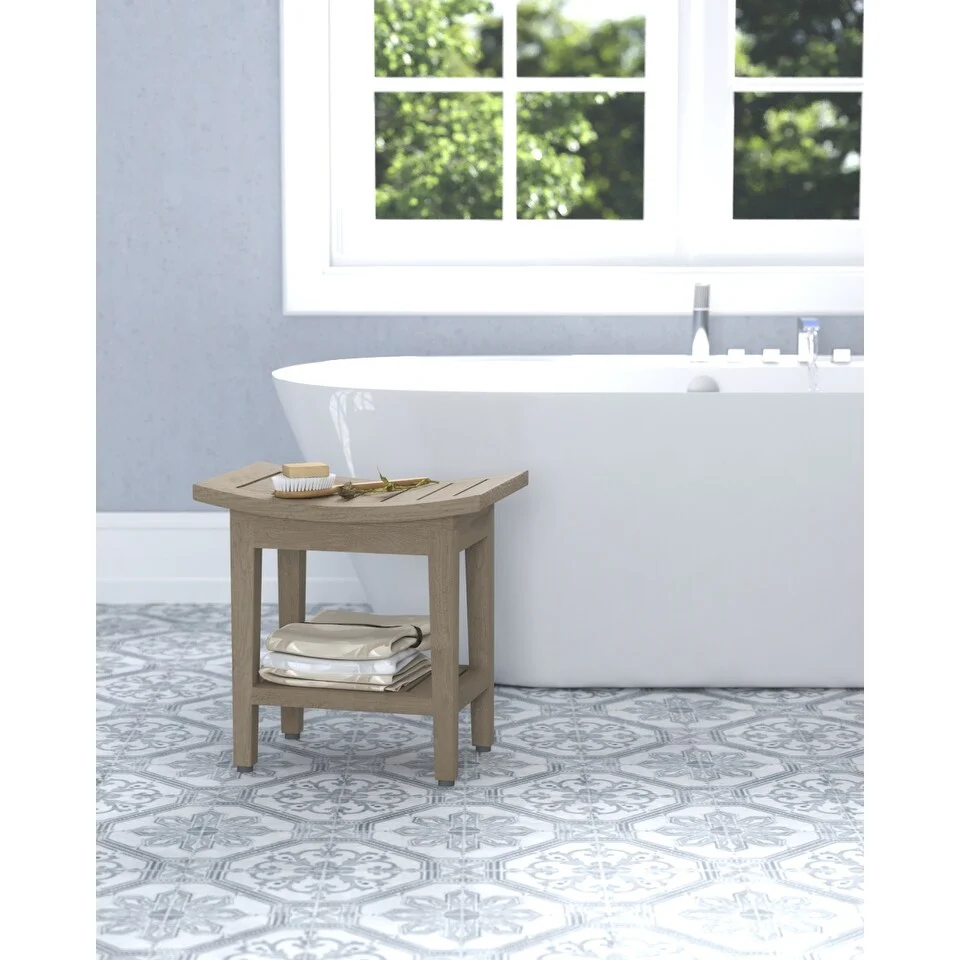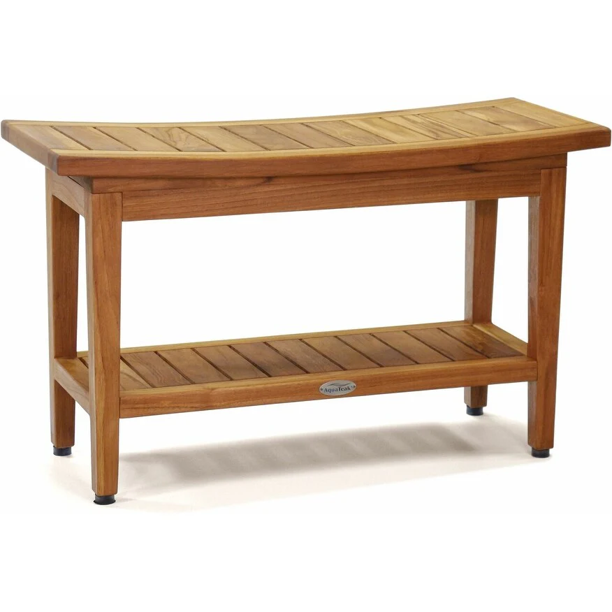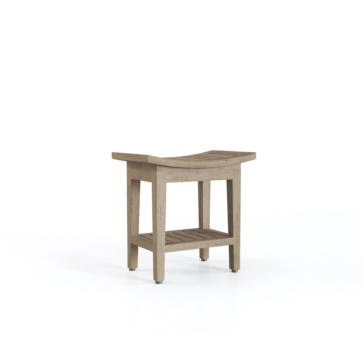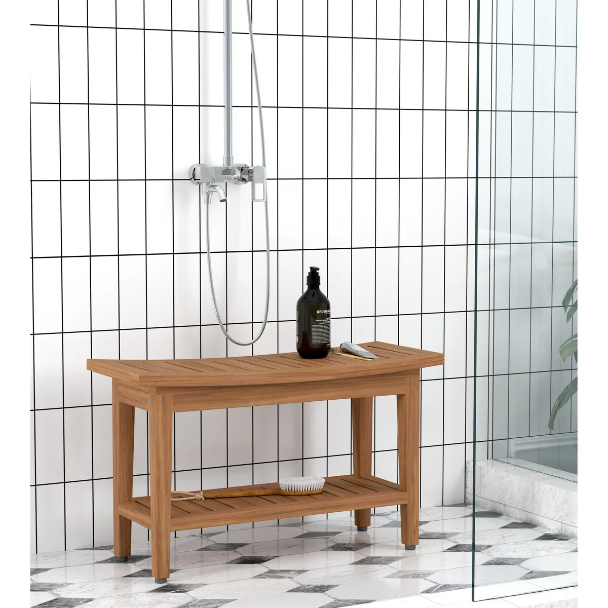 Ditch other materials and rejuvenate your space with teak!This OptiAREA space saving teak bath bench is a fantastic choice for any space. The compact design of this teak shower bench allows for both functionality and convenience, and includes a handy shelf for additional storage space.ConvenientSleek profileSafe in wet/humid conditionsThis teak shower seat also features adjustable rubber padded feet for safety and stability in any location! Naturally water-resistant, the teak shower stool is suitable for use both indoors and outdoors. Stainless steel hardwareIndoor/outdoor useWeather-resistantOur teak wood is all sustainably harvested and environmentally friendly, and includes stainless steel hardware for added durability. We offer a 30-day satisfaction guarantee and five year warranty on all of our products!(Some assembly required)