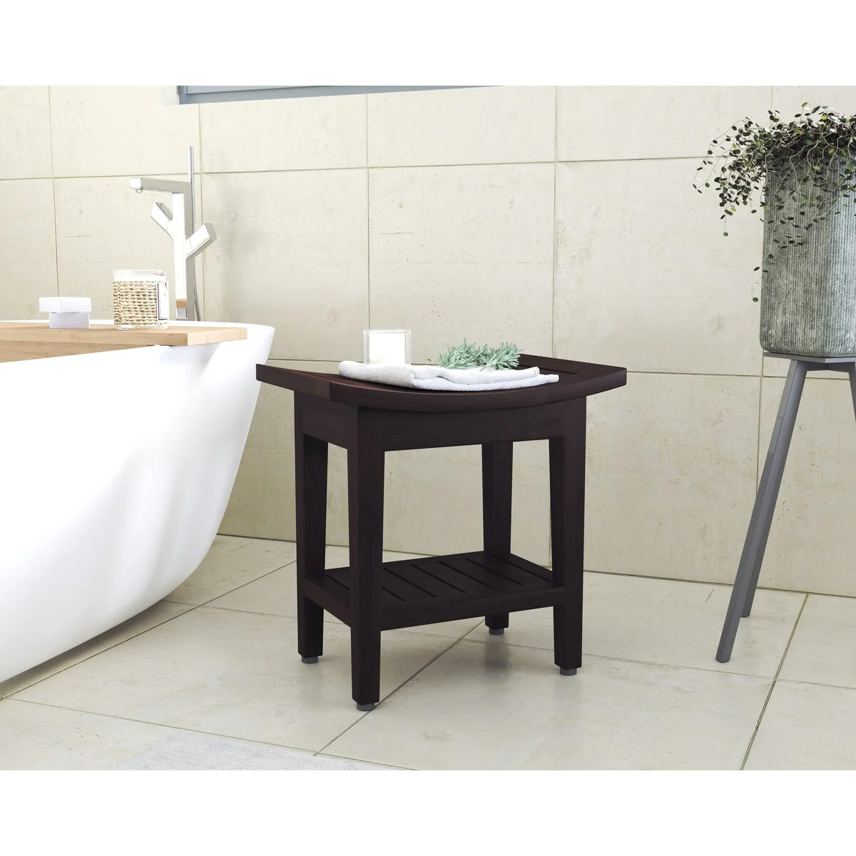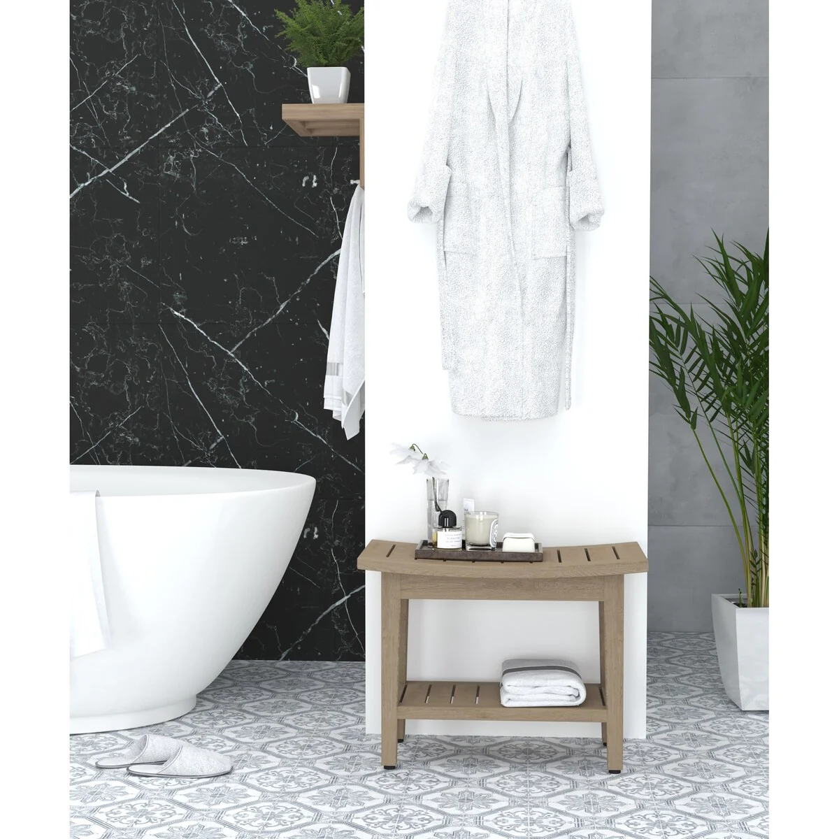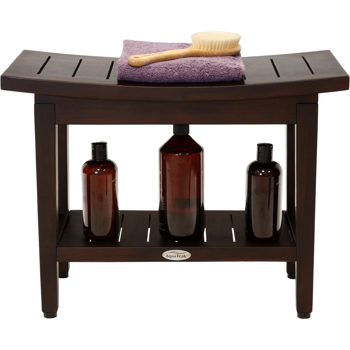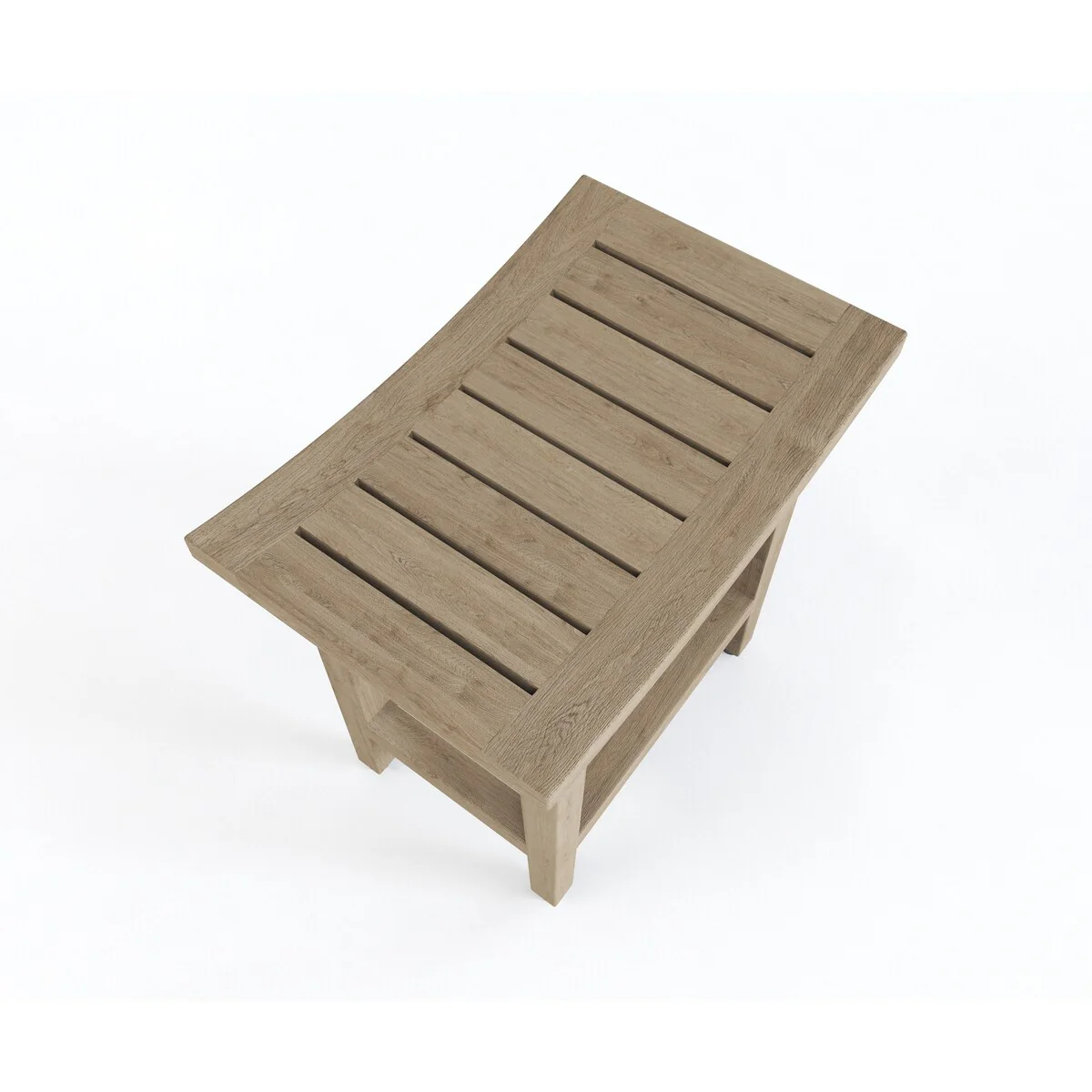 Ditch other materials and rejuvenate your space with teak!This OptiAREA space saving teak bath bench is a fantastic choice for any space. The compact design of this teak shower bench allows for both functionality and convenience, and includes a handy shelf for additional storage space.ConvenientSleek profileSafe in wet/humid conditionsThis teak shower seat also features adjustable rubber padded feet for safety and stability in any location! Naturally water-resistant, the teak shower stool is suitable for use both indoors and outdoors. Stainless steel hardwareIndoor/outdoor useWeather-resistantOur teak wood is all sustainably harvested and environmentally friendly, and includes stainless steel hardware for added durability. We offer a 30-day satisfaction guarantee and five year warranty on all of our products!(Some assembly required)