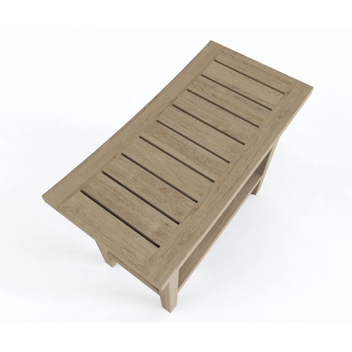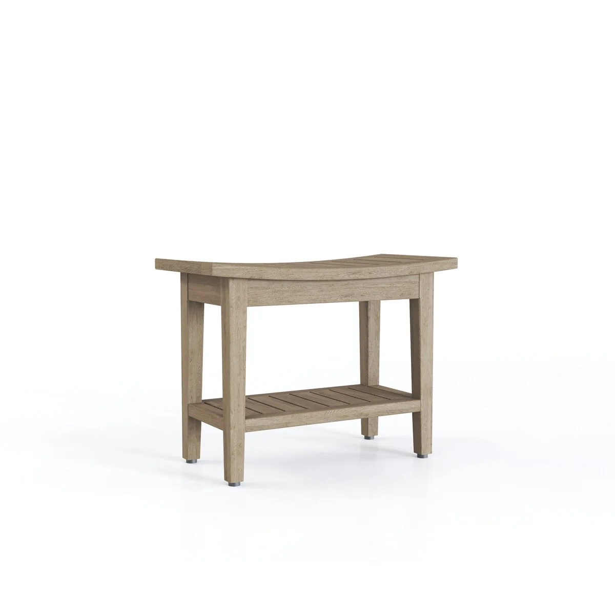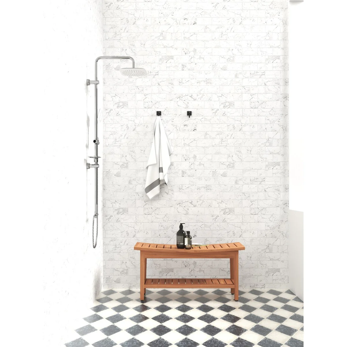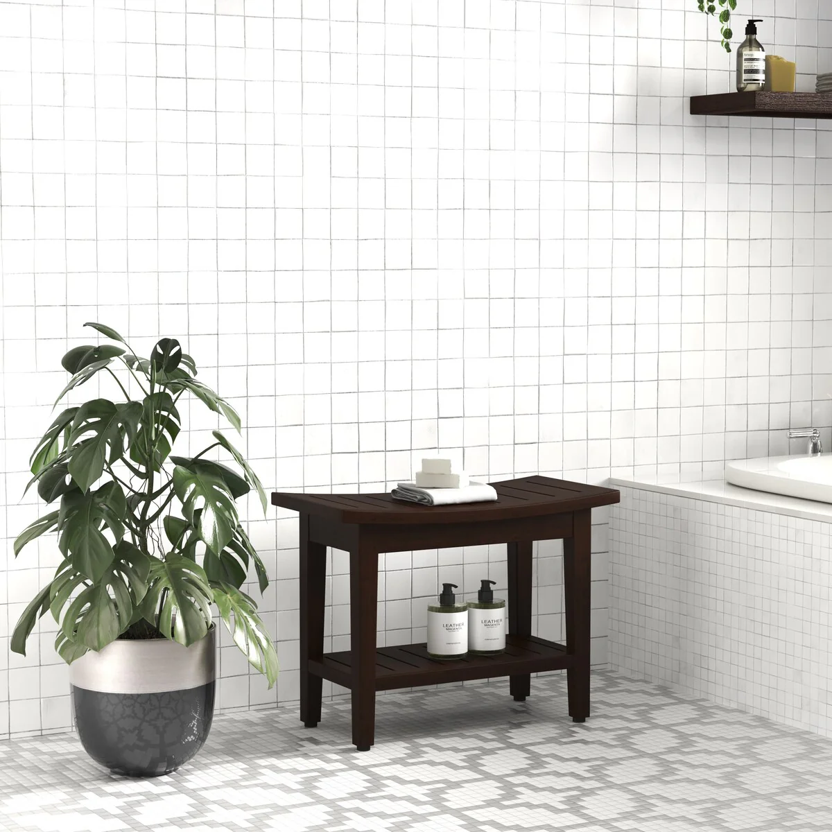 Ditch other materials and rejuvenate your space with teak!This OptiAREA space saving teak bath bench is a fantastic choice for any space. The compact design of this teak shower bench allows for both functionality and convenience, and includes a handy shelf for additional storage space.ConvenientSleek profileSafe in wet/humid conditionsThis teak shower seat also features adjustable rubber padded feet for safety and stability in any location! Naturally water-resistant, the teak shower stool is suitable for use both indoors and outdoors. Stainless steel hardwareIndoor/outdoor useWeather-resistantOur teak wood is all sustainably harvested and environmentally friendly, and includes stainless steel hardware for added durability. We offer a 30-day satisfaction guarantee and five year warranty on all of our products!(Some assembly required)