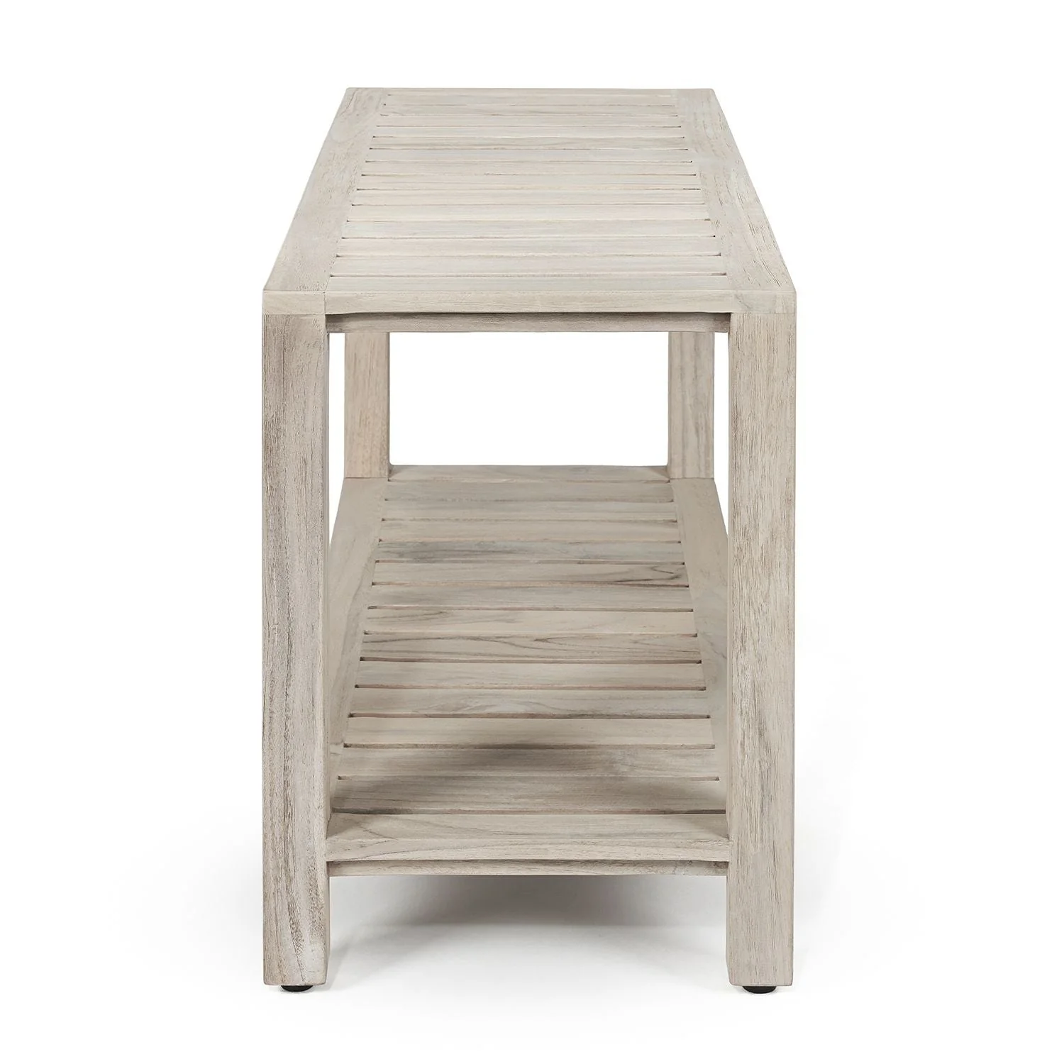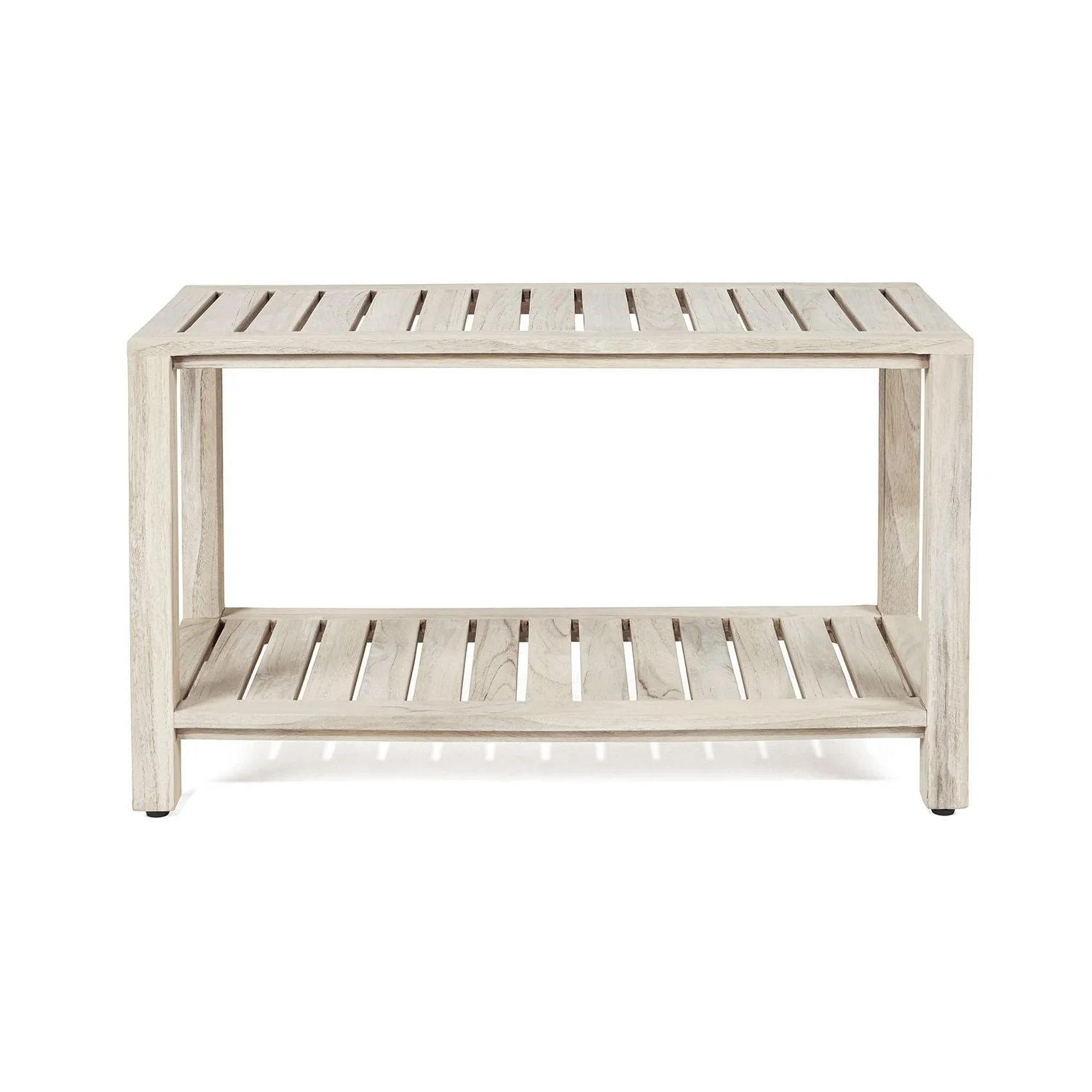 - Crafted from premium Indonesian teak wood with a rustic gray finish, this shower bench from TeakCraft is built for durability and superior quality, evident in its meticulous attention to detail.