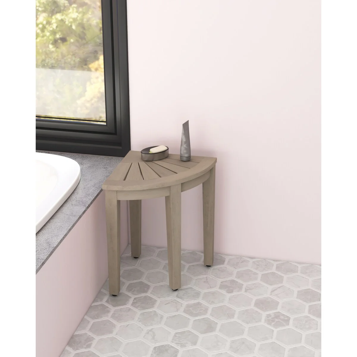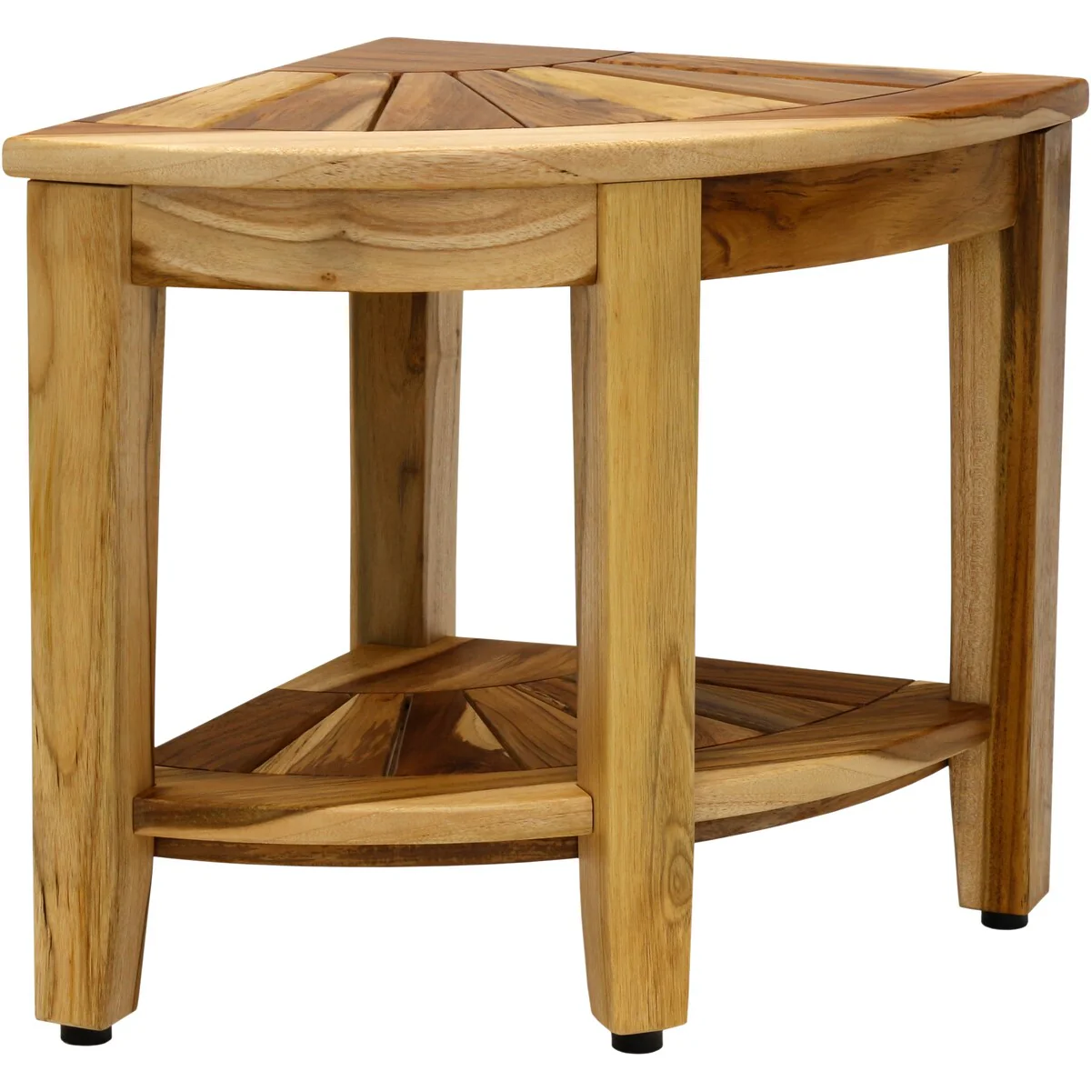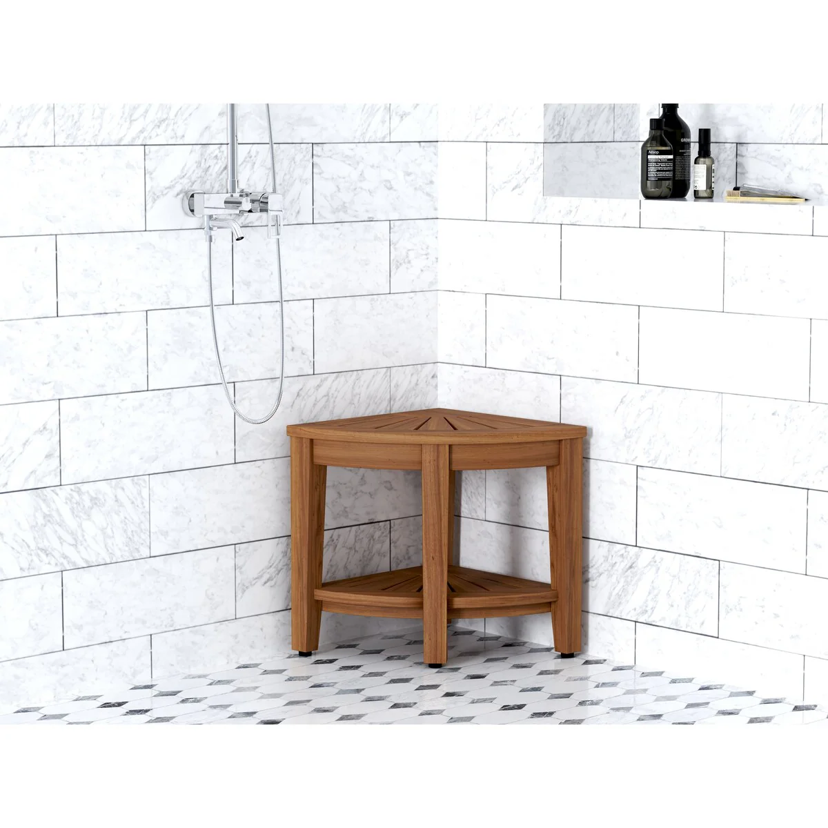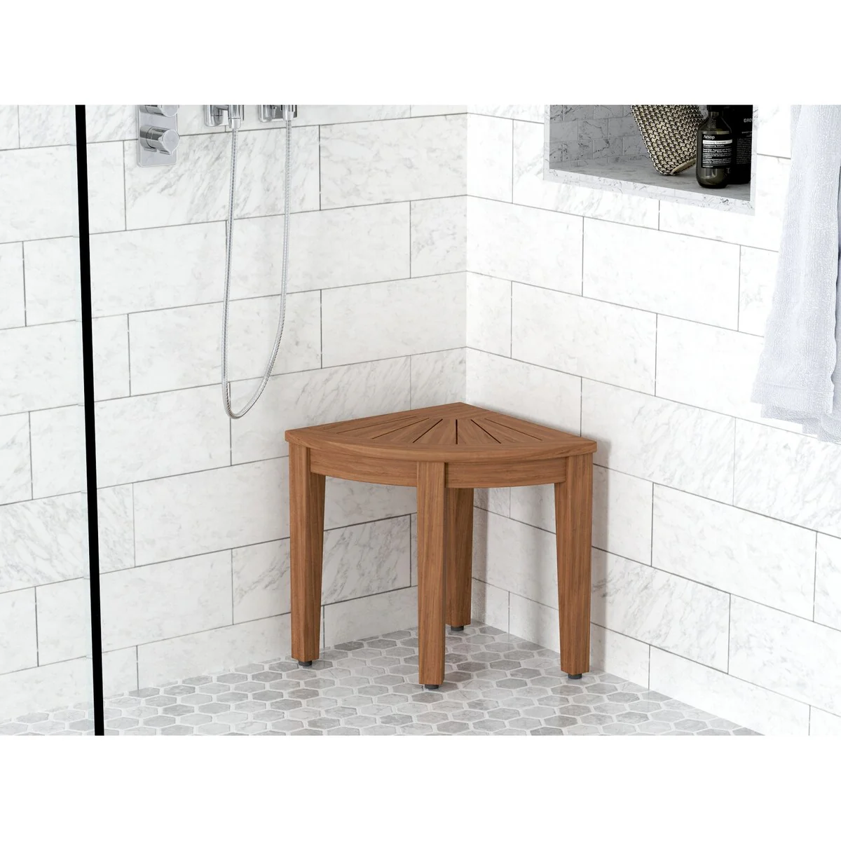 Invoke the richness of our corner teak shower bench!This gorgeous teak shower stool from our Kai™ collection was handcrafted using our unique, space-saving OptiAREA™ design, and was made to fit perfectly into your shower corner. Teak is naturally water resistant and durable, which makes this teak corner shower seat ideal for use as a teak shower bench or a lovely patio seat.Natural teak colorPolished finishCorner-styleYour teak shower seat includes all stainless steel hardware, plus fully adjustable stainless steel and rubber feet for safety and stability. We are so confident that you will love this Teak Corner Shower Seat that we offer a 30 day satisfaction guarantee and 5 year warranty on all of our products!