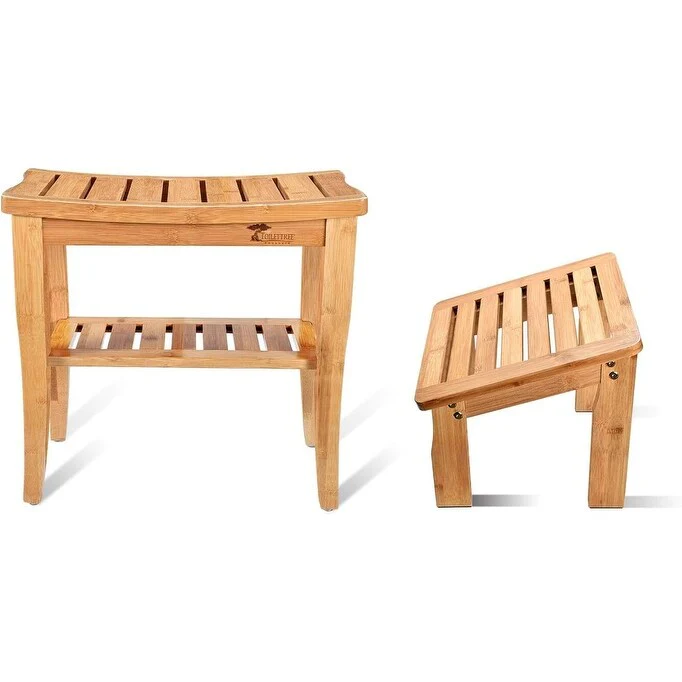 ToiletTree Products Deluxe Wooden Bamboo Shower Seat Bench with Underneath Storage Shelf and Foot Stool