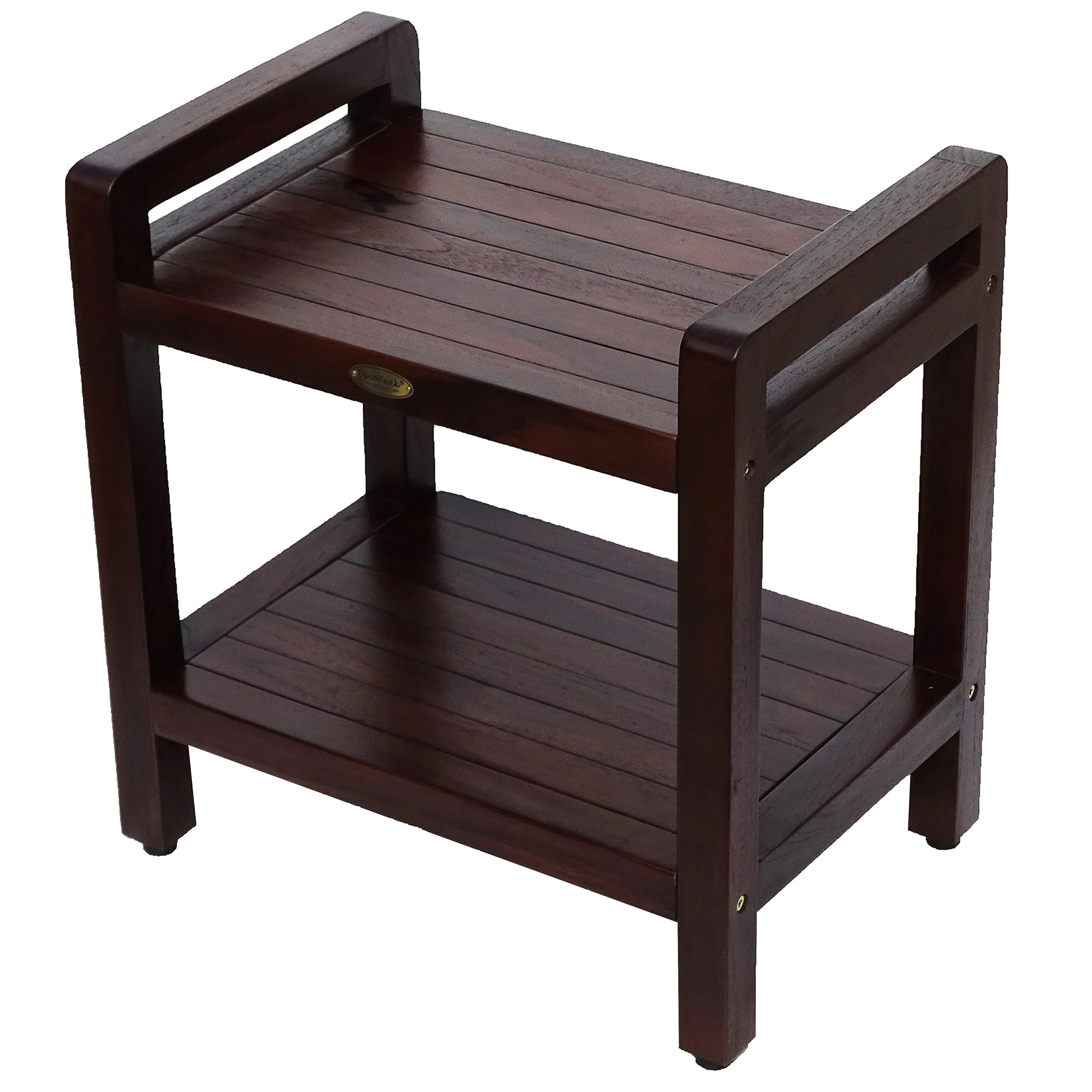 DecoTeak Eleganto 20 Solid Teak Shower Stool With LiftAide Arms And Shelf - WoodLand Brown Finish
