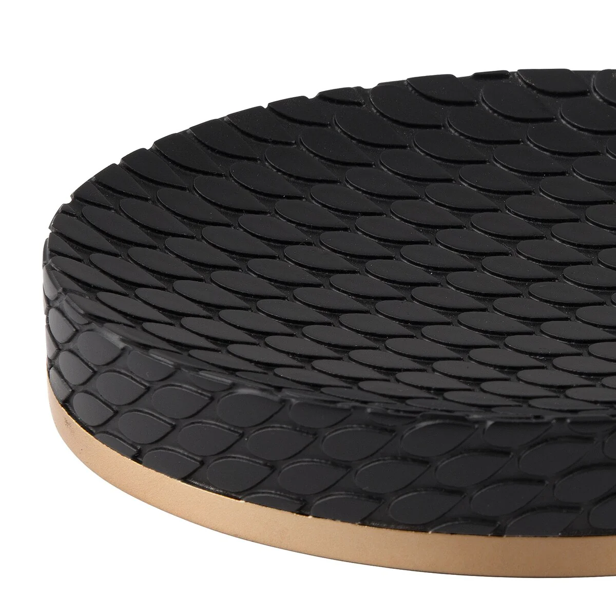 Make a dramatic statement in your bathroom with the Amal Soap Dish by Allure Home Creation. This global inspired dish is made of durable resin. The oval shape with sloped interior of this stylish piece features intricate embossed detailing in a rich black finish accented with a brushed gold base. This versatile piece can be used to hold a standard size bar of soap or as a convenient spot to place your jewelry or other trinkets. This eye-catching accessory will add bold texture and sophisticated interest to your room. Use alone or coordinate with other matching pieces in the Amal Bath Accessory Collection. Hand Wash, Spot or Wipe Clean.