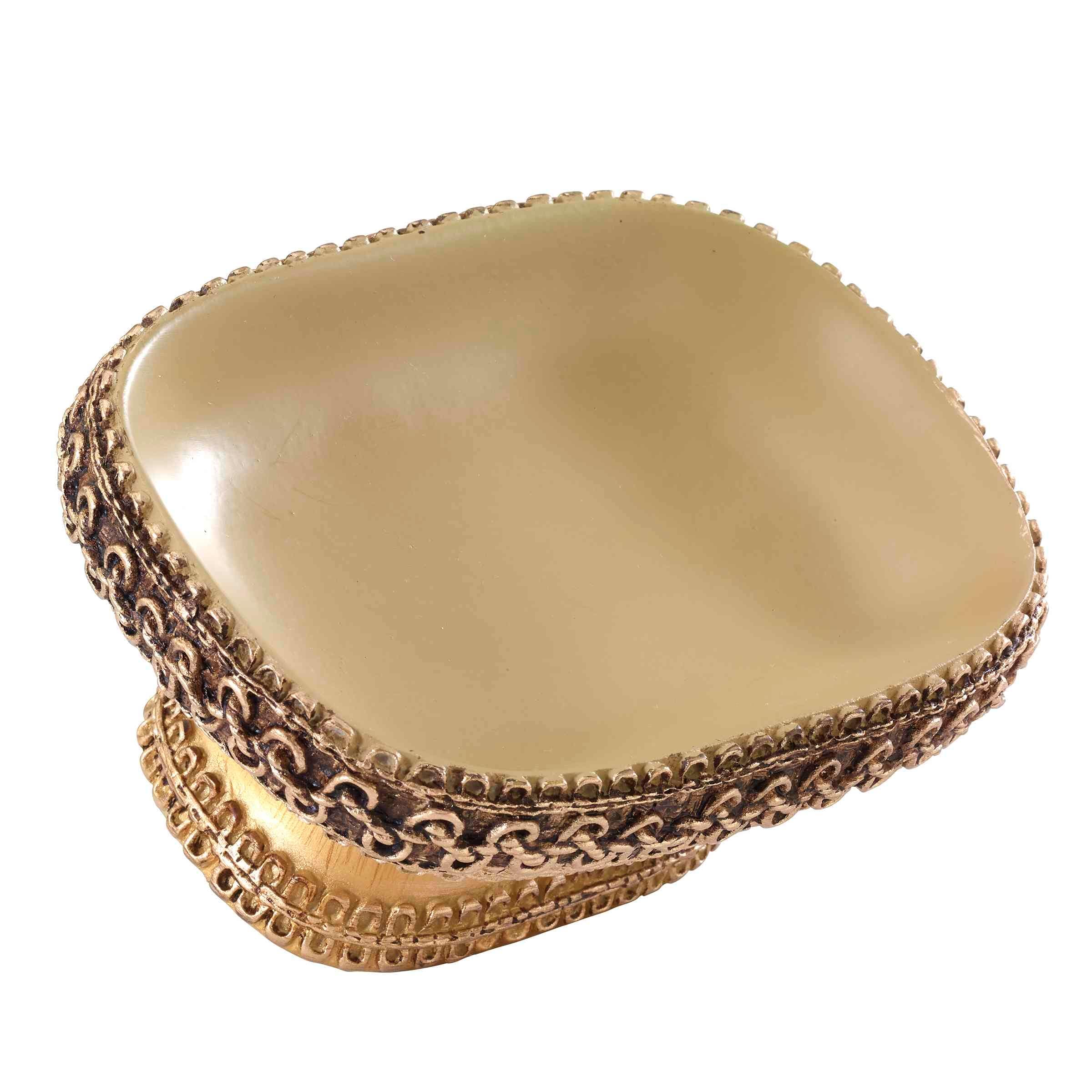 The Avanti Braided Medallion Gold Soap Dish is a figural pedestal with a rattan top, textured gold base and coordinating braid at the top and bottom. Made of durable hand-painted resin for easy care and long life. Coordinating shower curtain, towels, accessories and rug available.