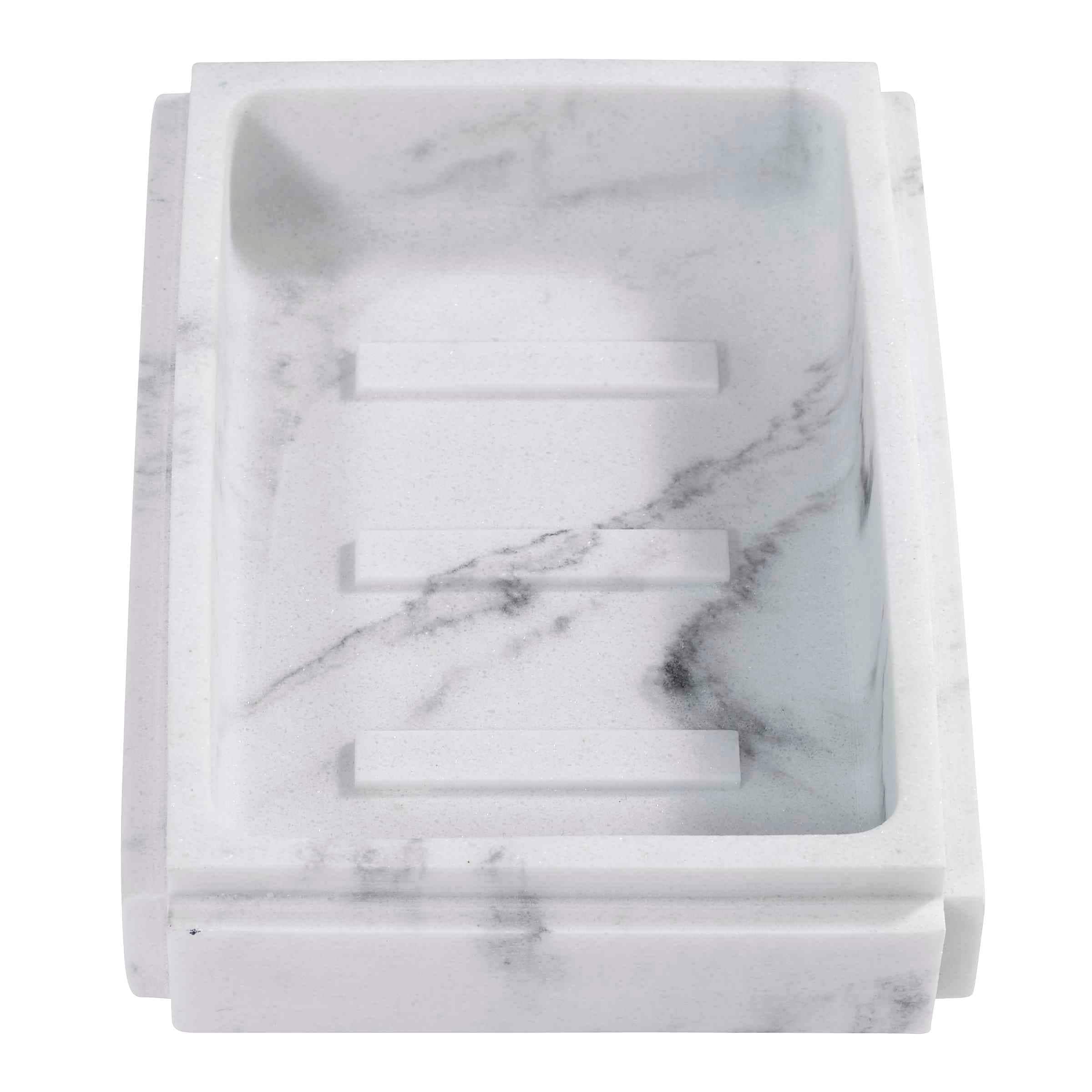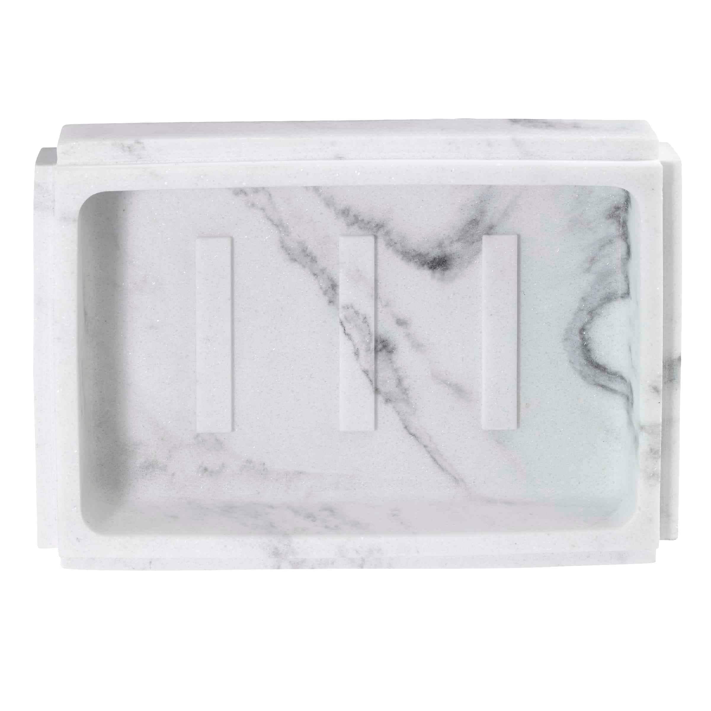 The Avanti Catania Soap Dish features a grey and white marble look in a contemporary, geometric shape. With its beveled edges that give it a crisp, clean look, this piece adds a level of style and sophistication to any bathroom, kitchen or office. Made of durable resin for long-lasting use.