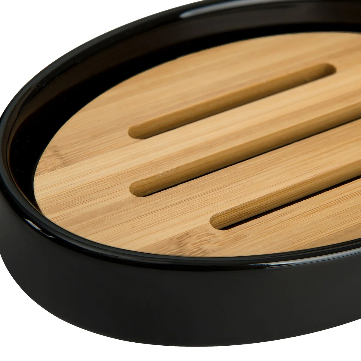 Add an updated contemporary touch to your bathroom with the Haven Soap Dish by Allure Home Creation. The oval shape of this minimalist design is featured in a rich shiny black finish with a slotted light bamboo insert inset into the base. This dish is made of ceramic with a raised edge. This versatile piece can be used to hold a standard size bar of soap or as a convenient spot to place your jewelry or other trinkets. This classic accessory will dress your bathroom with sophisticated style. Use alone or coordinate with other matching pieces in the Haven Bath Accessory Collection. Hand Wash, Spot or Wipe Clean