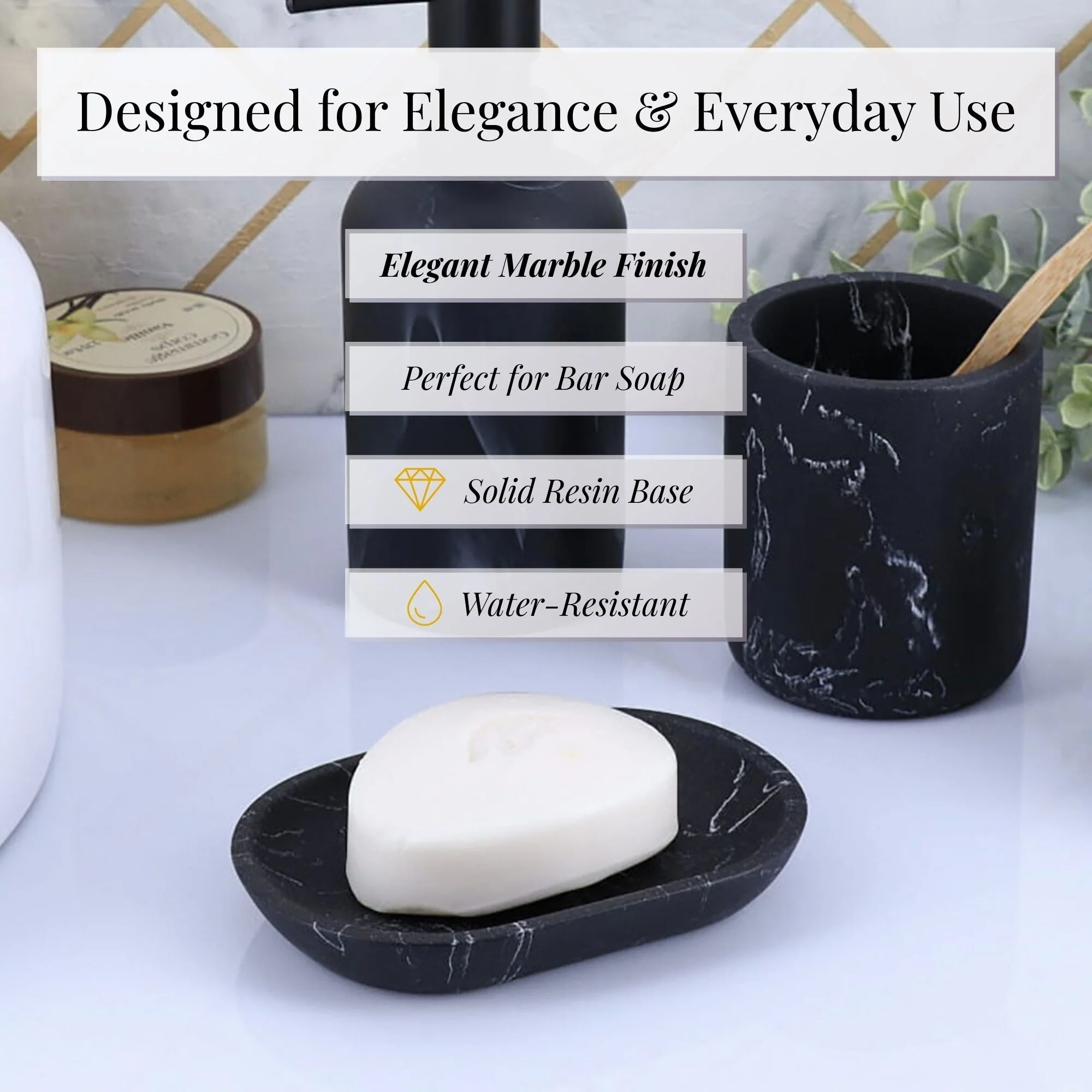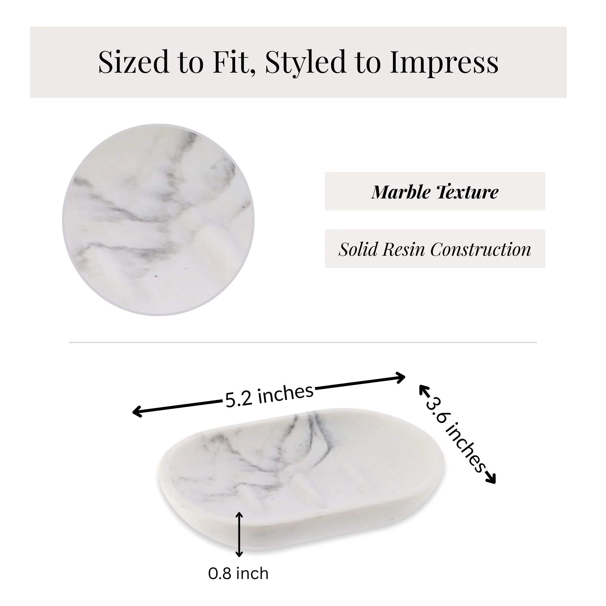 - DURABLE RESIN: Made of sturdy resin, this soap holder offers the elegant look of marble stone with lightweight strength, adding a luxurious touch to any bathroom or kitchen countertop