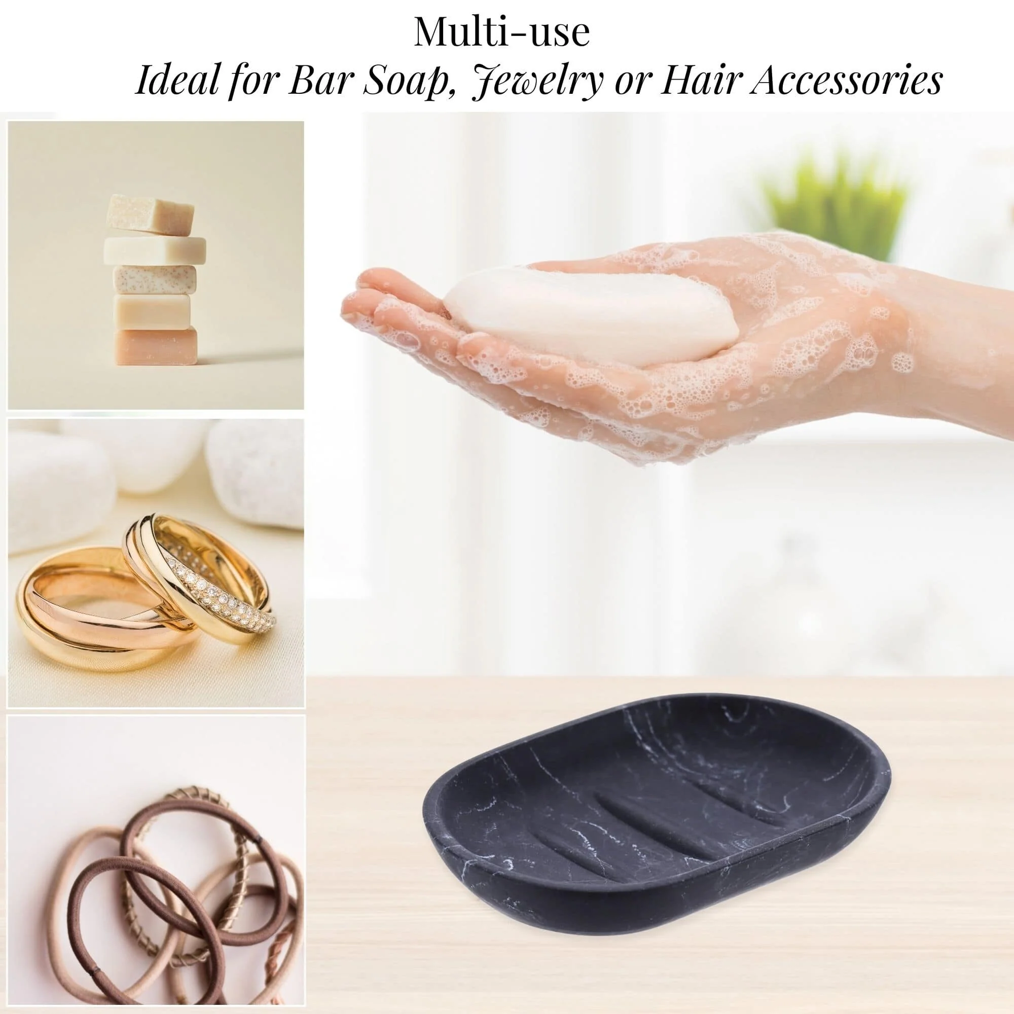 - MULTIPURPOSE HOLDER: Perfect for holding bar soap, jewelry, hair ties or small accessories, this versatile soap tray keeps your essentials organized in style in the bathroom