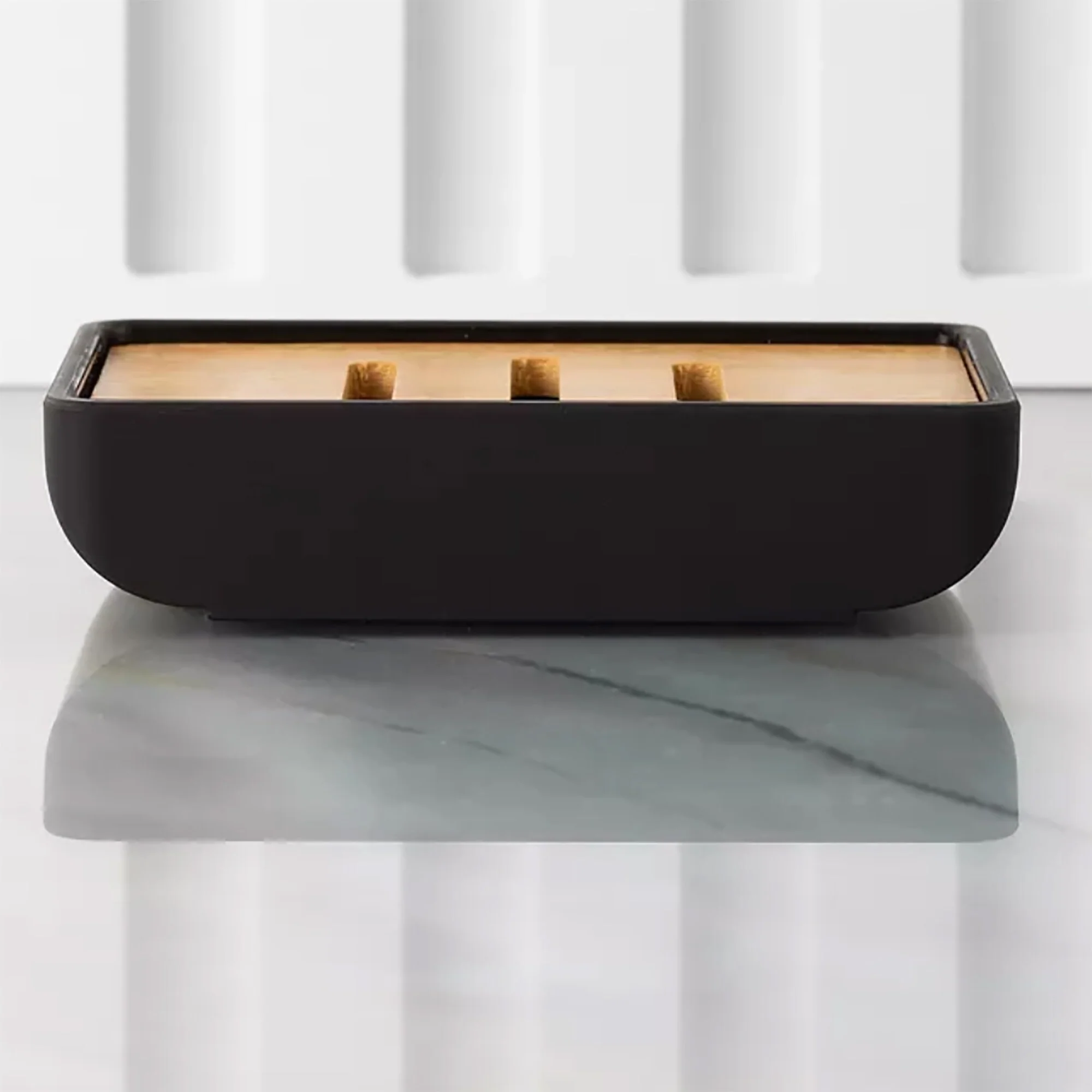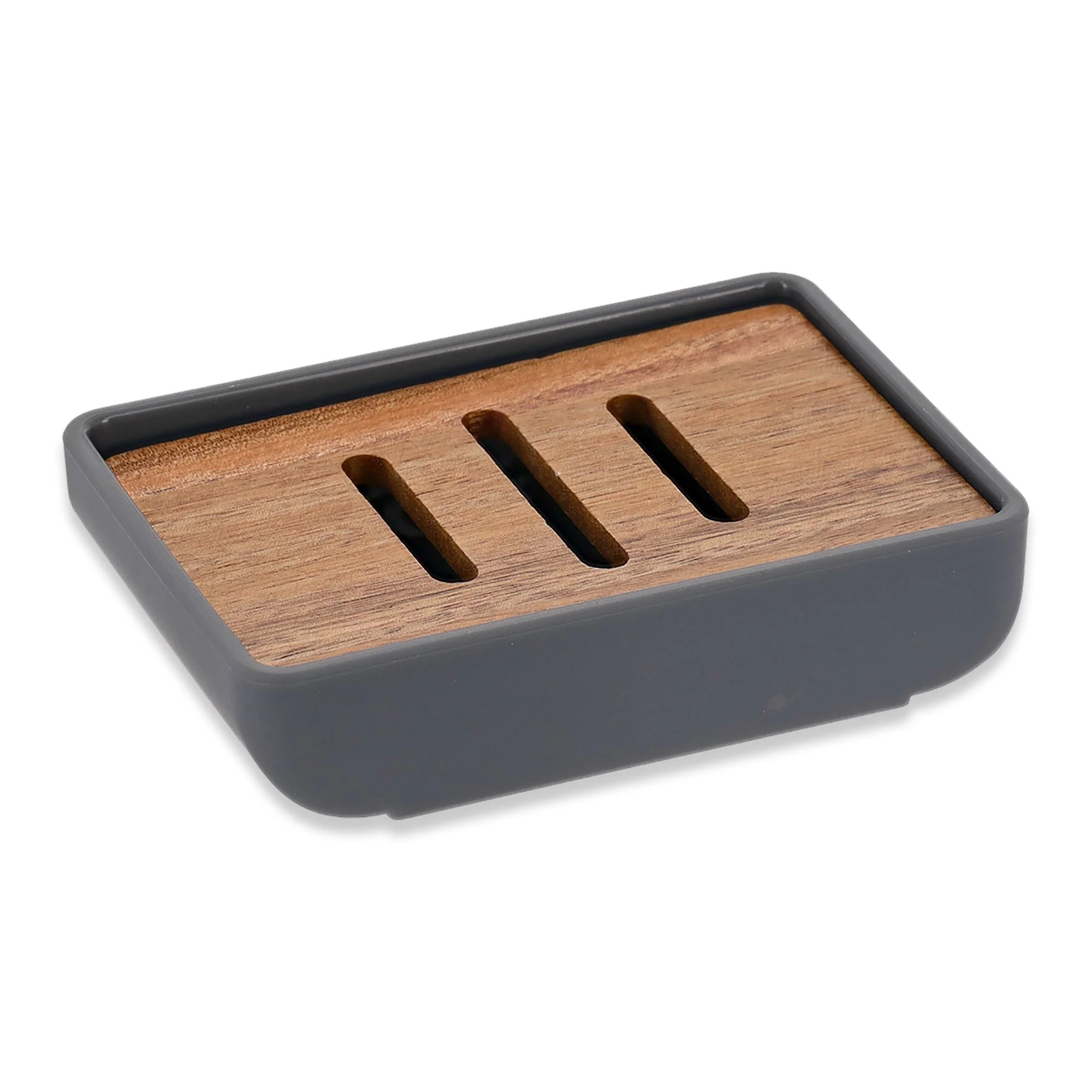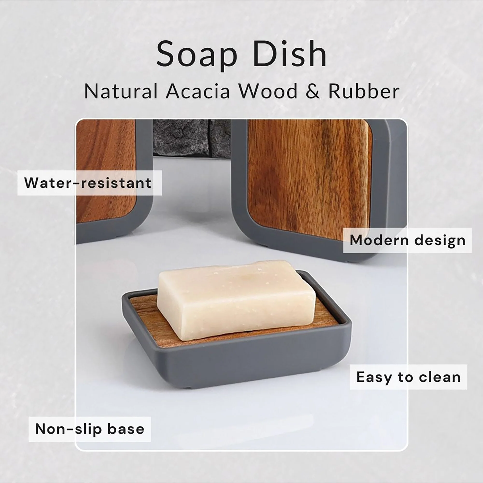 - MODERN AND NATURAL: This soap tray features a rectangular rubber base with wood insert for a contemporary look. Available in black rubber with bamboo or gray rubber with acacia
