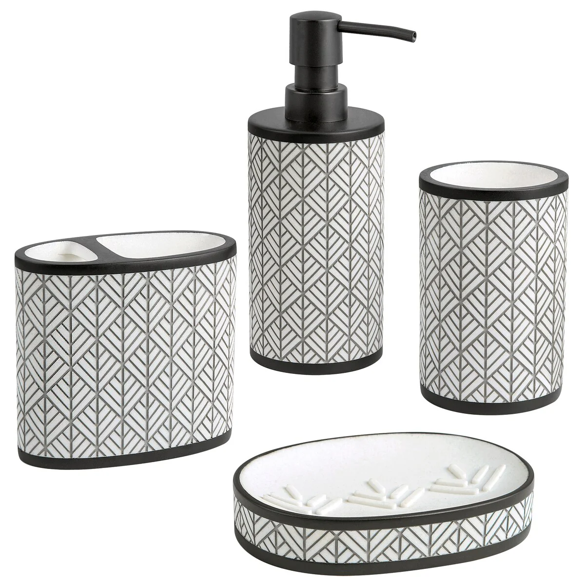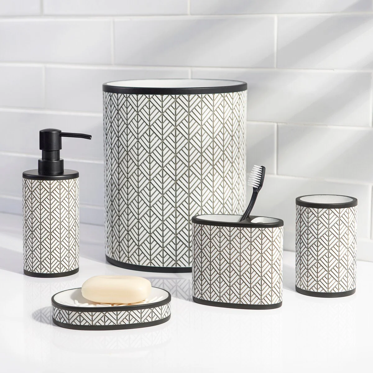 Give your bathroom a stylish update with the Shelby Soap Dish by Allure Home Creation. This oval debossed dish, crafted from resin in charcoal and white highlighted with black trim, features a sleek linear geometric pattern on both the outside and interior. This versatile accessory can be used to hold a standard size bar of soap or as a convenient spot to place your jewelry or other trinkets. This art deco inspired piece will dress your countertop with sophisticated industrialized style. Use alone or coordinate with other matching pieces in the Shelby Bath Collection. Hand Wash, Spot or Wipe Clean.