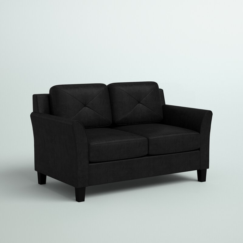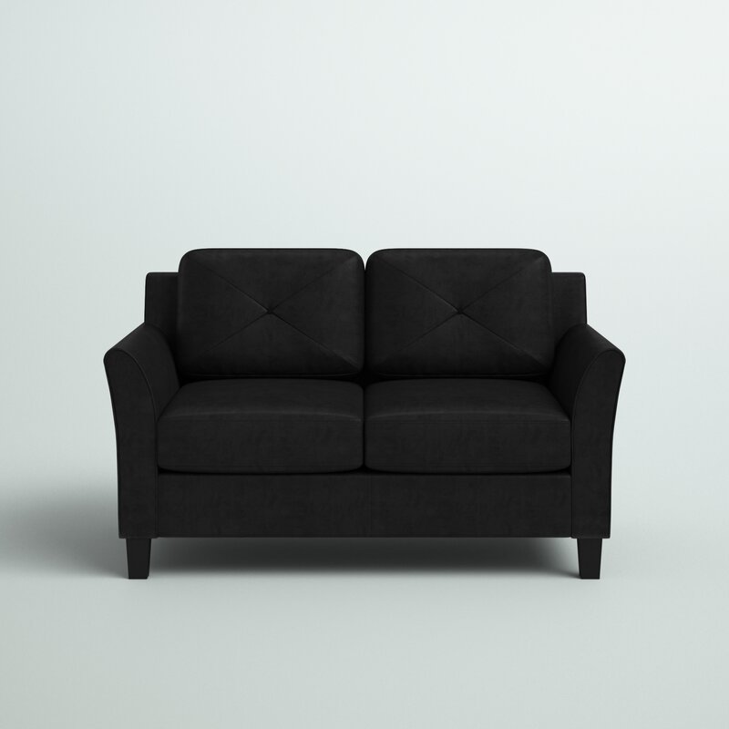 Round out any living room seating group with this loveseat and enjoy a bit of streamlined modern style. It has a solid wood eucalyptus frame, and it rests on black-finished block feet for a sleek, mid-century look we love. Wrapped in a microfiber fabric, this loveseat is filled with high-density foam and coil springs for a balance of padding and stability. Flared arms, welted edges, and diamond button tufting complete this distinctive design. Full assembly is required.