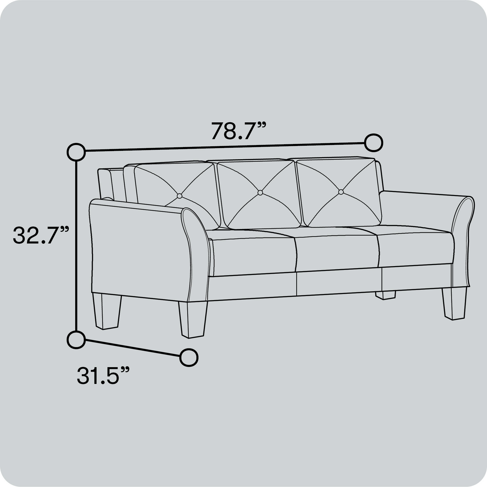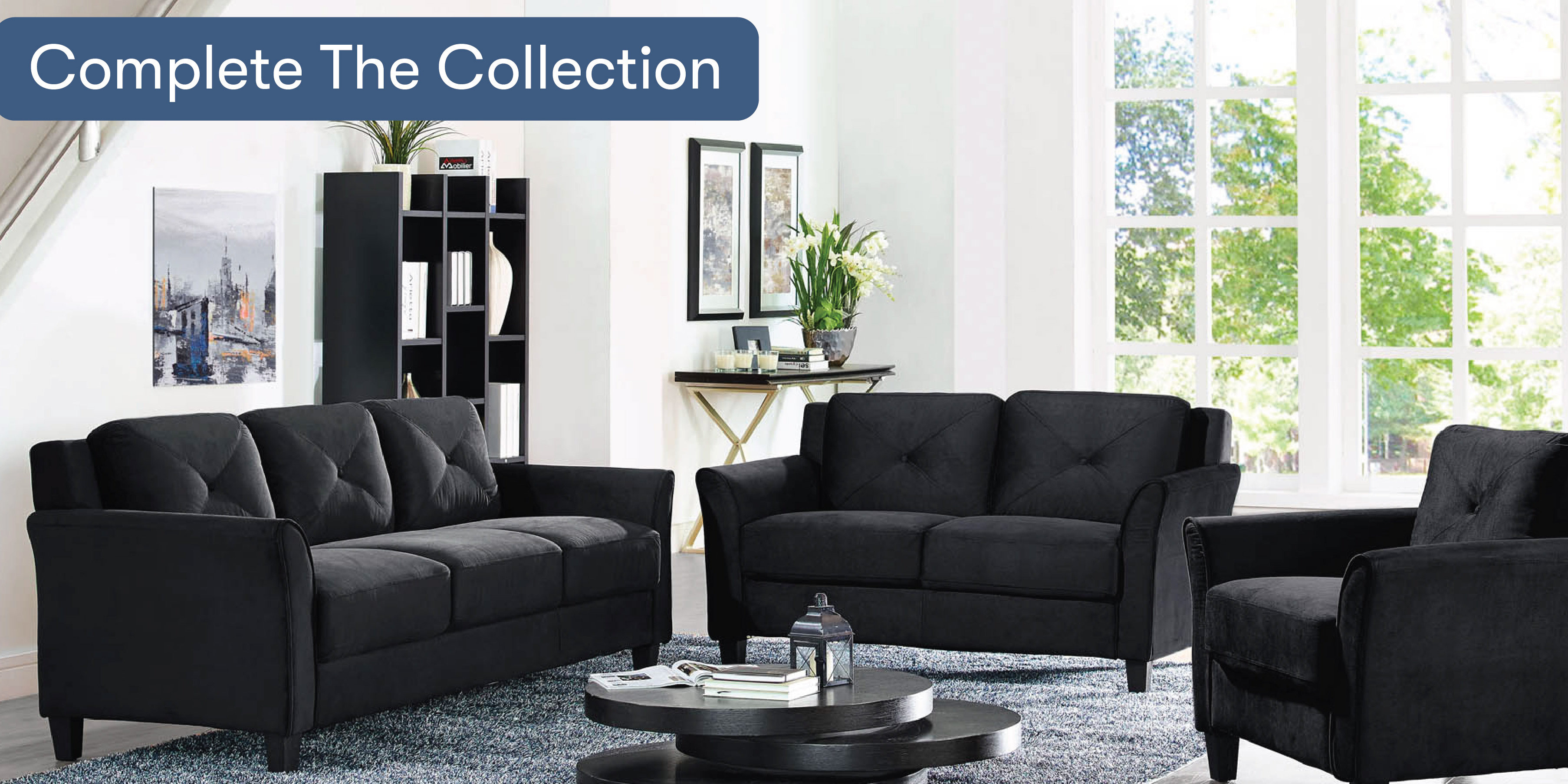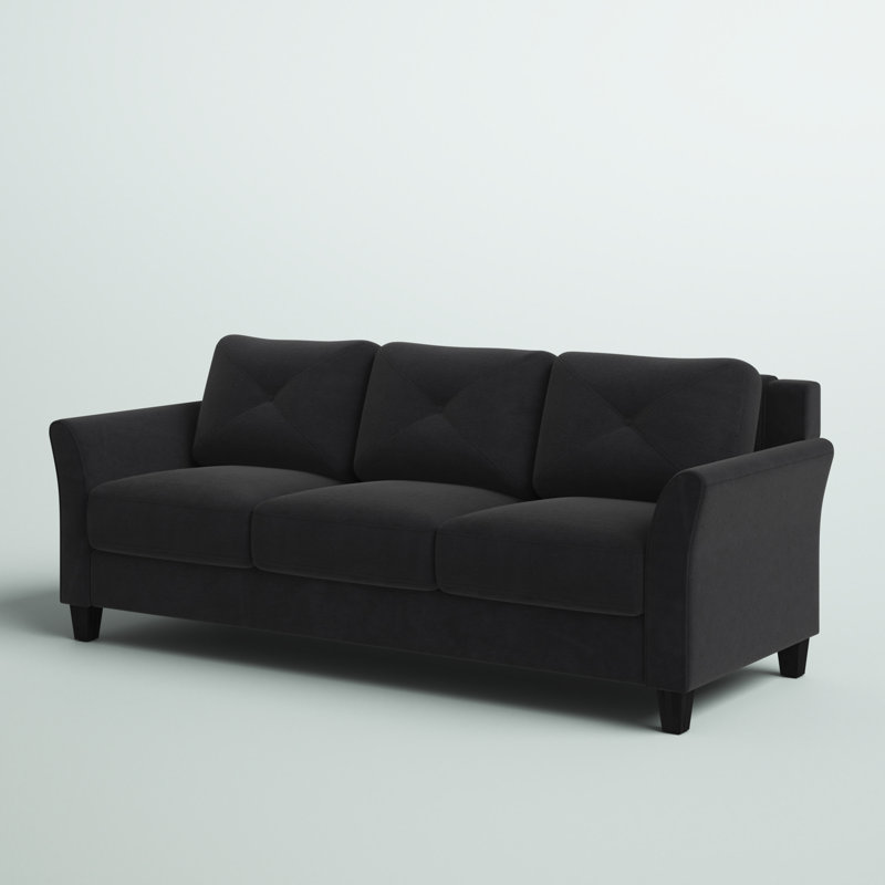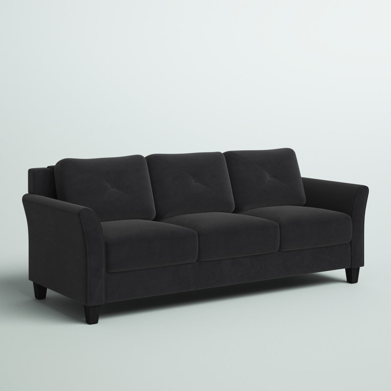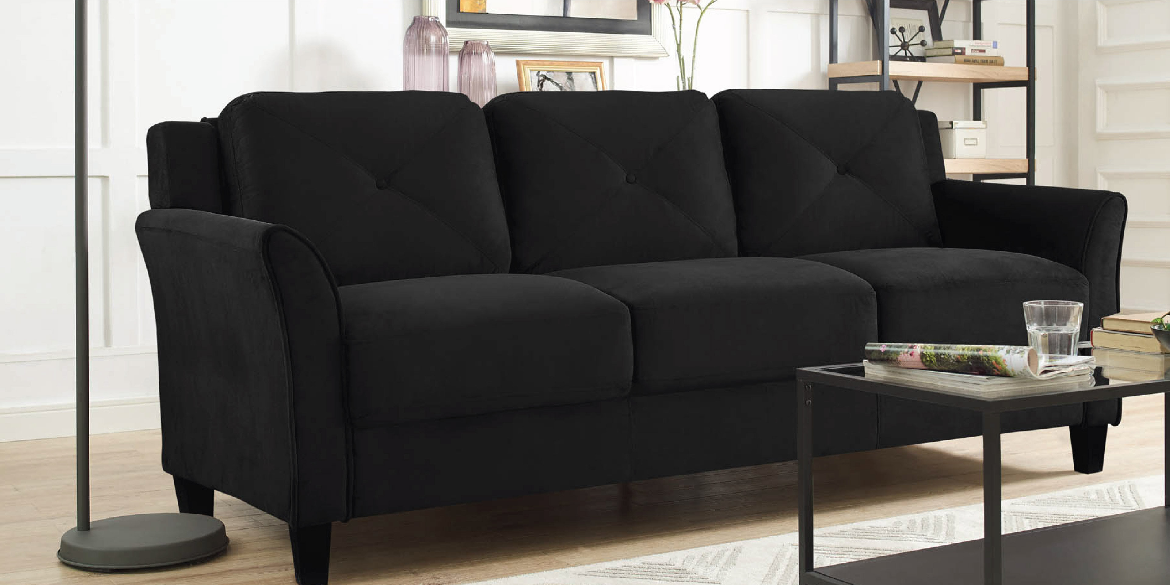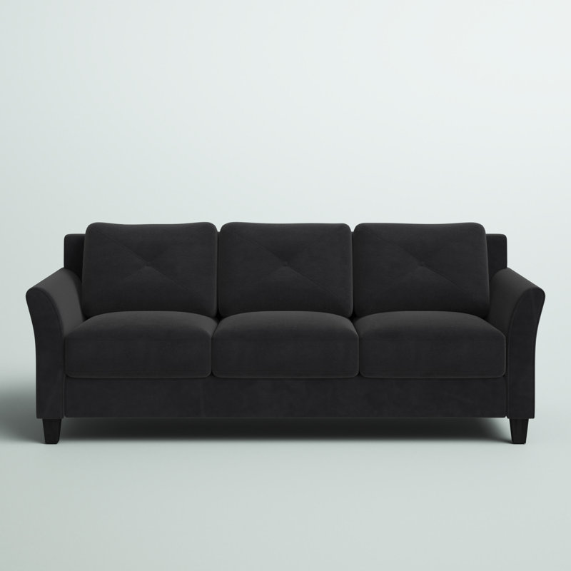 The sofa gives you plenty of space to spread out and relax in your living room or den. It has a solid wood eucalyptus frame, and it rests on tapered black legs for a sleek modern look we love. Wrapped in a matching black microfiber fabric, this couch is filled with high-density foam and coil springs for a balance of padding and stability. Flared arms and tufted back cushions complete this distinctive design. Full assembly is required.