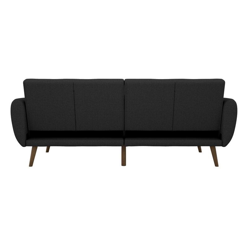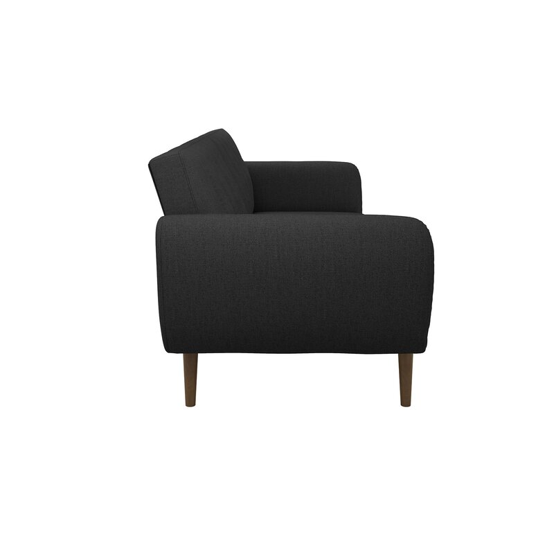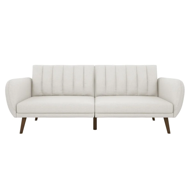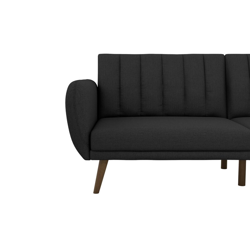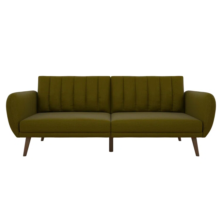 Be embraced by the comfortable cushioning of the product. With its ribbed tufted cushioned back, the product gives your body all the support you need to sit and relax for hours. The combination of curved armrests and slanted legs work together to provide a unique rounded look that stands out. The stylish upholstery adds another element of elegance making this a perfect statement piece for any living space. Designed with a multi-position split-back, the Brittany independently converts between a sitting, lounging, and sleeping position with an easy push-and-pull motion. The futon is also equipped with extra legs that provide extra support for your overnight guests when in a sleeping position. Available in multiple trendy colors that will either add a pop of color to your space or provide a neutral statement piece to build your dã©cor around. Pair with the rest of the collection to get the complete look.