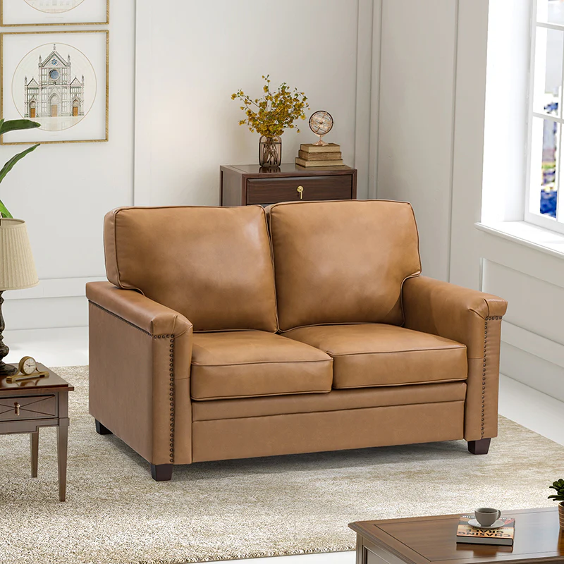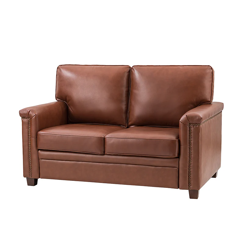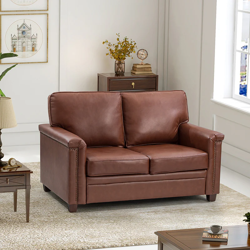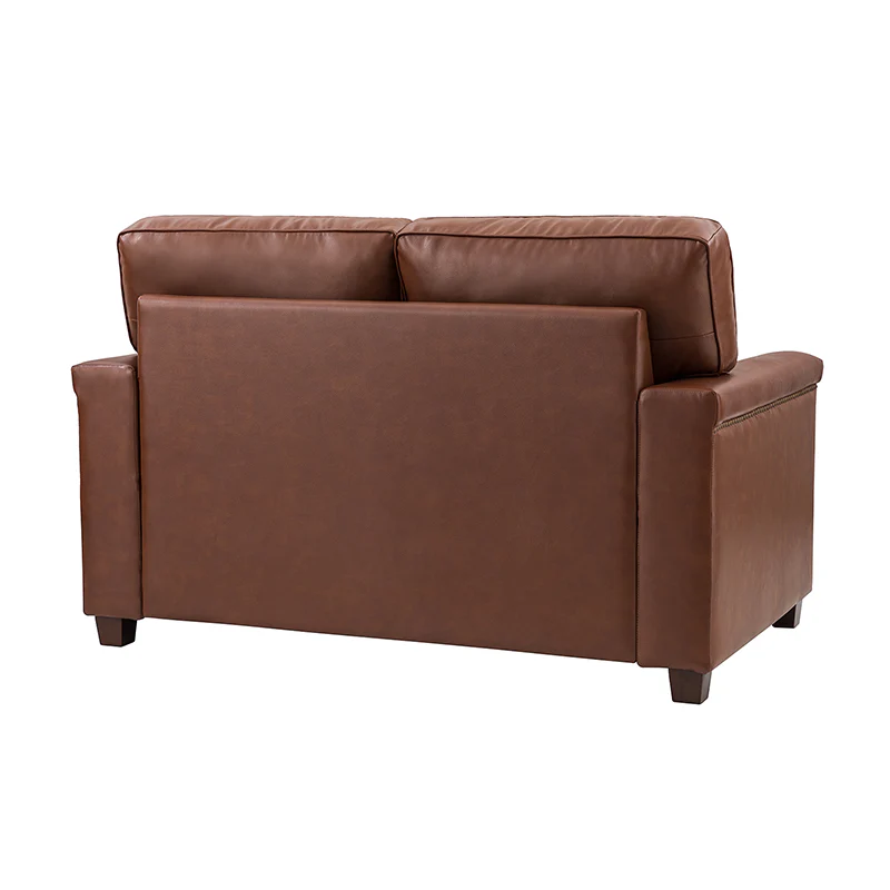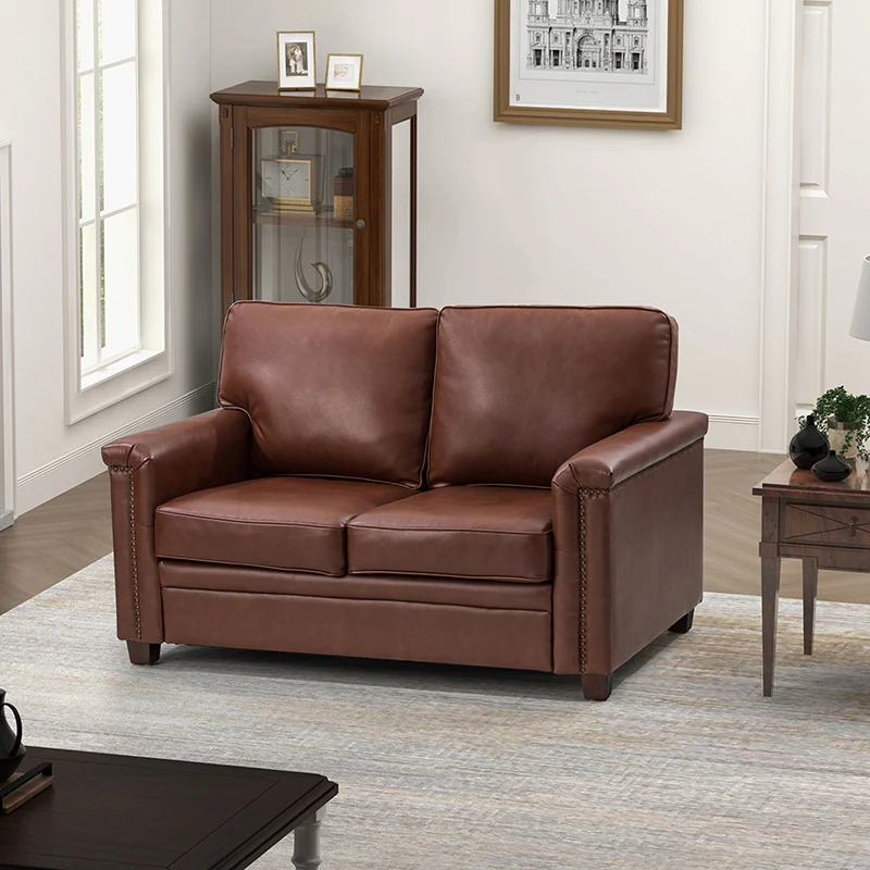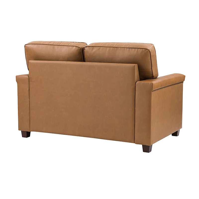 Form meets function in this transitional-style loveseat. It features a sturdy wooden frame and four blocky legs to add a vintage feel to your space. The sofa is also wrapped in refined leather upholstery for a long-lost look and comes in a rich hue that blends with a variety of color schemes. The foam padding gives you extra support whenever you need some time to relax. Quality armrests and cushions round out this classic industrial design. We love how scratch-resistant this loveseat is, making it perfect for homes with pets and kids.