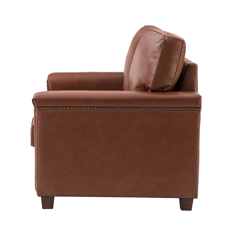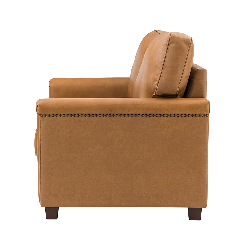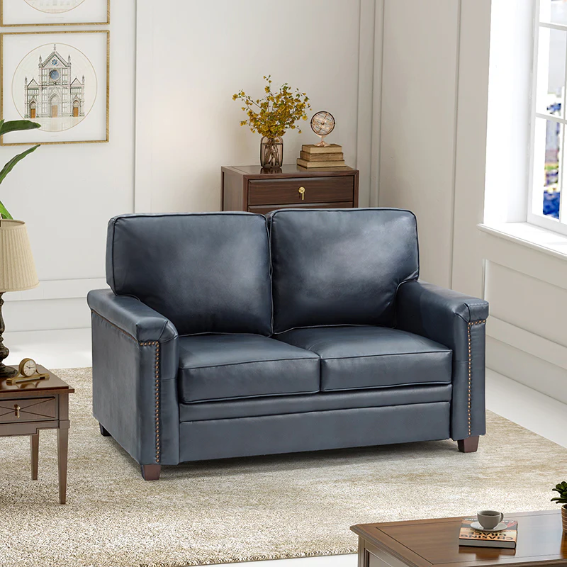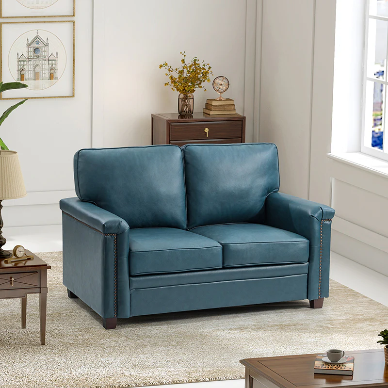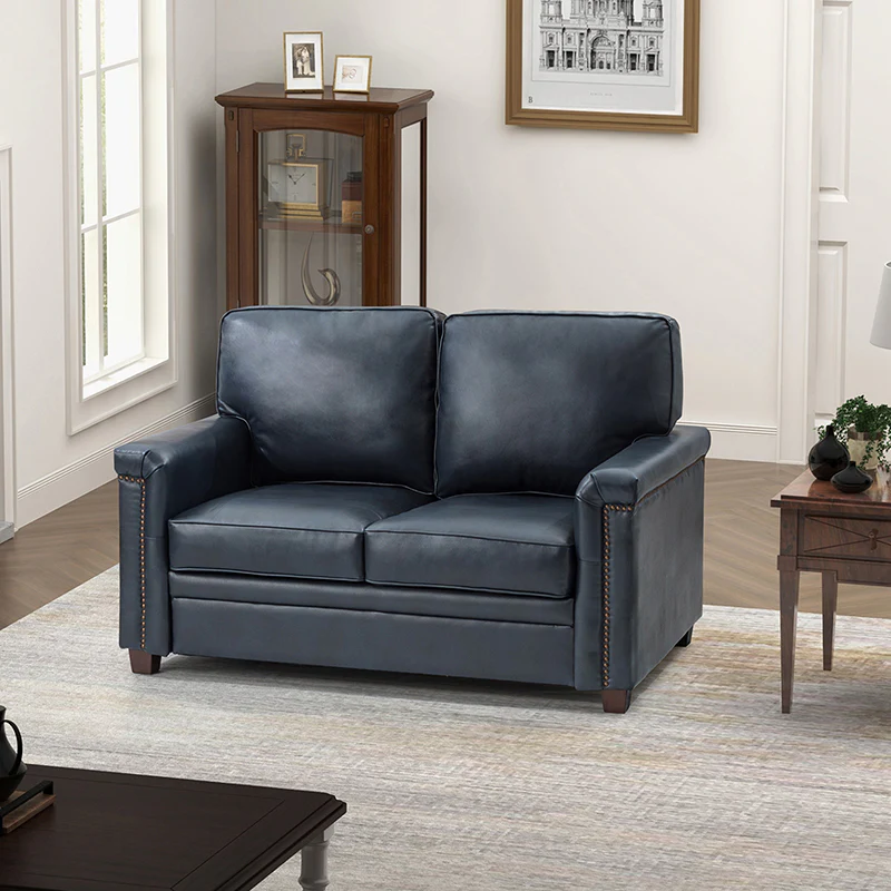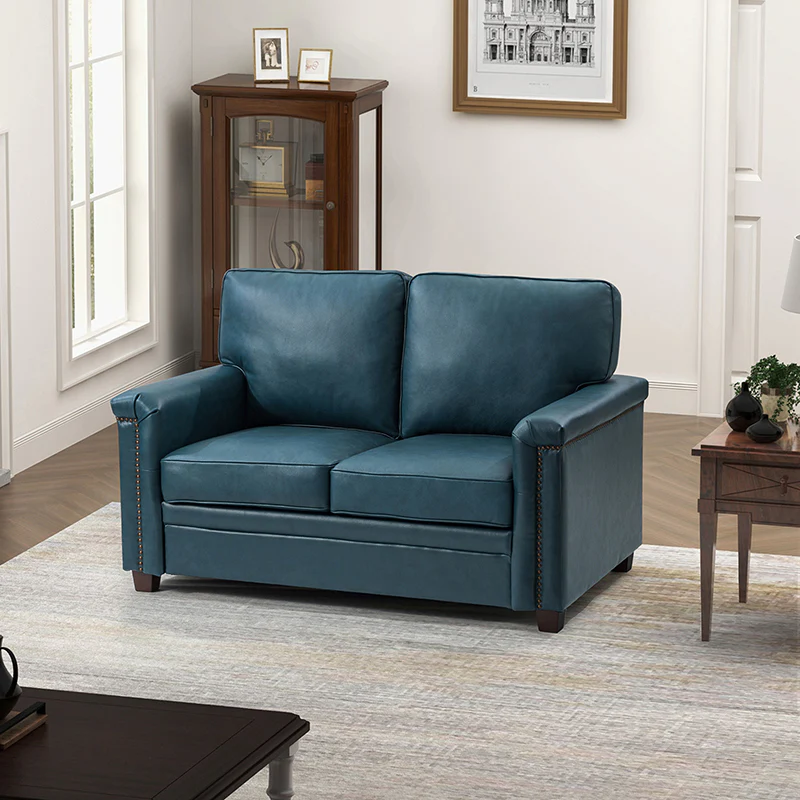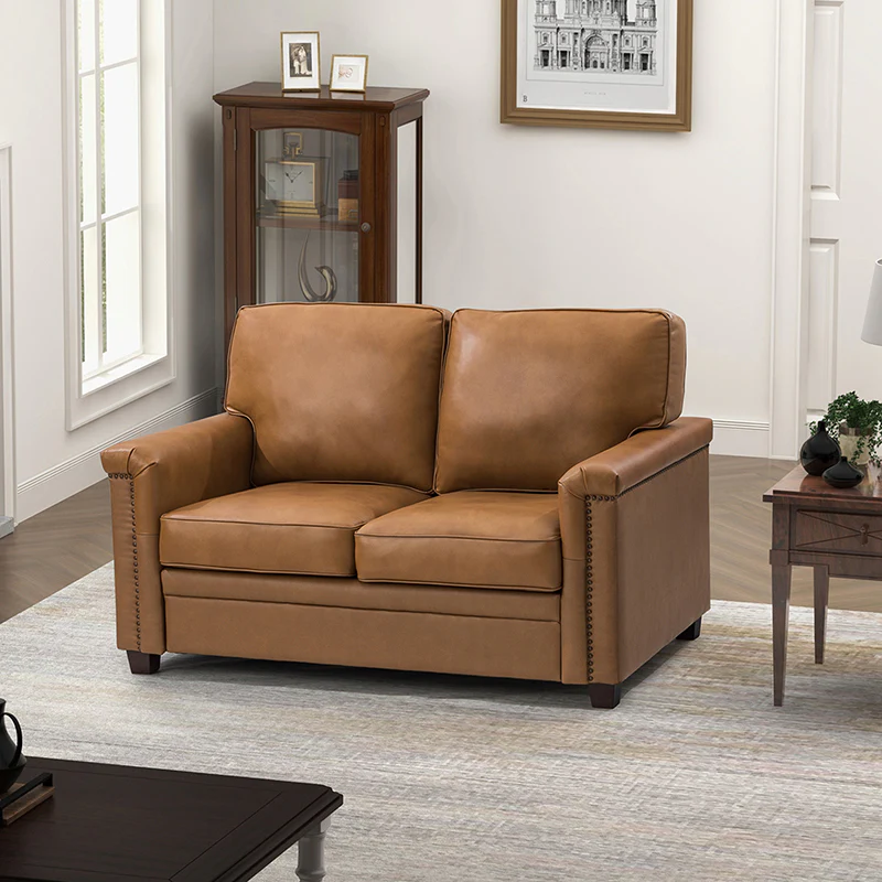 Form meets function in this transitional-style loveseat. It features a sturdy wooden frame and four blocky legs to add a vintage feel to your space. The sofa is also wrapped in refined leather upholstery for a long-lost look and comes in a rich hue that blends with a variety of color schemes. The foam padding gives you extra support whenever you need some time to relax. Quality armrests and cushions round out this classic industrial design. We love how scratch-resistant this loveseat is, making it perfect for homes with pets and kids.