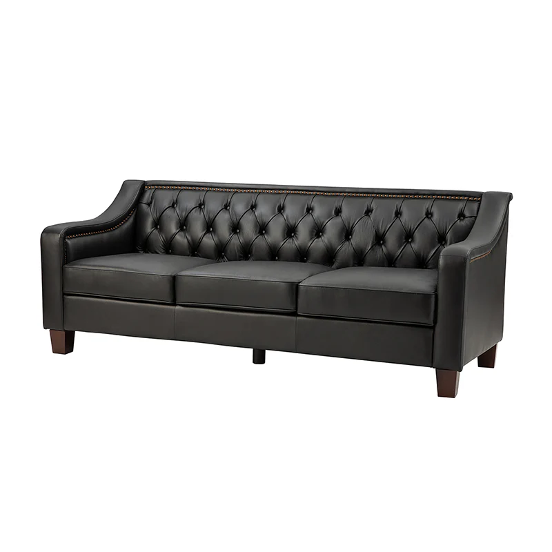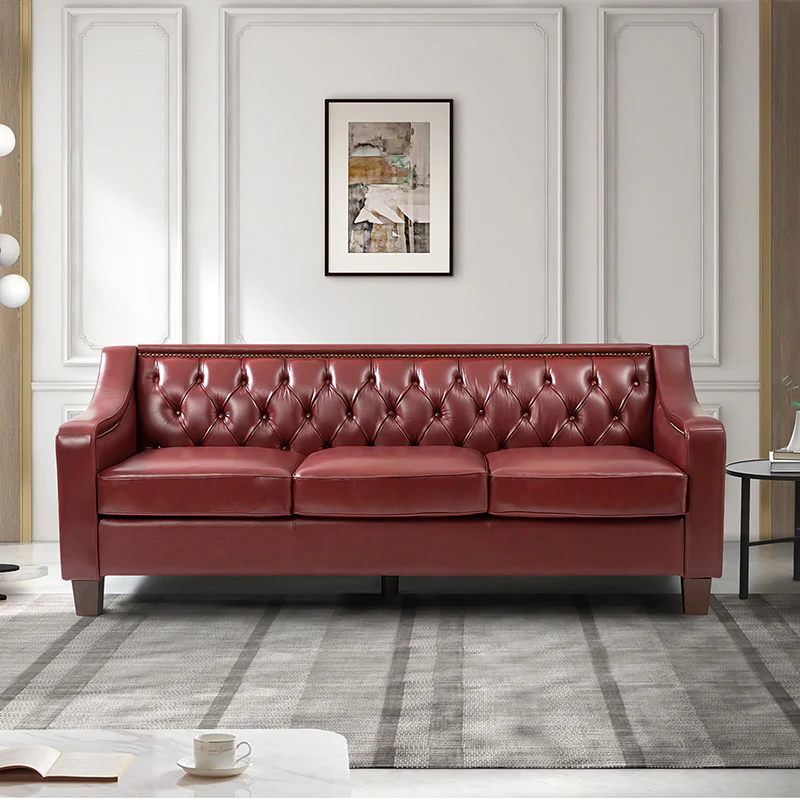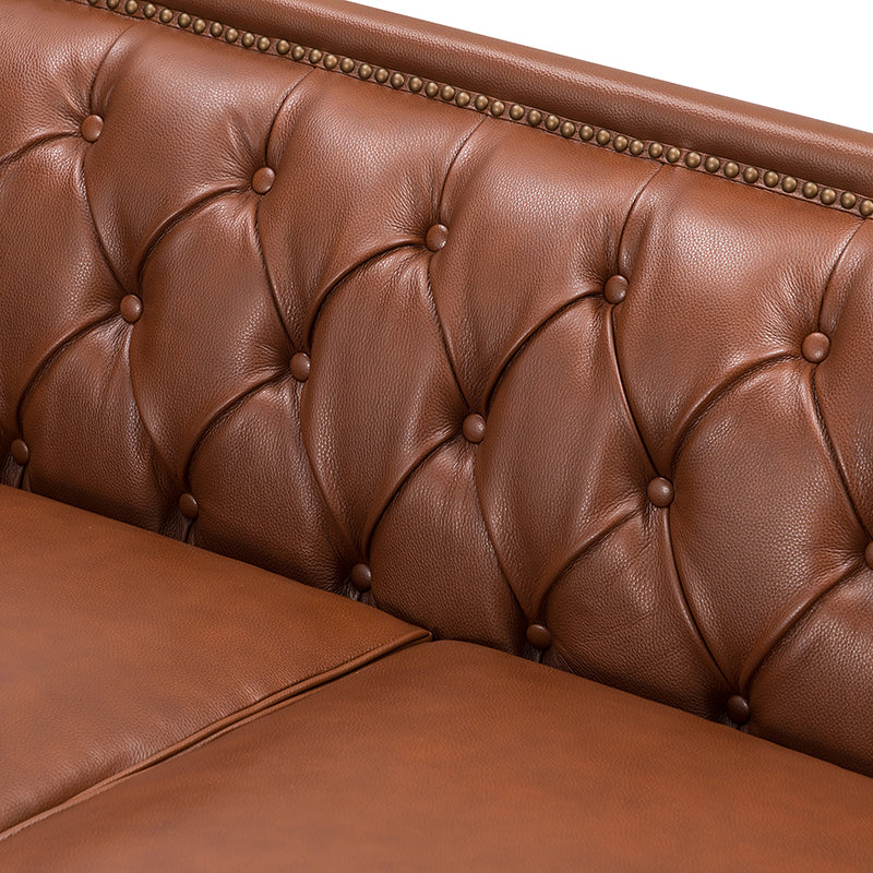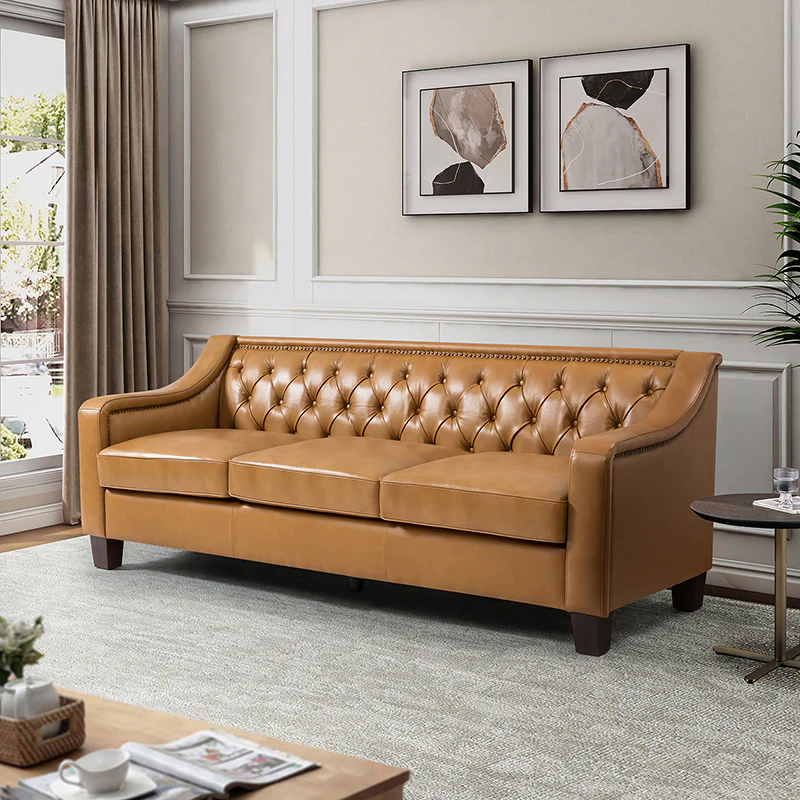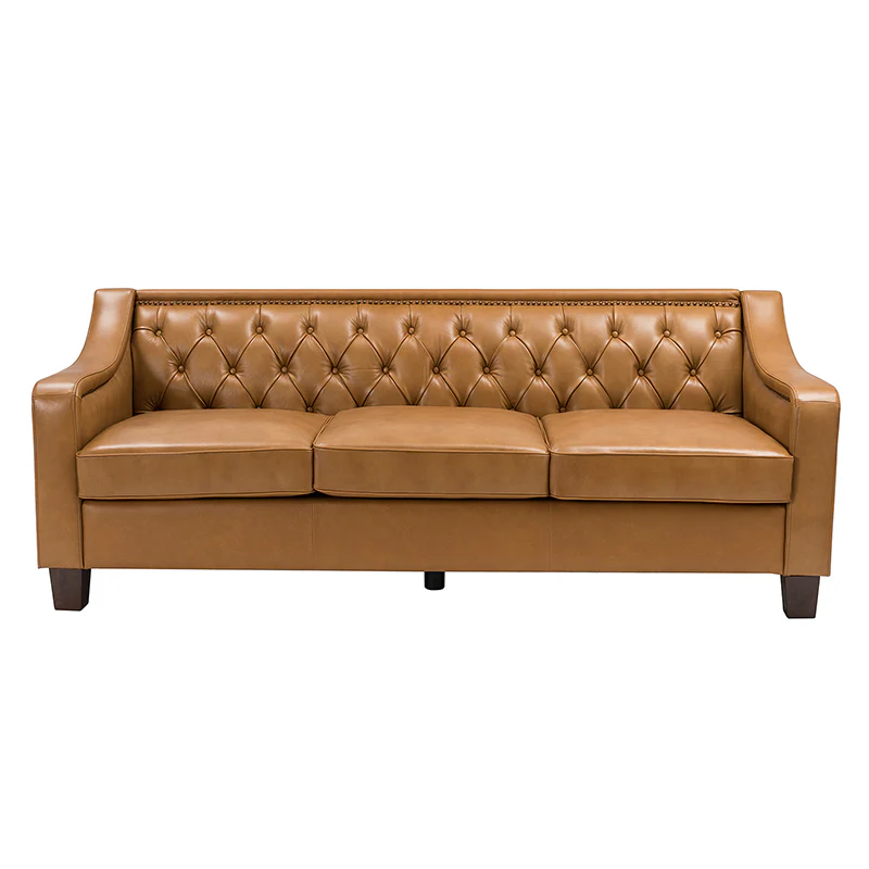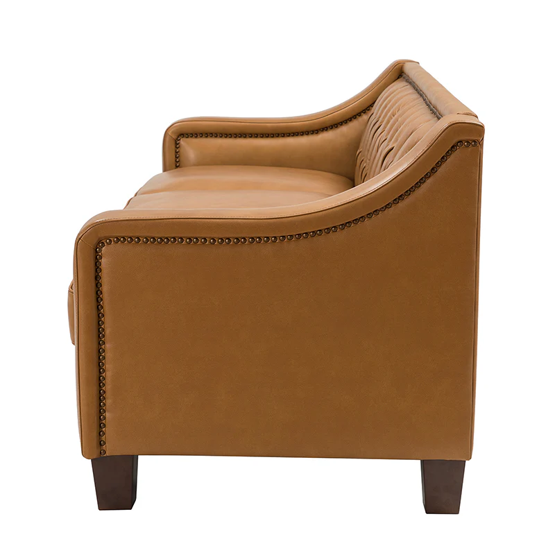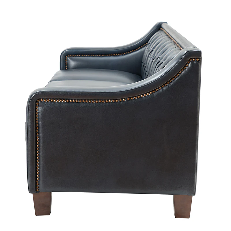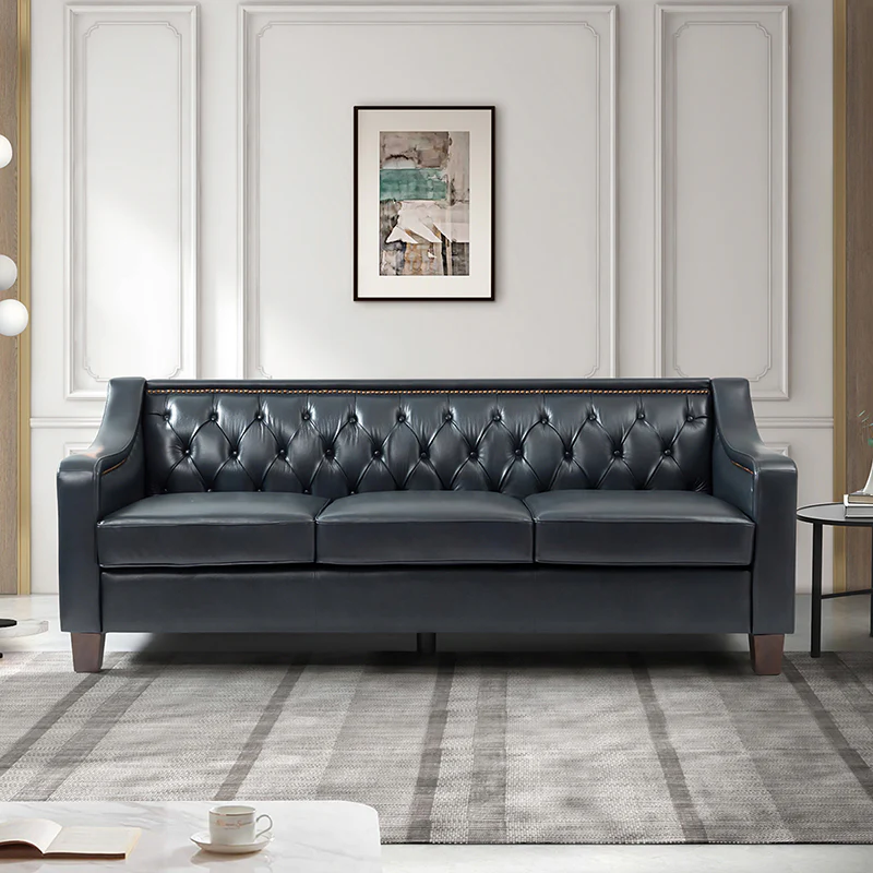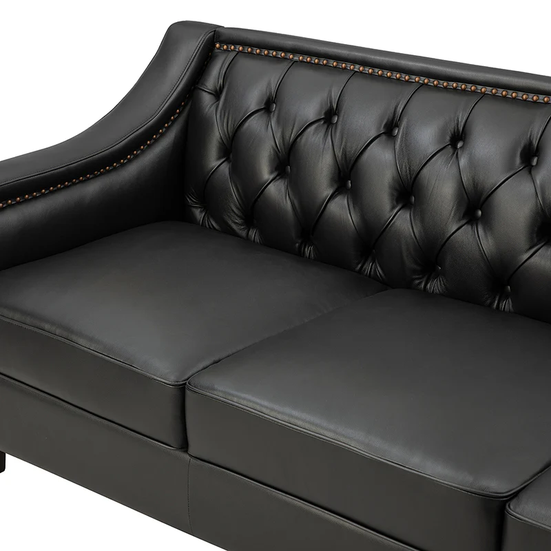 This modern top-grain leather sofa brings contemporary, curl-up comfort to your living room. The simple, angular design coordinates with a variety of decor styles, and the sturdy solid and manufactured wood frame ensures this sofa will last for years to come. Top grain leather surrounds the seating and armrests, while vegan leather is on the back and sides for affordability. Button-tufted and nailhead trim add more flair to the sofa, which can make your home more beautiful. At the same time, the seat cushions are removable according to your needs, and the core of the cushion can be taken out, which is very convenient for you to clean it. Lounge in luxury with this elegant sofa perfect for lazy day living. Add style to your decor with a modern furniture favorite for living room spaces.