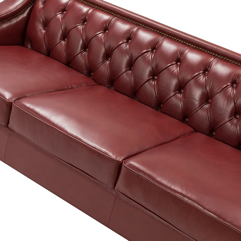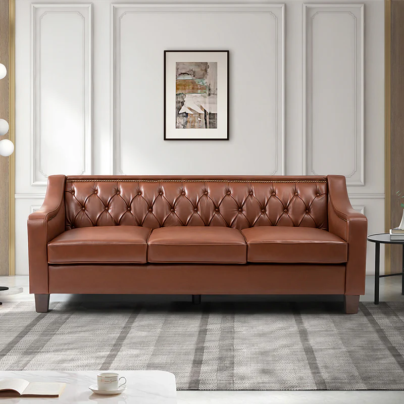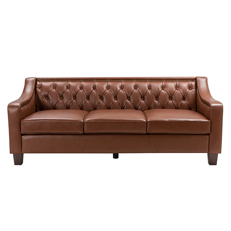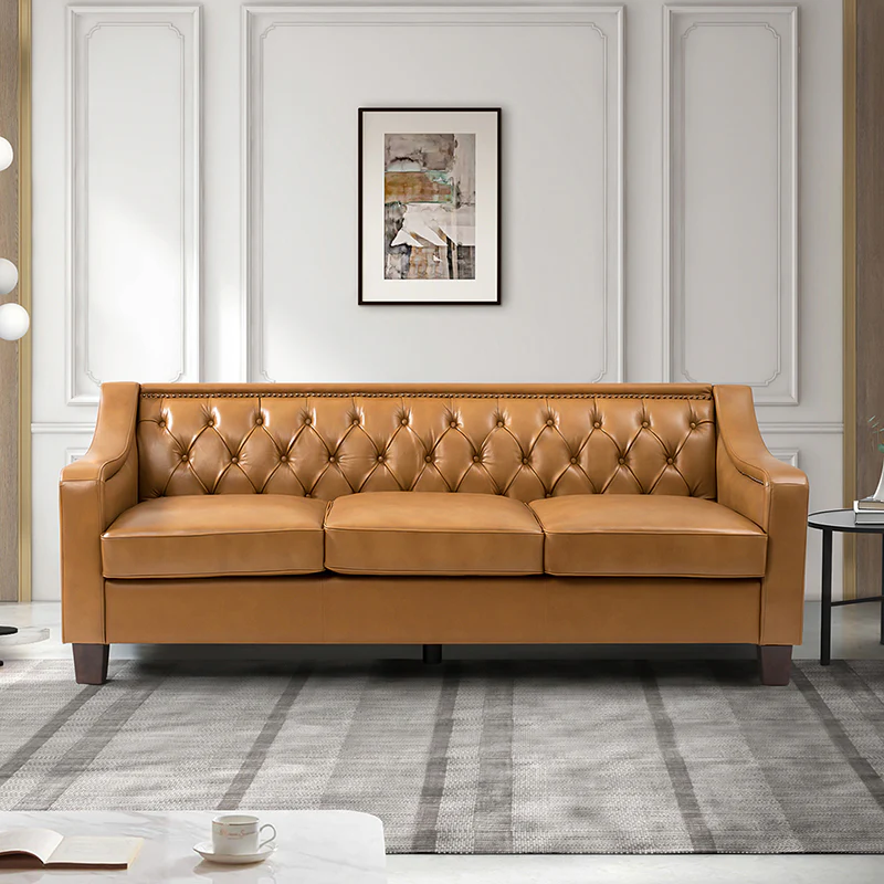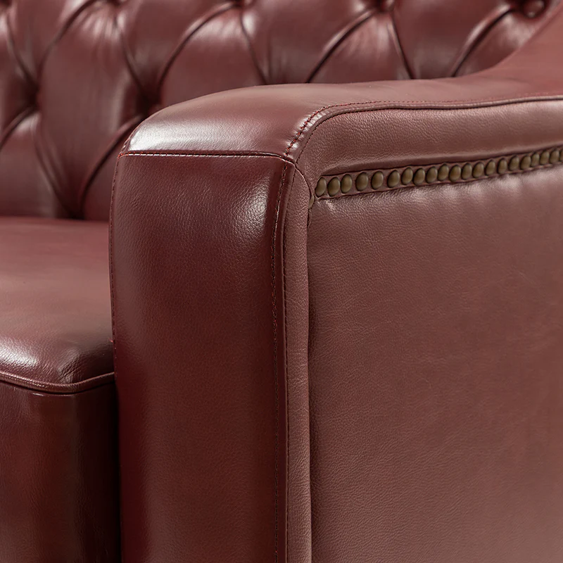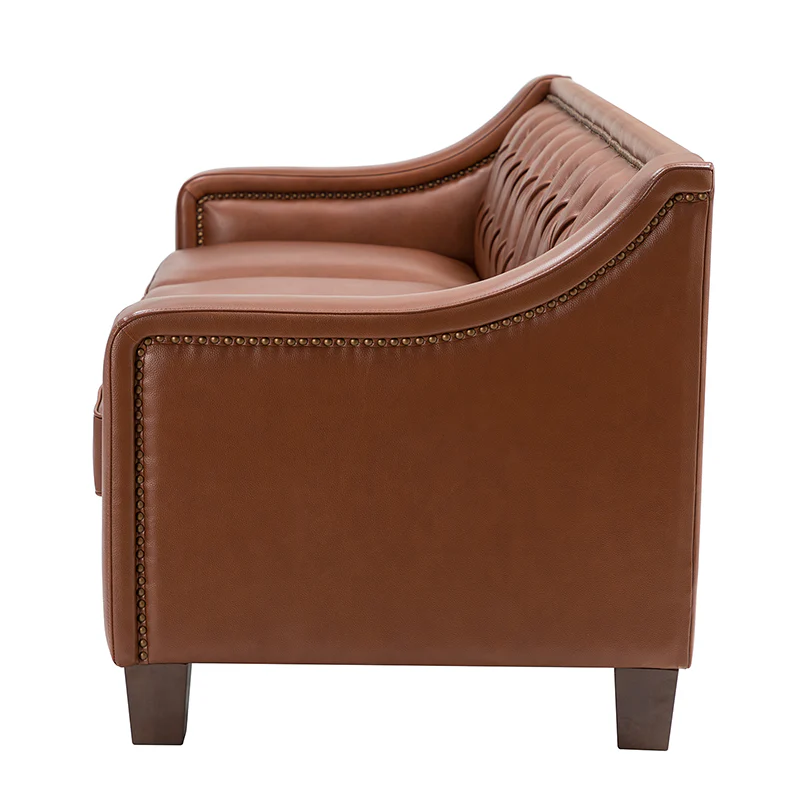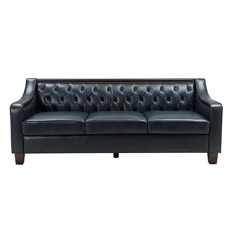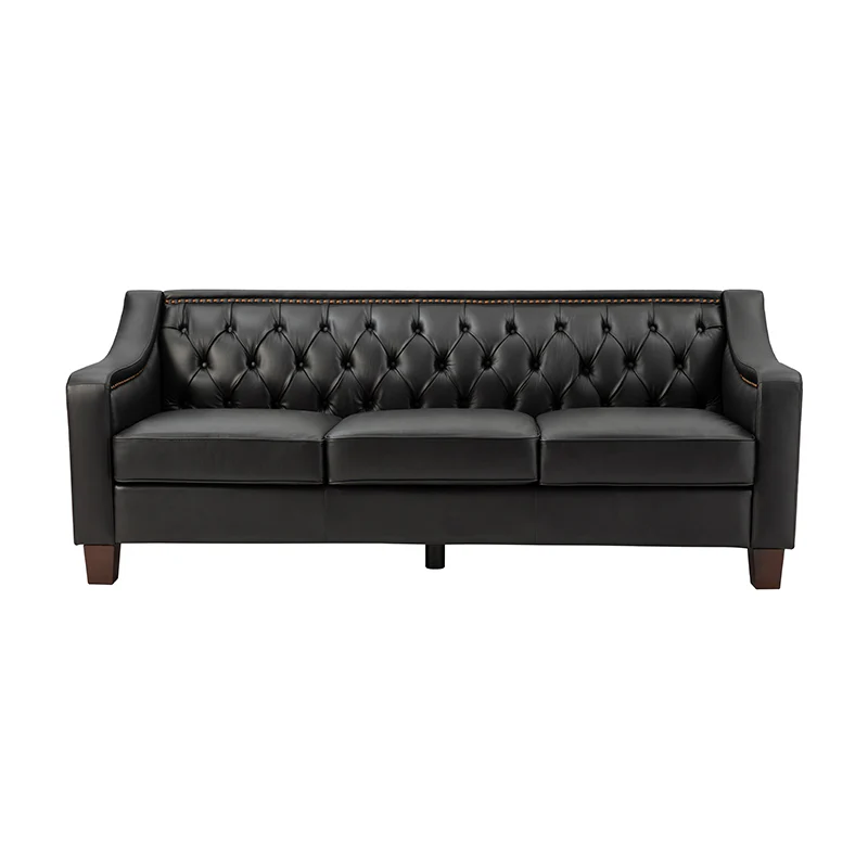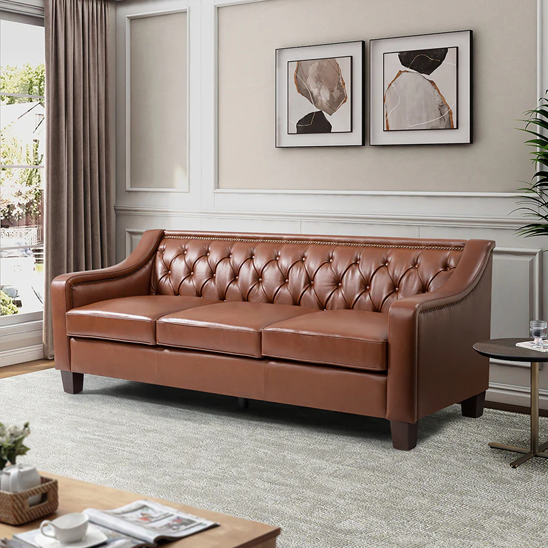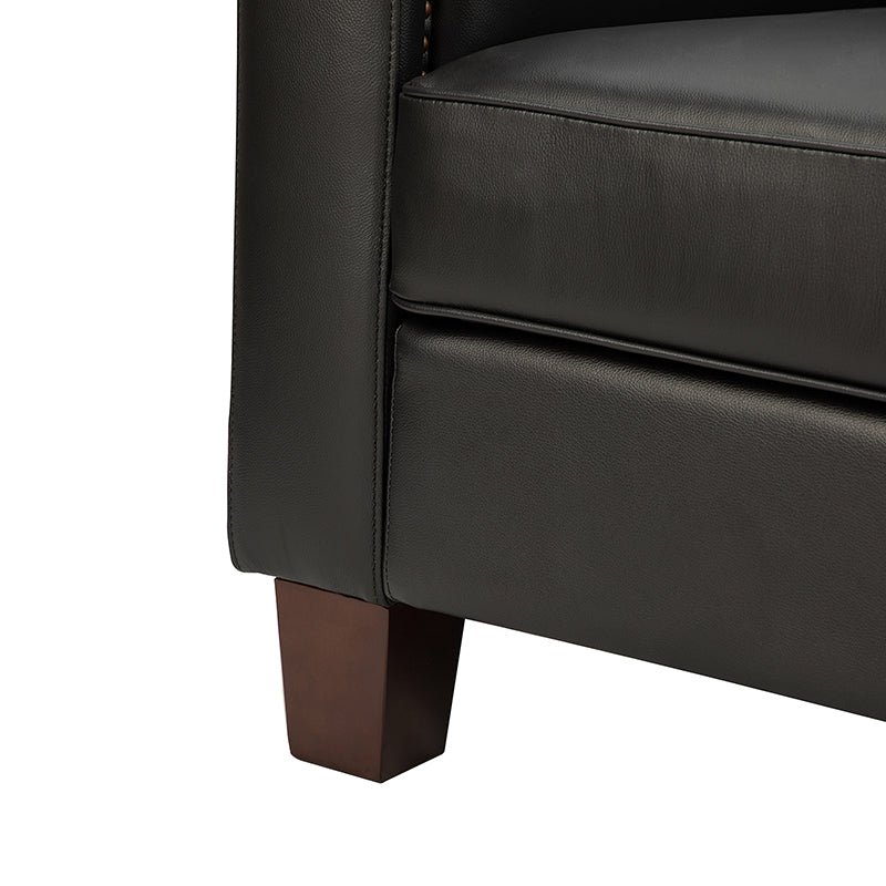 This modern top-grain leather sofa brings contemporary, curl-up comfort to your living room. The simple, angular design coordinates with a variety of decor styles, and the sturdy solid and manufactured wood frame ensures this sofa will last for years to come. Top grain leather surrounds the seating and armrests, while vegan leather is on the back and sides for affordability. Button-tufted and nailhead trim add more flair to the sofa, which can make your home more beautiful. At the same time, the seat cushions are removable according to your needs, and the core of the cushion can be taken out, which is very convenient for you to clean it. Lounge in luxury with this elegant sofa perfect for lazy day living. Add style to your decor with a modern furniture favorite for living room spaces.