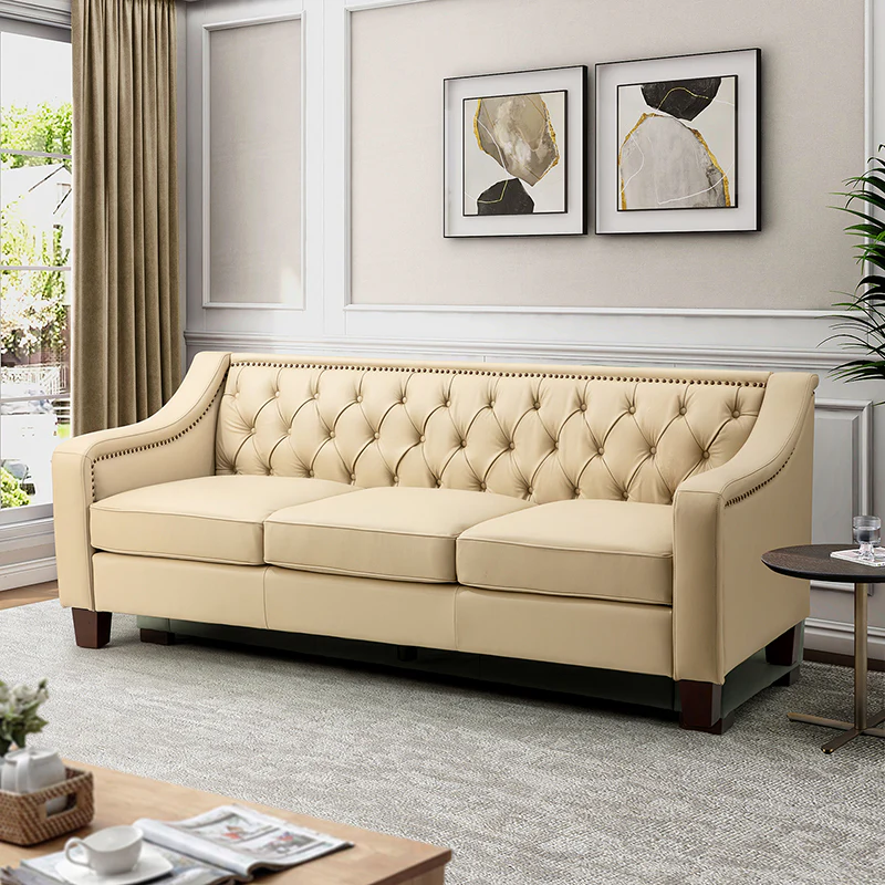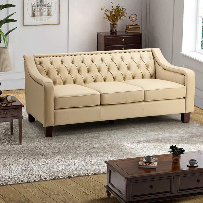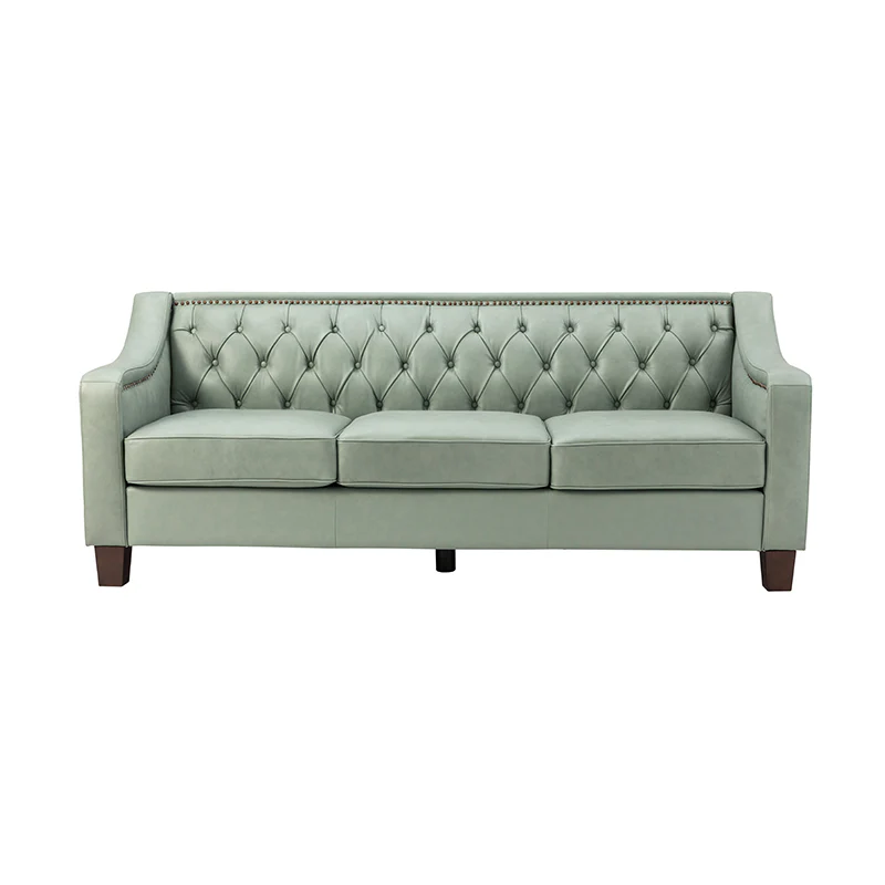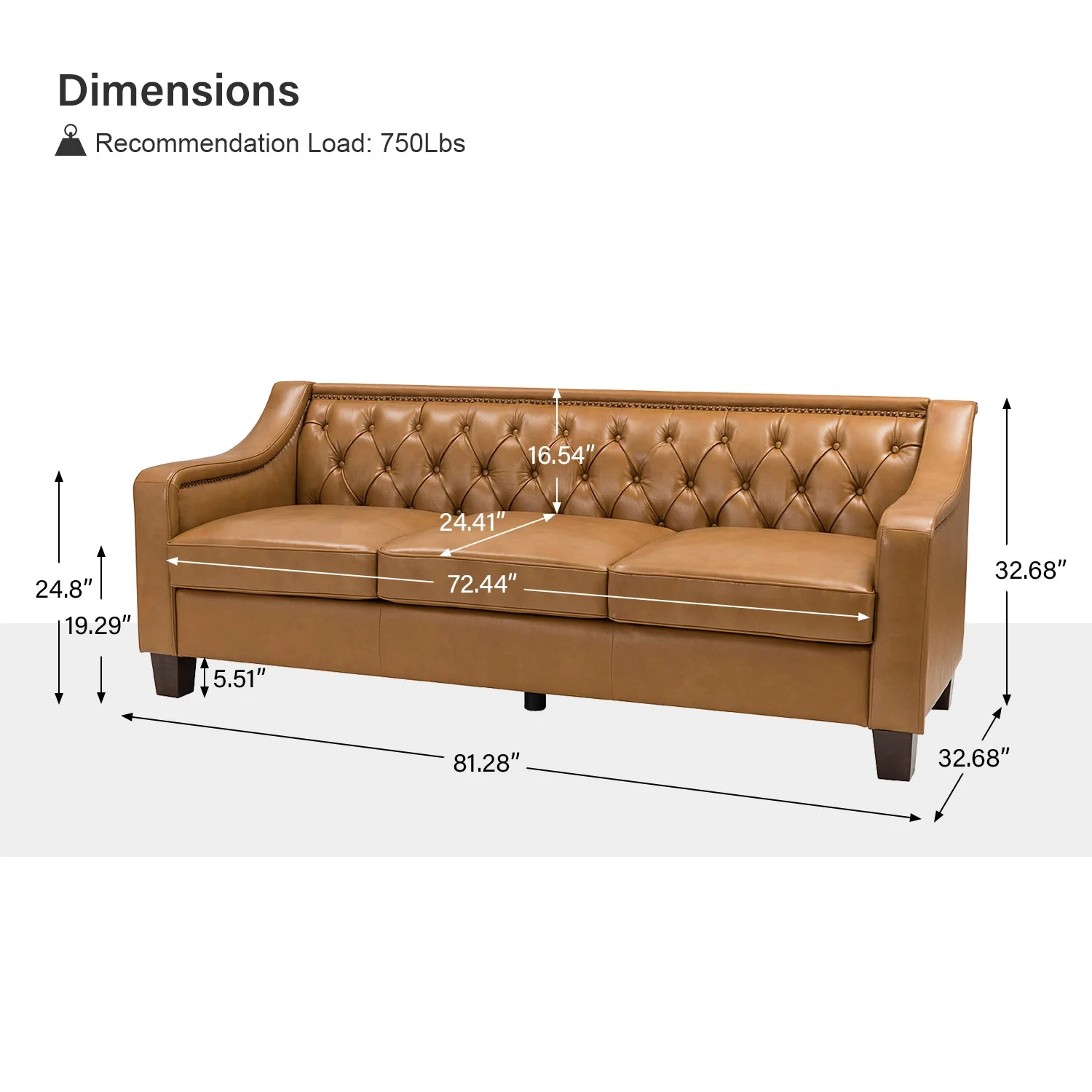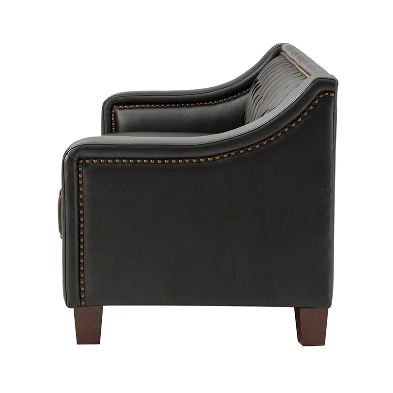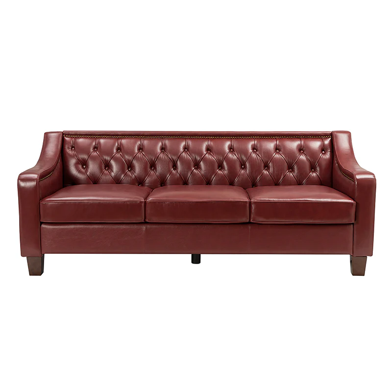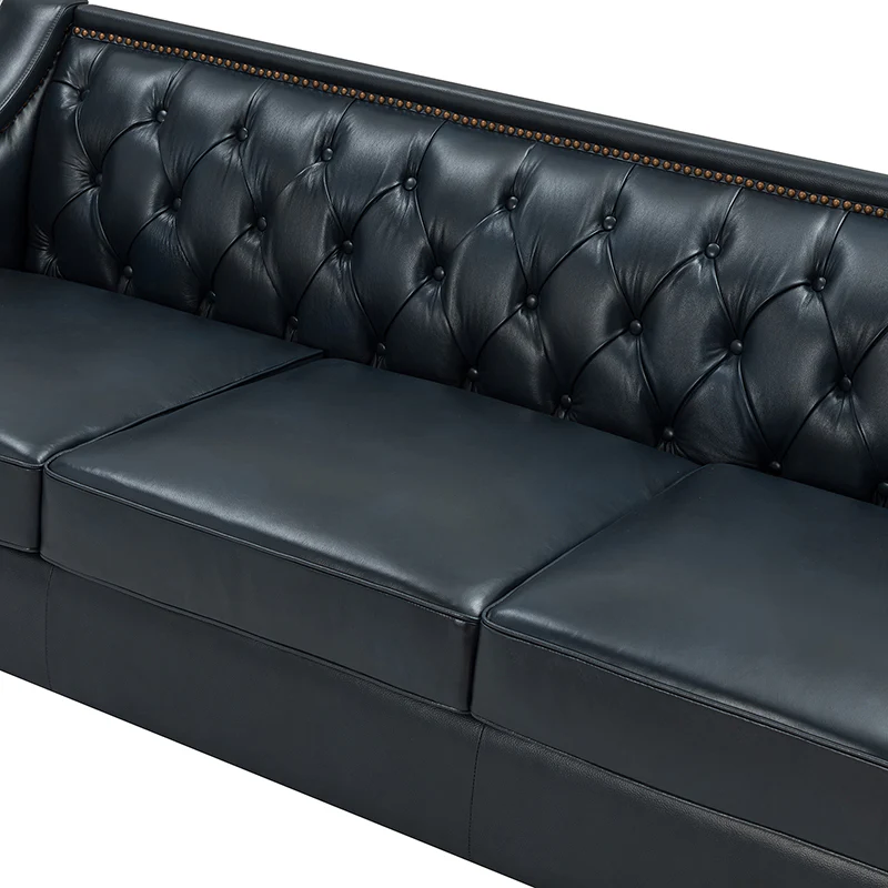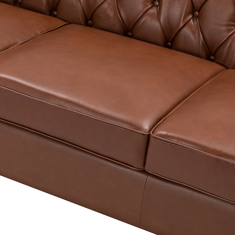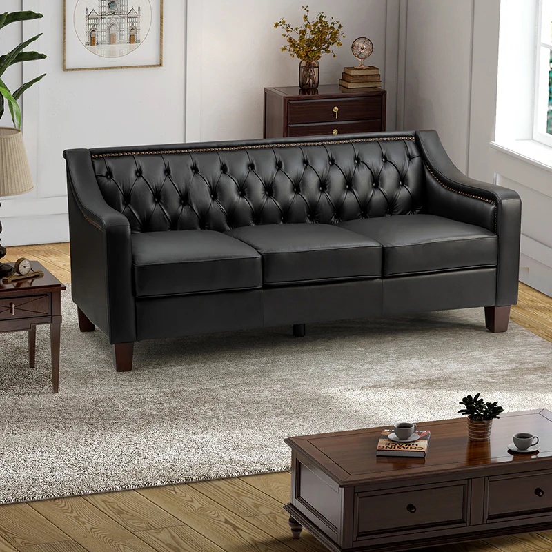 This modern top-grain leather sofa brings contemporary, curl-up comfort to your living room. The simple, angular design coordinates with a variety of decor styles, and the sturdy solid and manufactured wood frame ensures this sofa will last for years to come. Top grain leather surrounds the seating and armrests, while vegan leather is on the back and sides for affordability. Button-tufted and nailhead trim add more flair to the sofa, which can make your home more beautiful. At the same time, the seat cushions are removable according to your needs, and the core of the cushion can be taken out, which is very convenient for you to clean it. Lounge in luxury with this elegant sofa perfect for lazy day living. Add style to your decor with a modern furniture favorite for living room spaces.