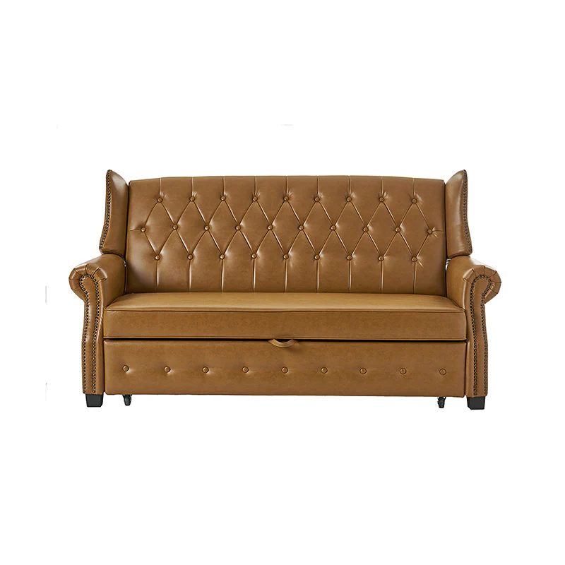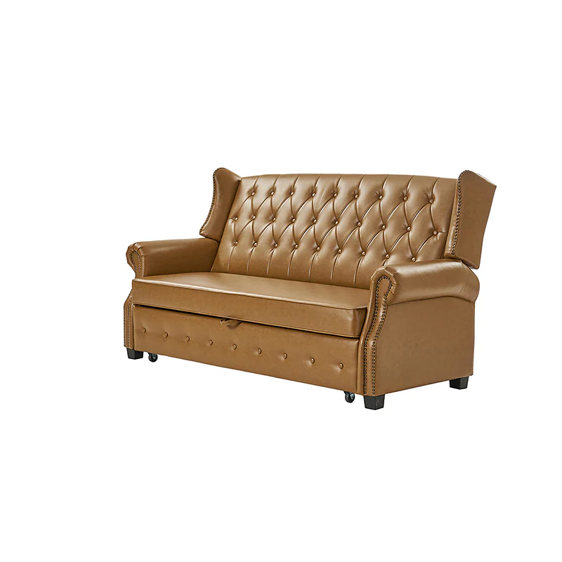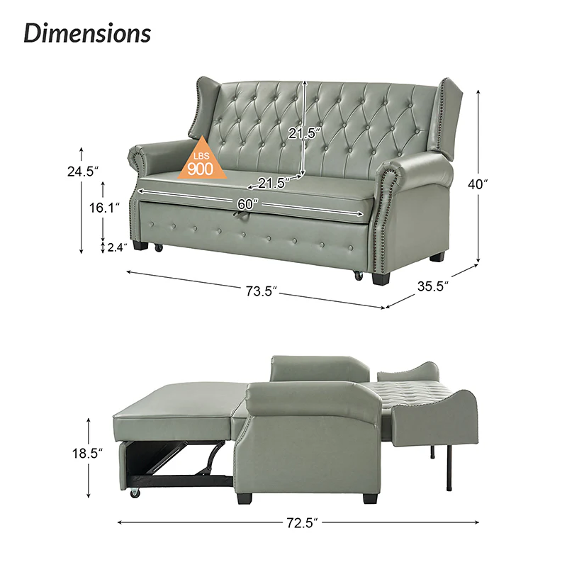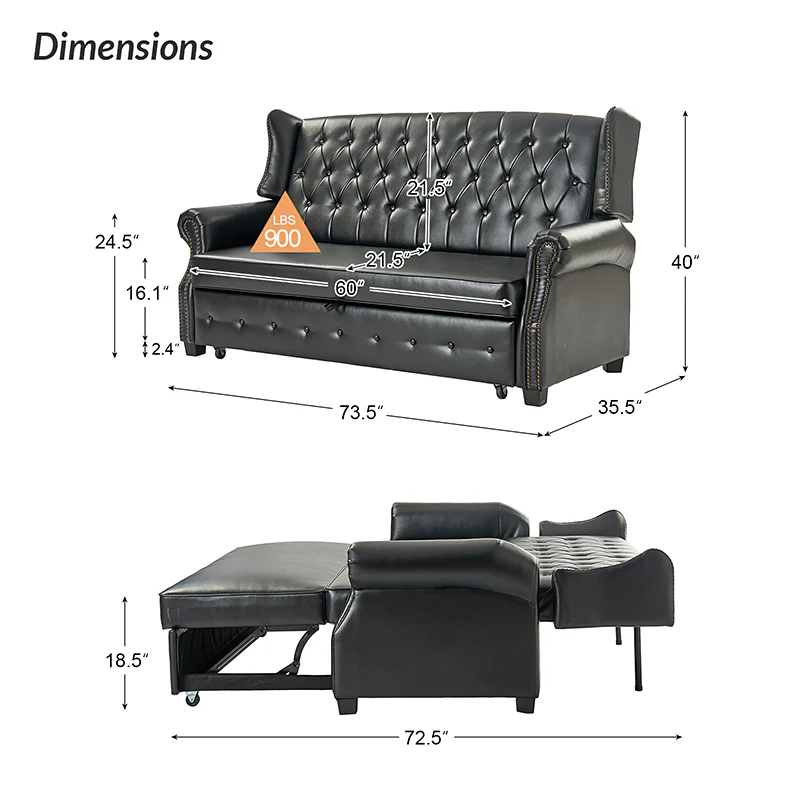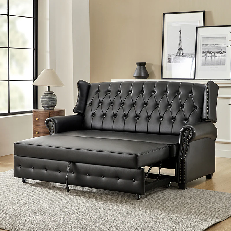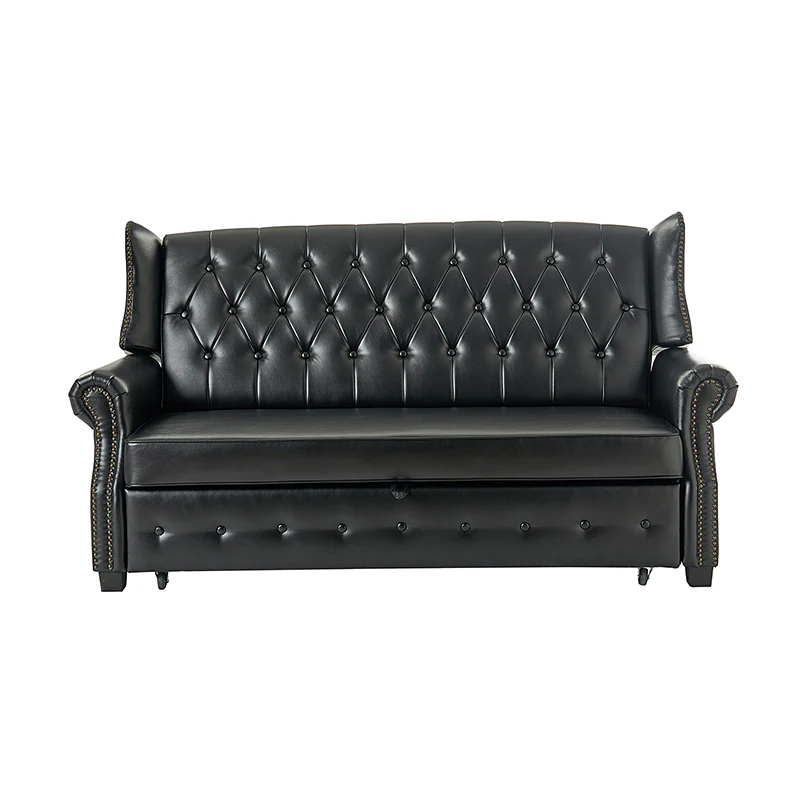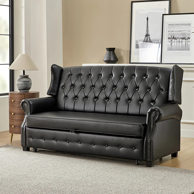 The transitional high-back Chesterfield sofa bed seamlessly blends classic elegance with modern functionality. Upholstered in a high-quality leather, the sofa features a timeless Chesterfield design, highlighted by a high back for added comfort and sophistication. The thick seat cushion and backrest provide a plush and comfortable seating experience. The distinctive feature of the sofa lies in its meticulously crafted button-tufted upholstery, creating a visually striking pattern that adds a touch of elegance to any living space. With its thoughtful design, the sofa includes armrests and an adjustable backrest, allowing you to recline and enjoy a restful sleep.