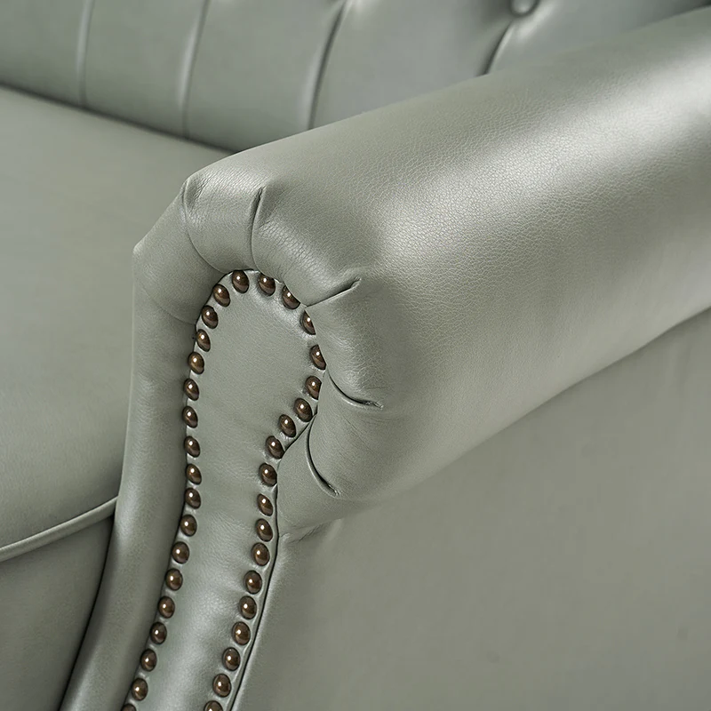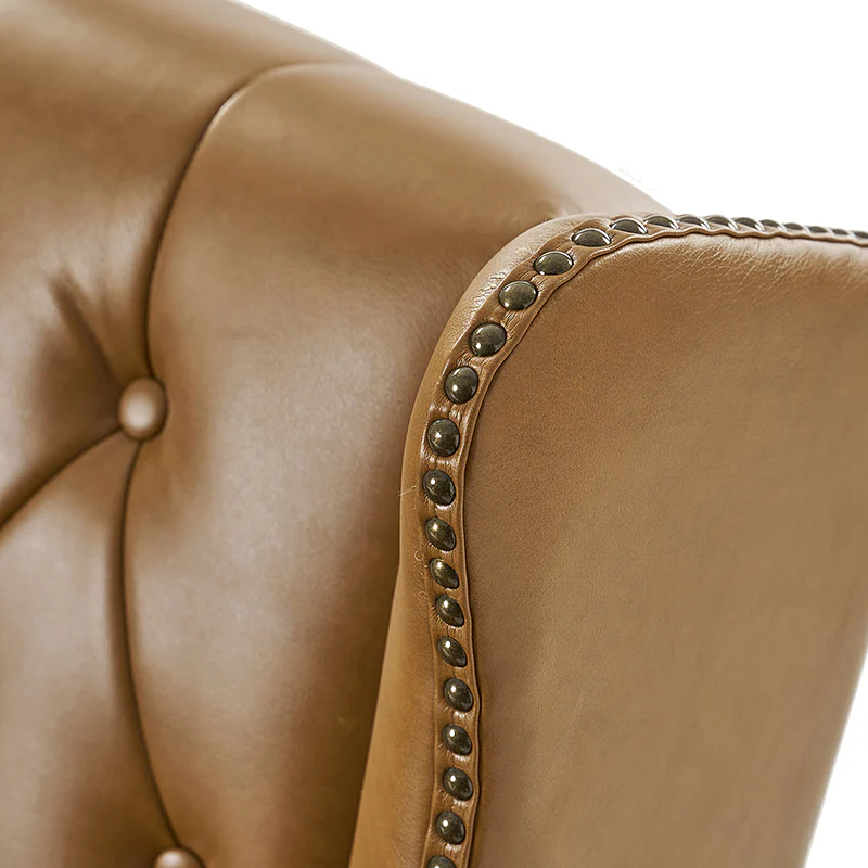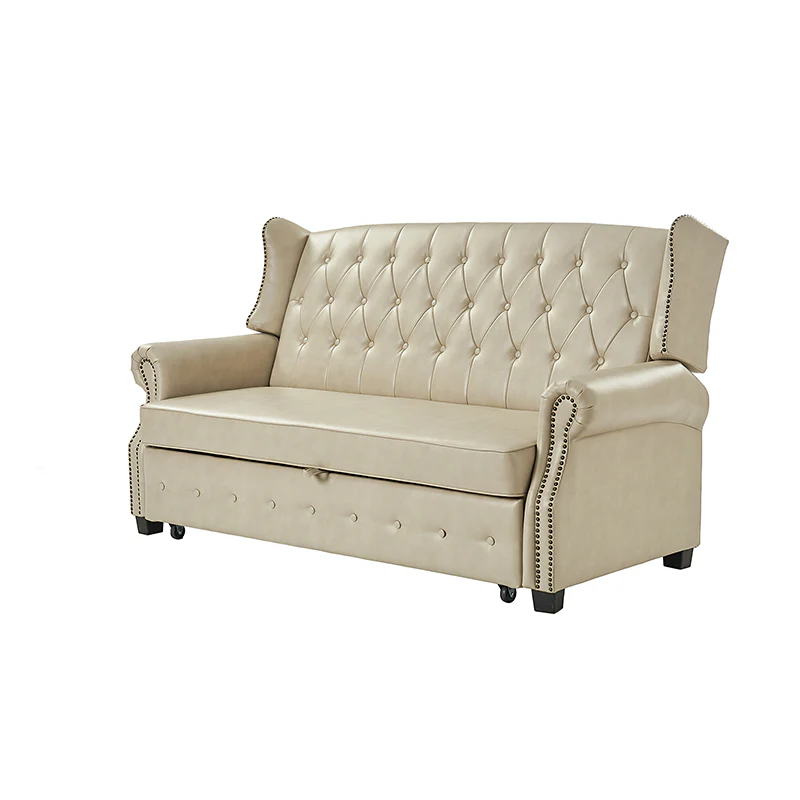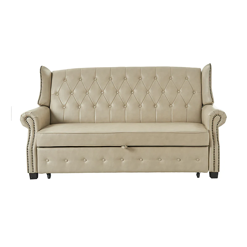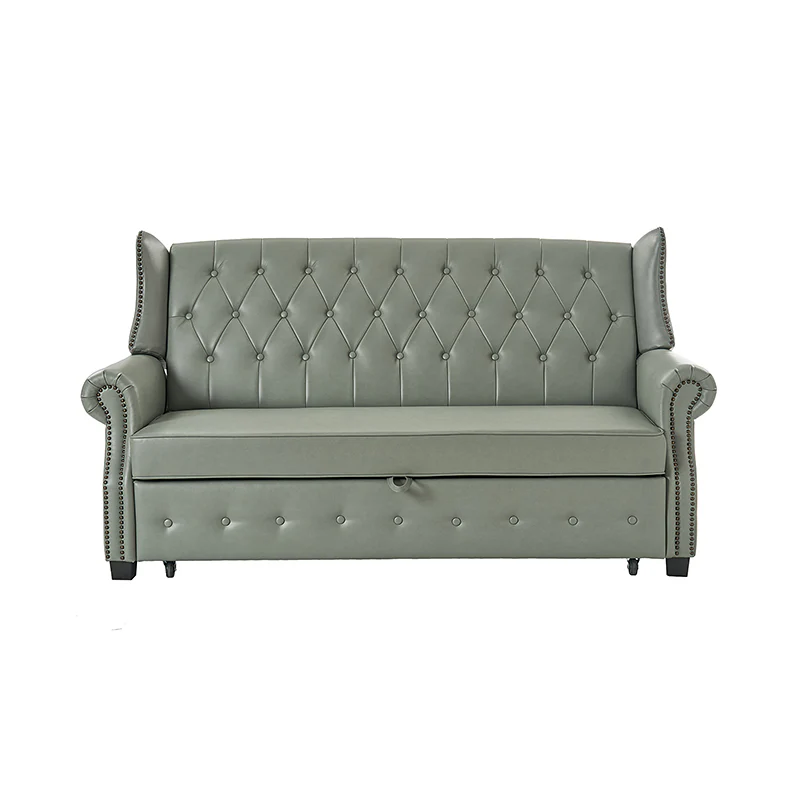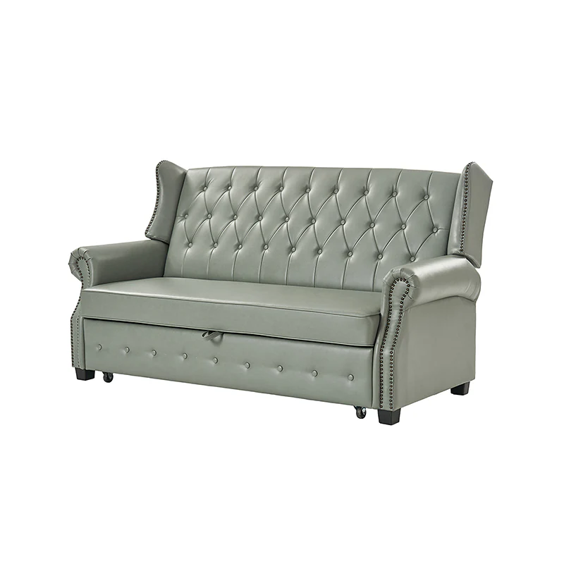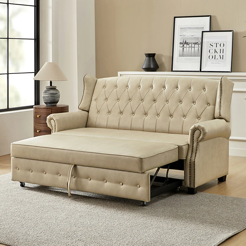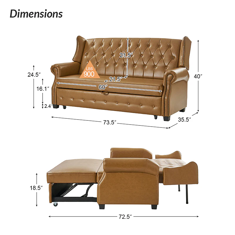 The transitional high-back Chesterfield sofa bed seamlessly blends classic elegance with modern functionality. Upholstered in a high-quality leather, the sofa features a timeless Chesterfield design, highlighted by a high back for added comfort and sophistication. The thick seat cushion and backrest provide a plush and comfortable seating experience. The distinctive feature of the sofa lies in its meticulously crafted button-tufted upholstery, creating a visually striking pattern that adds a touch of elegance to any living space. With its thoughtful design, the sofa includes armrests and an adjustable backrest, allowing you to recline and enjoy a restful sleep.