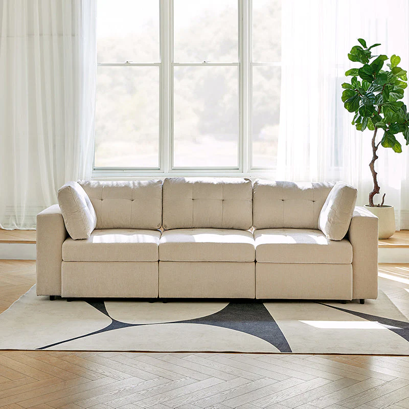 Experience customizable seating with the sectional sofa, designed for flexible layout options to accommodate various space requirements. Revel in spacious comfort with generously sized seats, perfect for lounging or entertaining. Each seat features hidden storage space underneath, providing added convenience for easy organization. Built to last, the sofa boasts a solid wood frame, high-density foam filling, and durable fabric upholstery, ensuring durability and comfort. Assembly is a breeze with its tool-free design and modular packaging, facilitating convenient transportation. The sofa's extra-wide armrests contribute to an additional resting area, suitable for placing books, remote controls, or beverages.