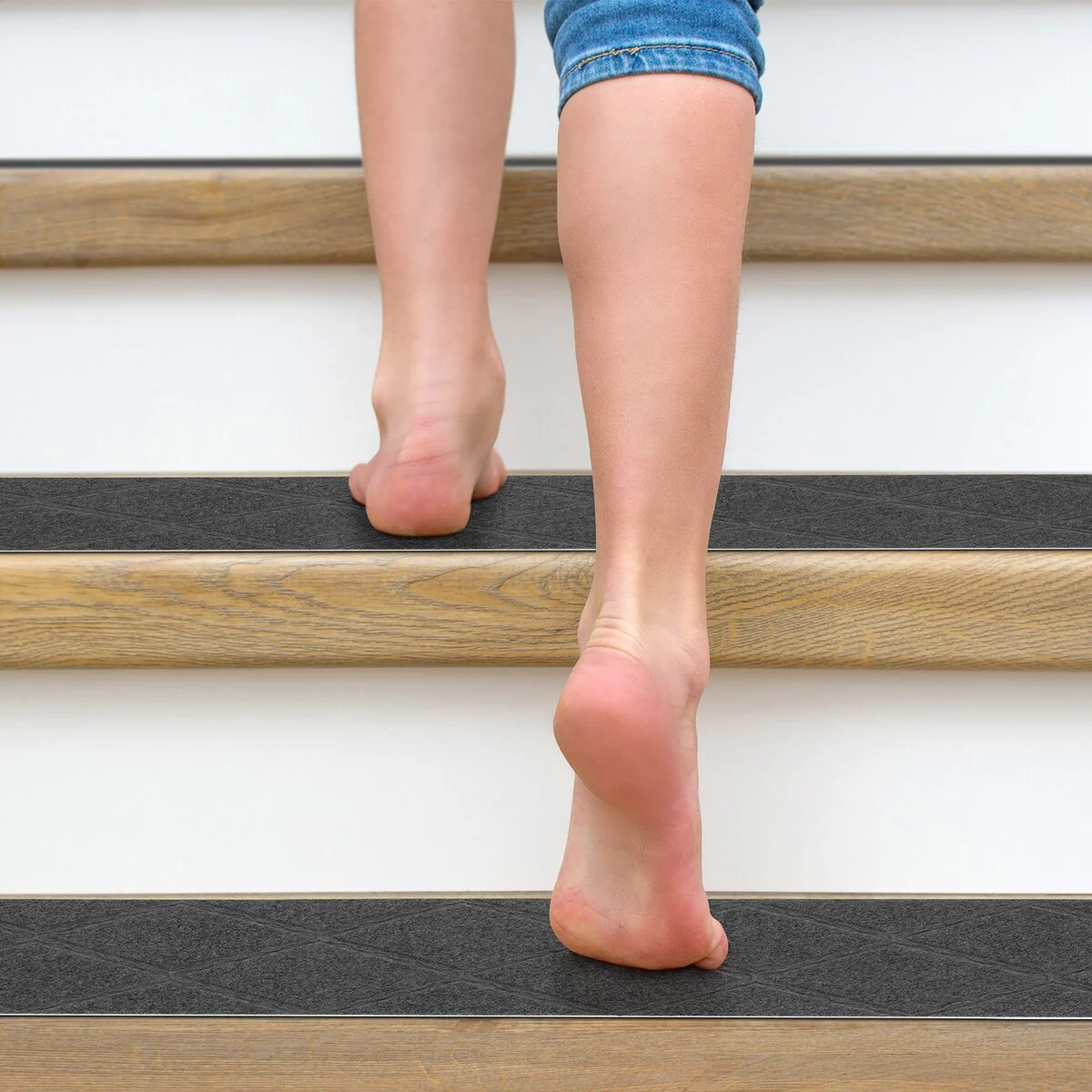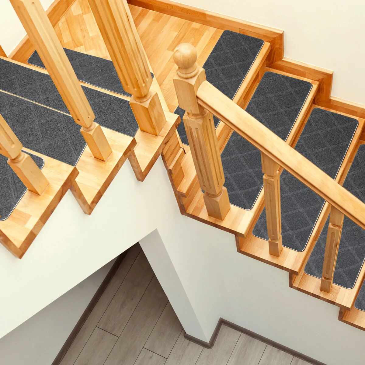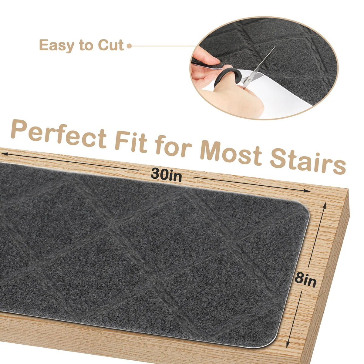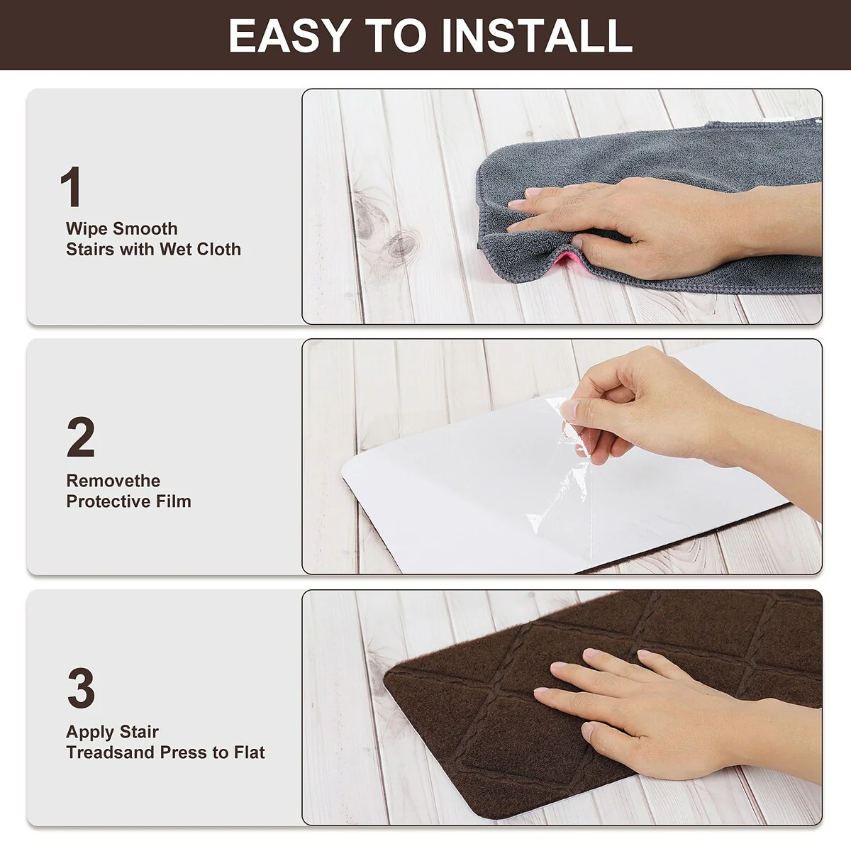 - EASY TO INSTALL: washed and vacuumed the staircase step treads, then peel off the backing and place it on the step. The slip-resistant backing stair pads adhere to the floor without any gluey feel and stay in place after being completely flat, you don't have to use tape on your wooden staircase.