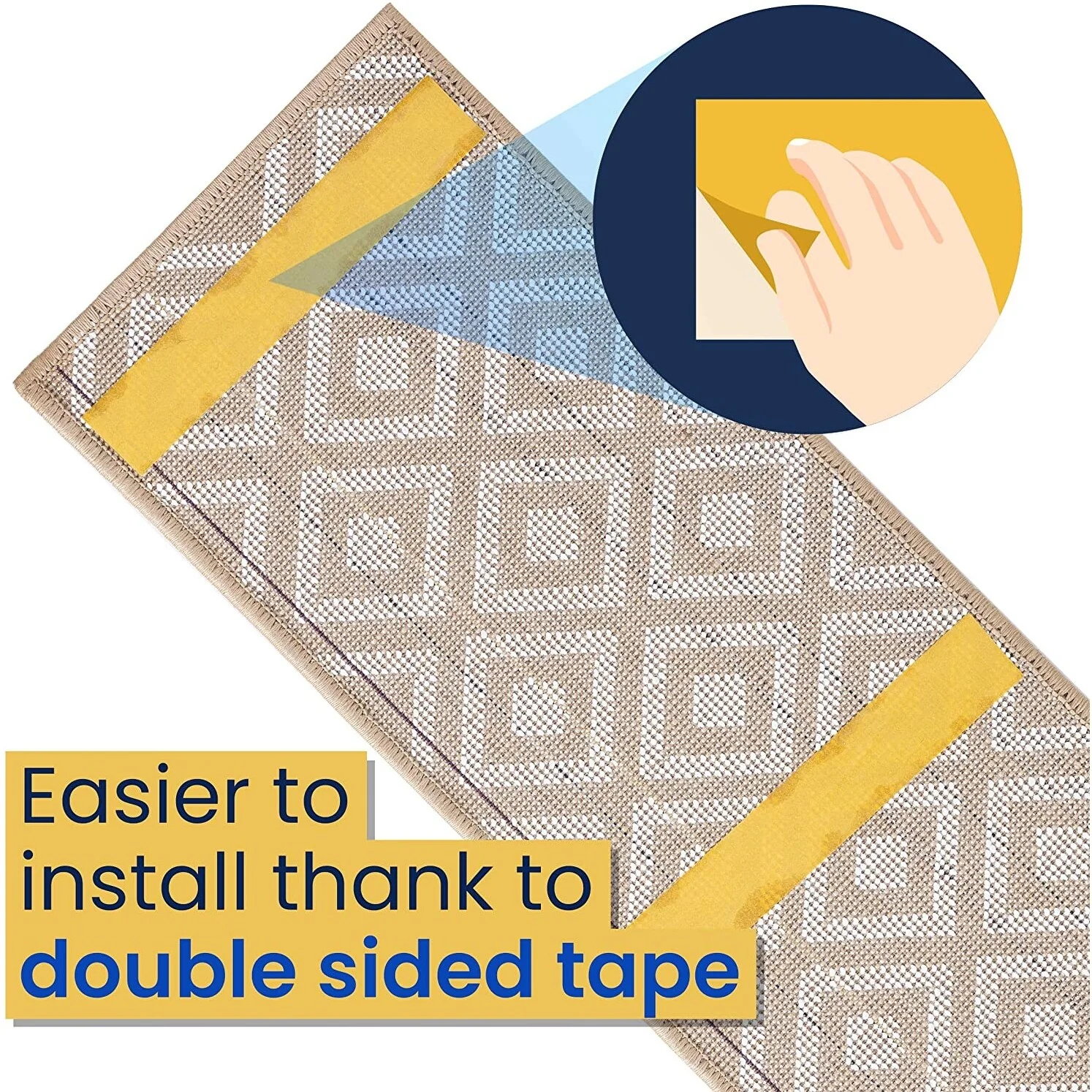 Provides excellent adhesion to both smooth and rough surfaces. This special design works for carpet to floor applications.Non-slip backing stair treads to provide skid resistance and safety grip. High tensile strength and wood-safe adhesion secures the stair treads in place. It is safe for hardwood floors. Provides utmost safety to kids and elderly by preventing slipping suddenly. Can be easily removed by hand without leaving any residue that may damage delicate hardwood floors.