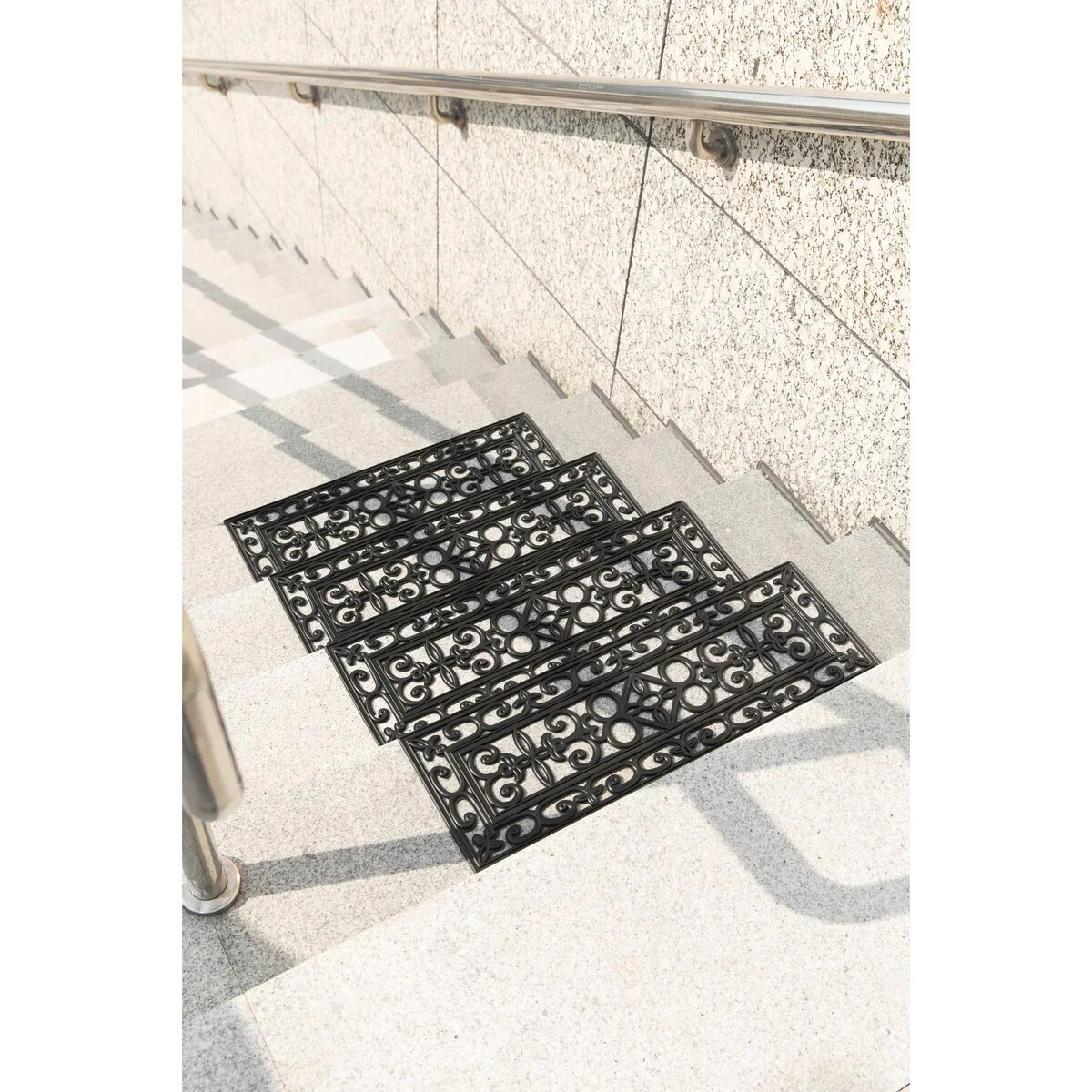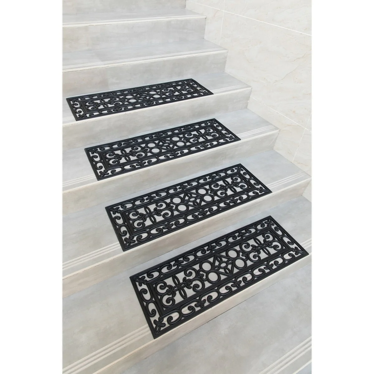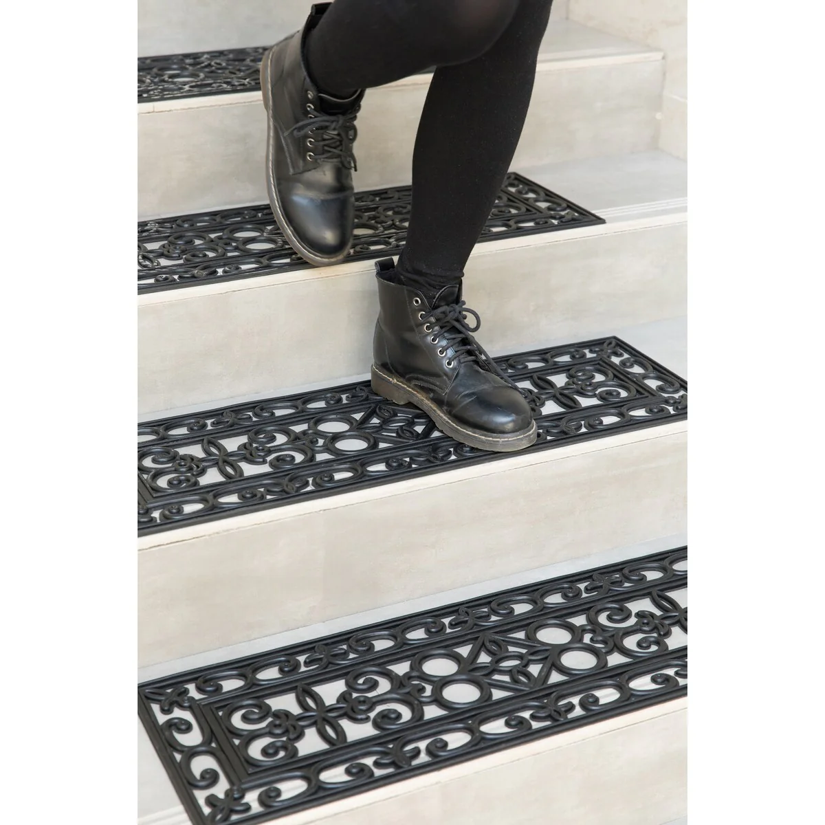 Keep your stairway protected with this decorative rubber stair mat. Crafted scrollwork design will add a classical appearance to your stairs. This mat provides protection, keeps your home clean while, the decorative design adds a modern touch to your stairways. This stair mat is ideal for indoor and outdoor use. Easy to clean by washing, sweeping, or shaking.