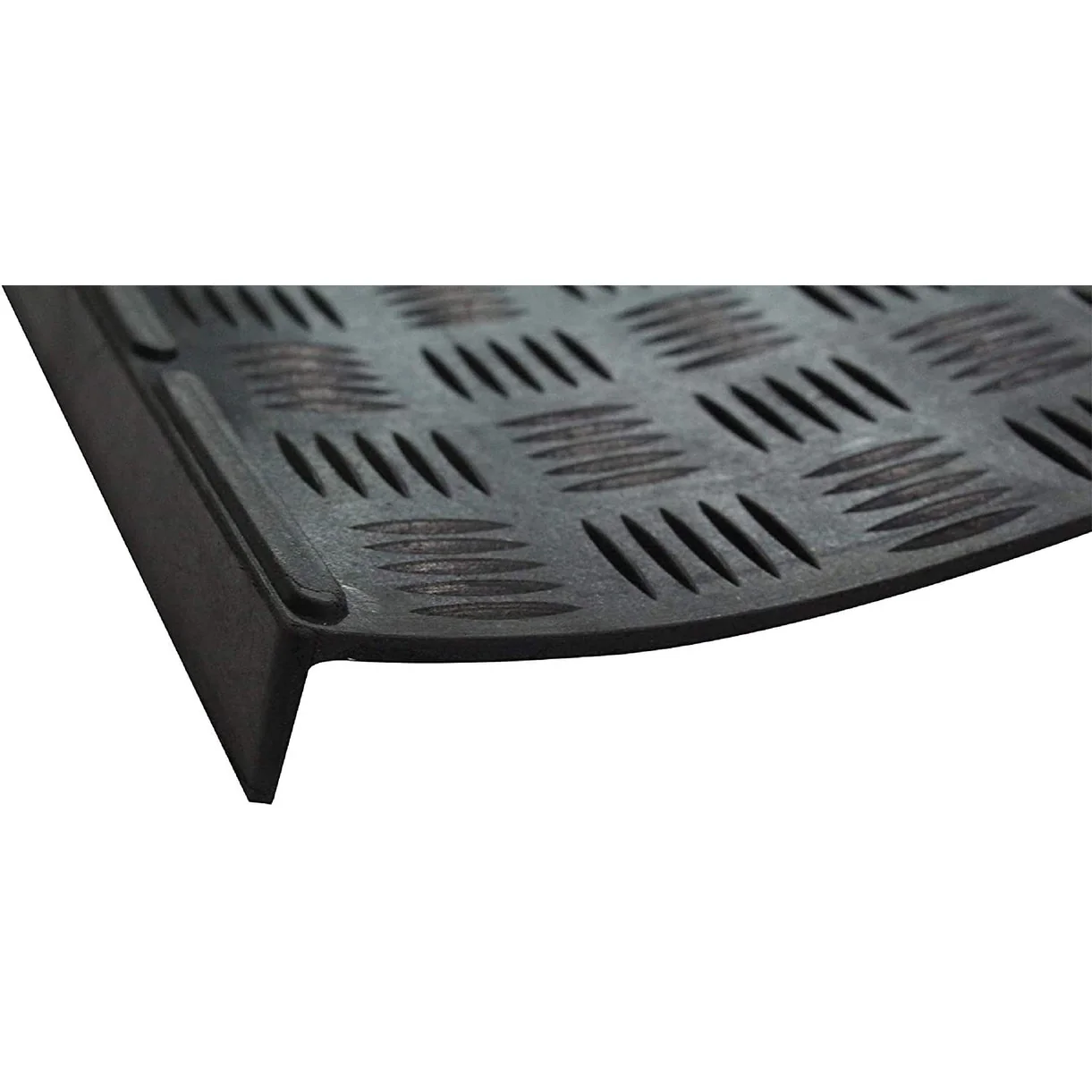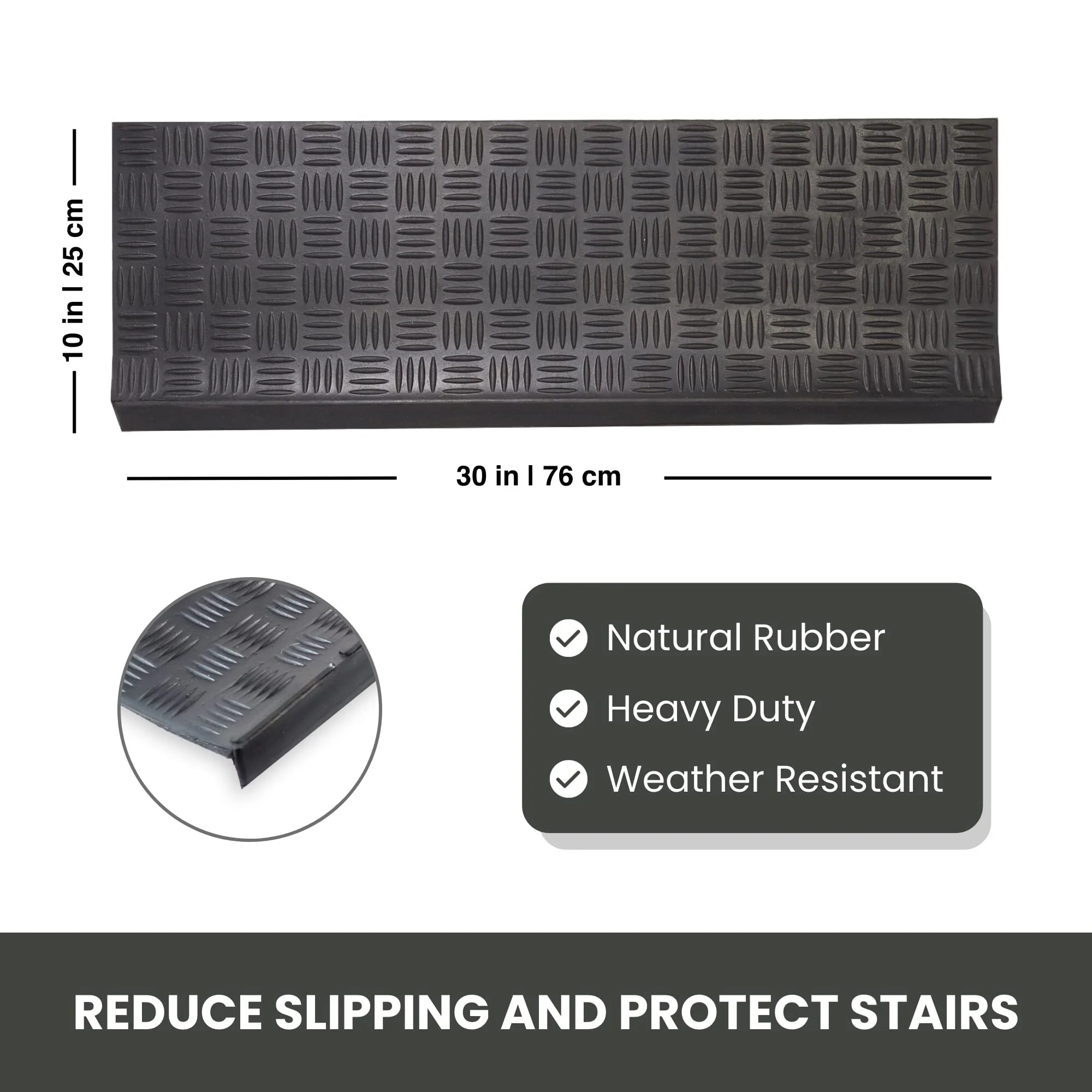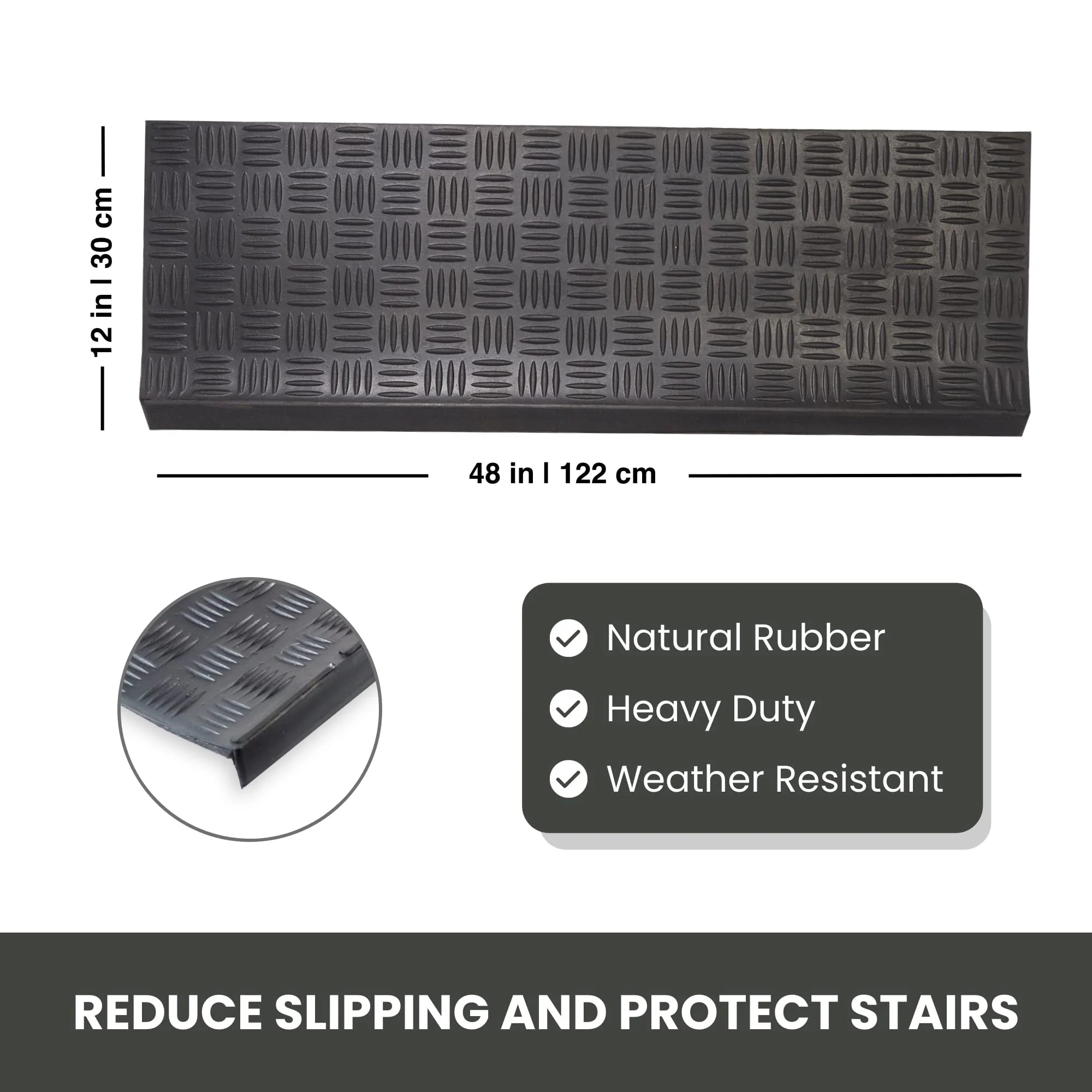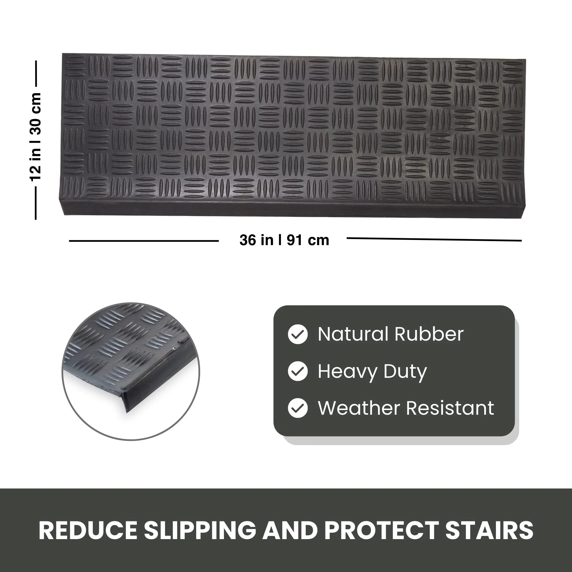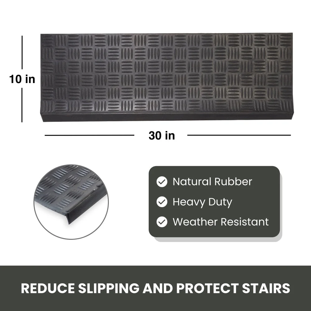 Light weight, rubber stair mats are made of 100% vulcanized and recycled rubber. The all-natural, non-slip stair treads are skid resistant and weather proof making them ideal for both indoor and outdoor use improving safety and durability. They provide grip and traction due to their unique design that traps dirt, snow, debris and moisture to keep floors clean. Their low maintenance design allows for easy clean up by simply vacuuming or wiping the dirt of the stair treads. With our new design with edge covering, protects your stairs from the dust being accumulated in the corners. The stair mat can easily firmly adhere to stairs with industrial grade double sided adhesive tape or by using nails on the edges and corners. If nails are used, ensure the nails are flush in on the rubber.Eco-friendly non-slip stair treads made of natural and recycled rubber, ideal for indoor or outdoor use. All weather, durable safety stair mats are skid resistant and weatherproof improving safety and durability. Low maintenance design allows for easy cleanup by simply vacuuming the stair treads or wiping the dirt off. Simple to install with industrial grade double sided adhesive tape or by using nails on the edges and corners (not included).