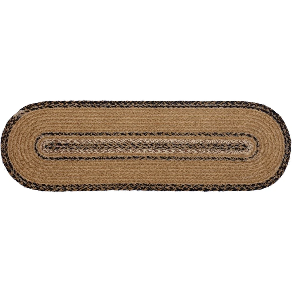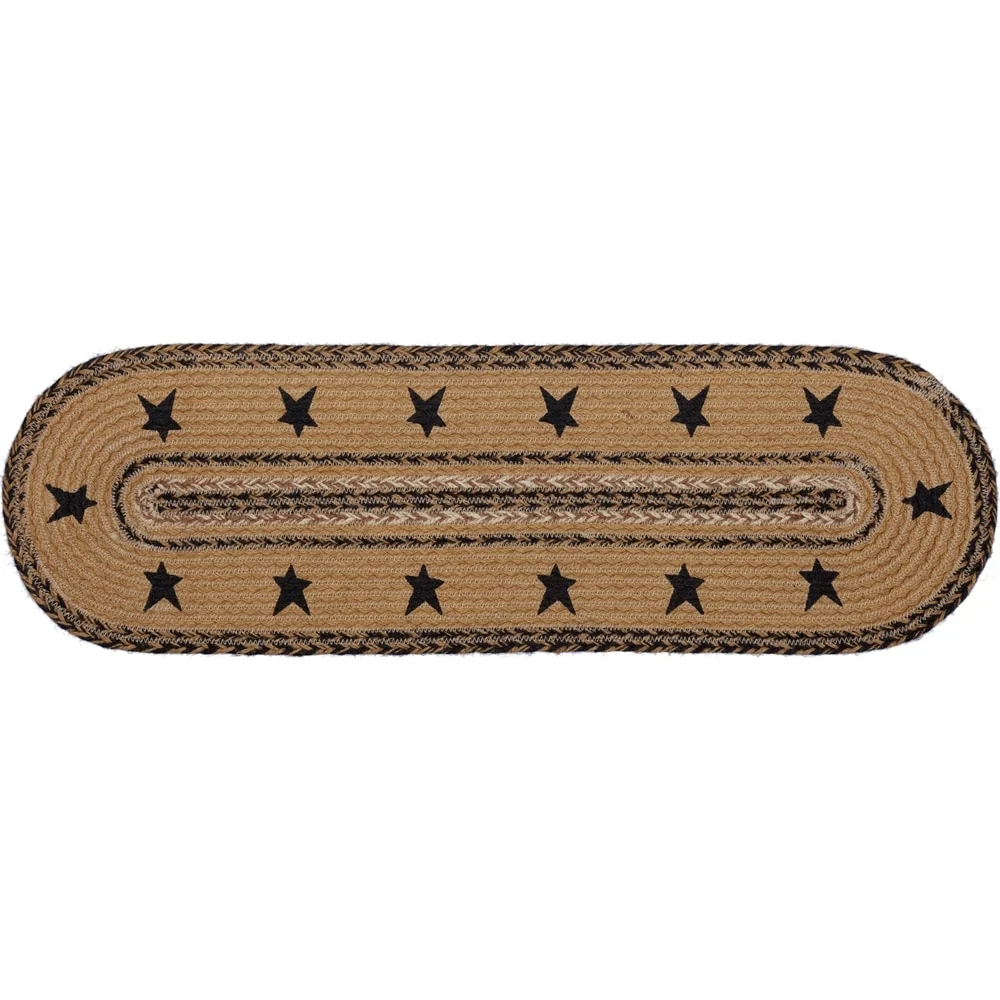 Decorate your stairs with the primitive Kettle Grove Jute Stair Tread Stencil Stars Border, Oval 8.5x27. This stair tread is decked out in a beautiful, timeless, primitive style, featuring alternating braids in black, warm creme and soft caramel brown, surrounded by black stenciled primitive stars. Finished with latex on the back for non slippage.