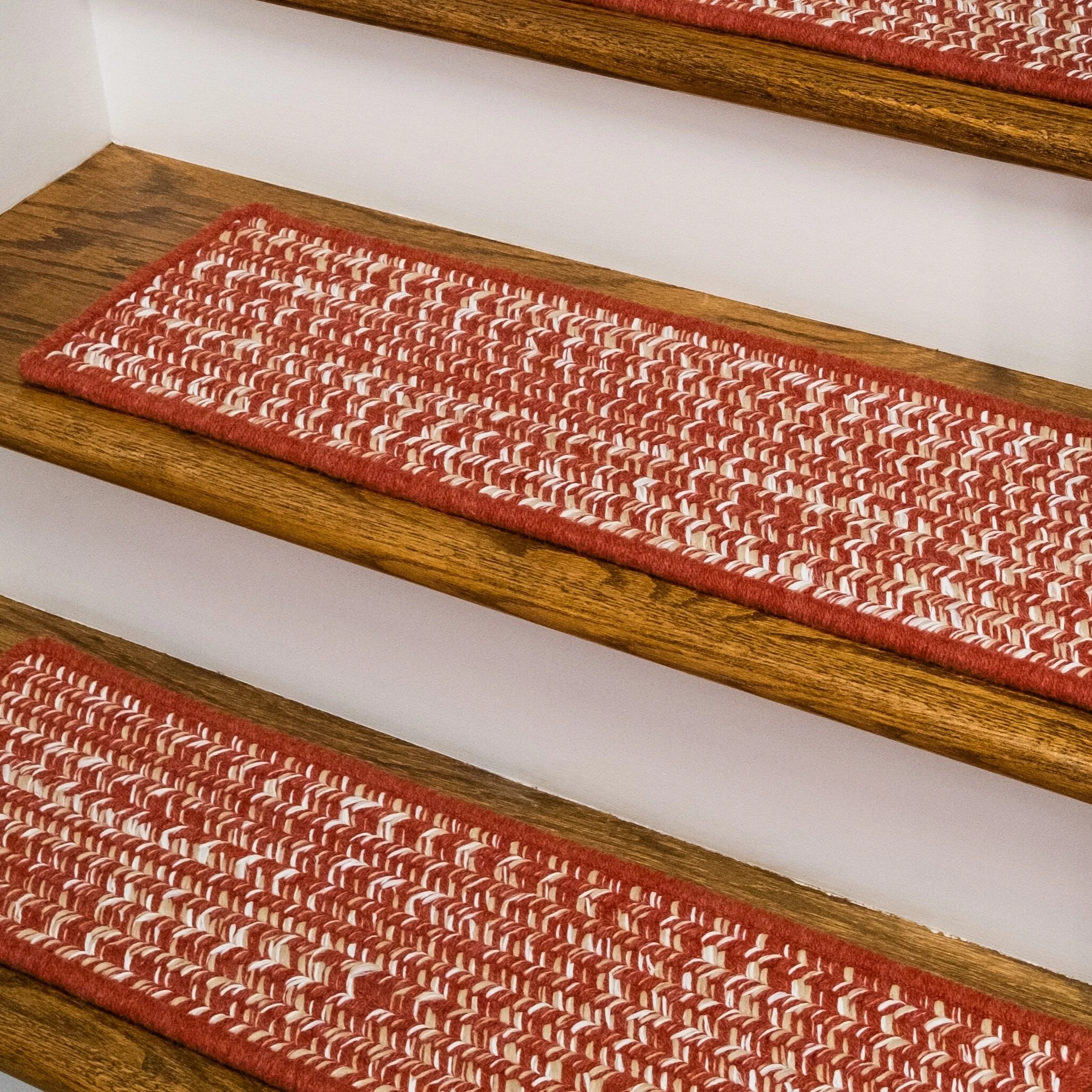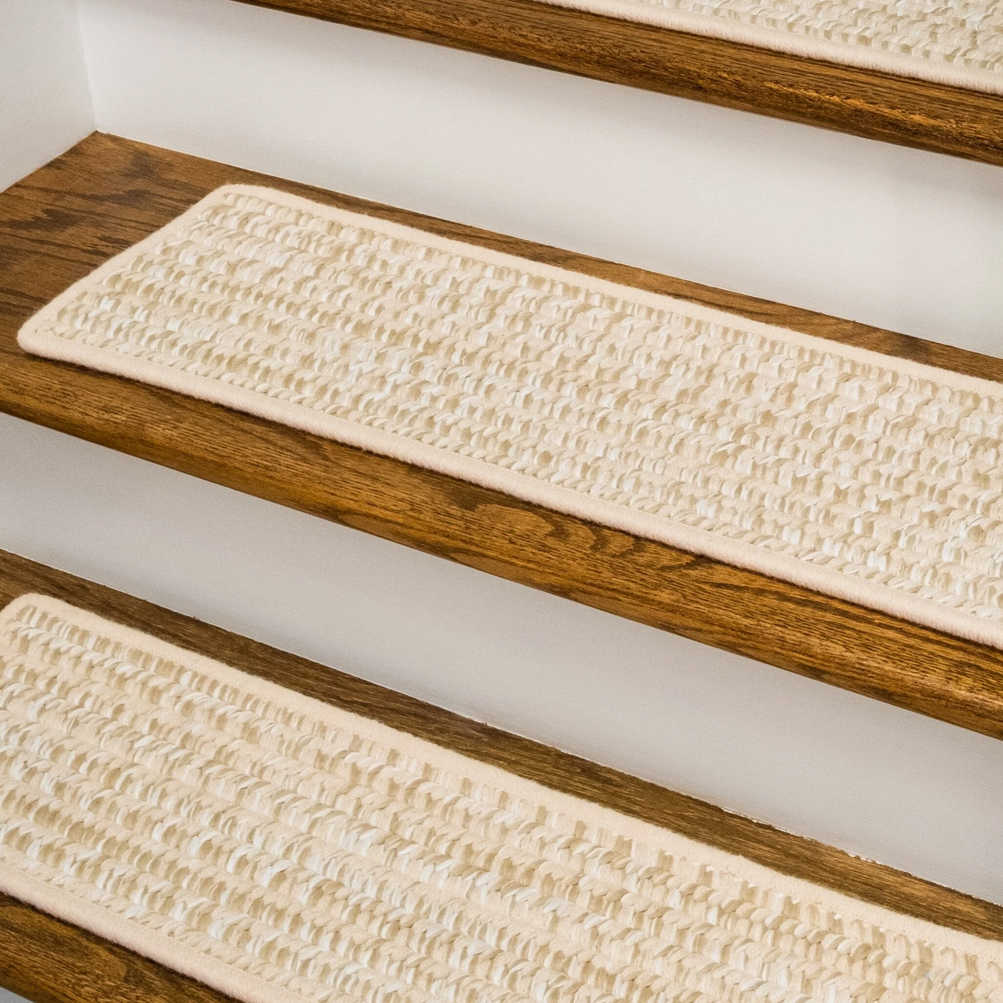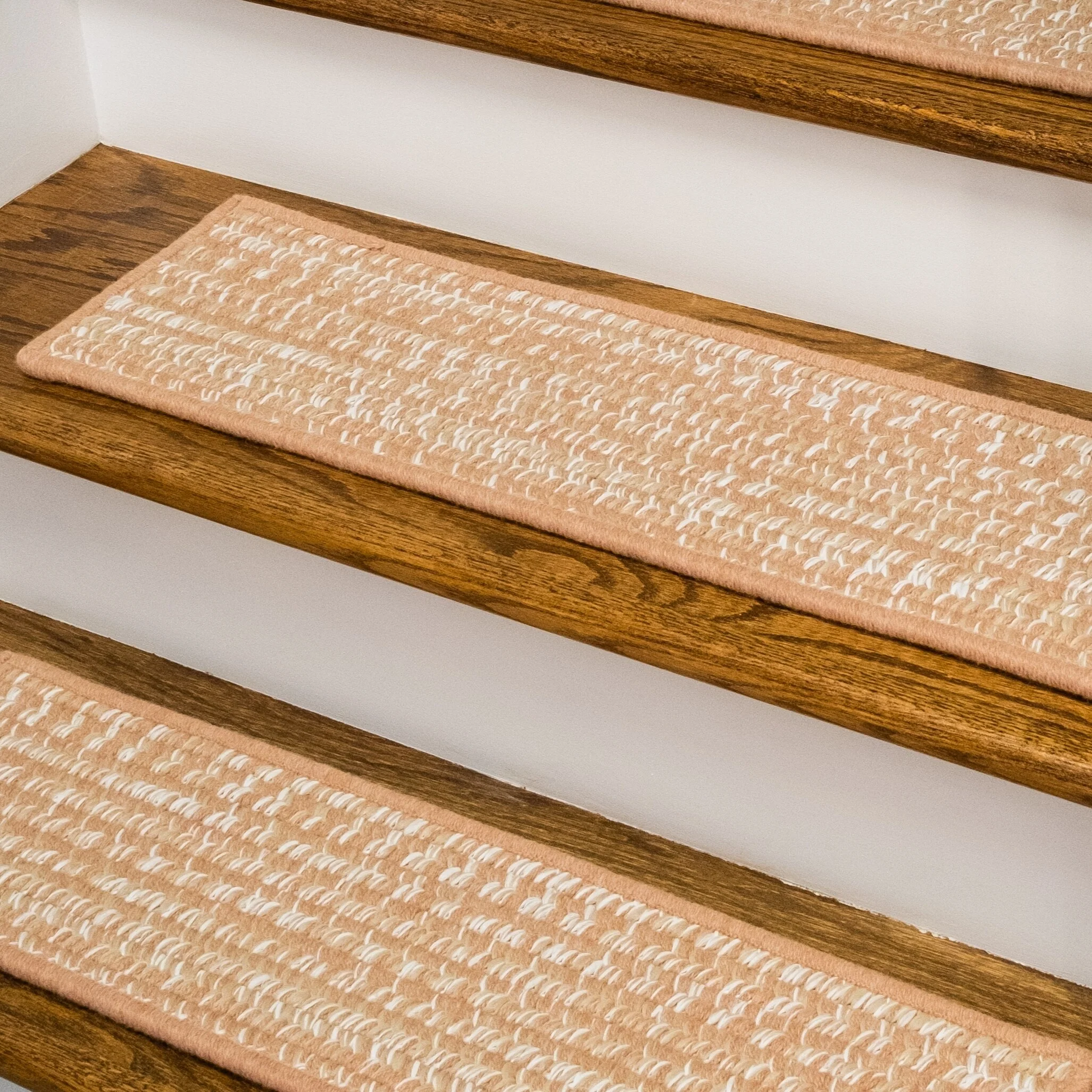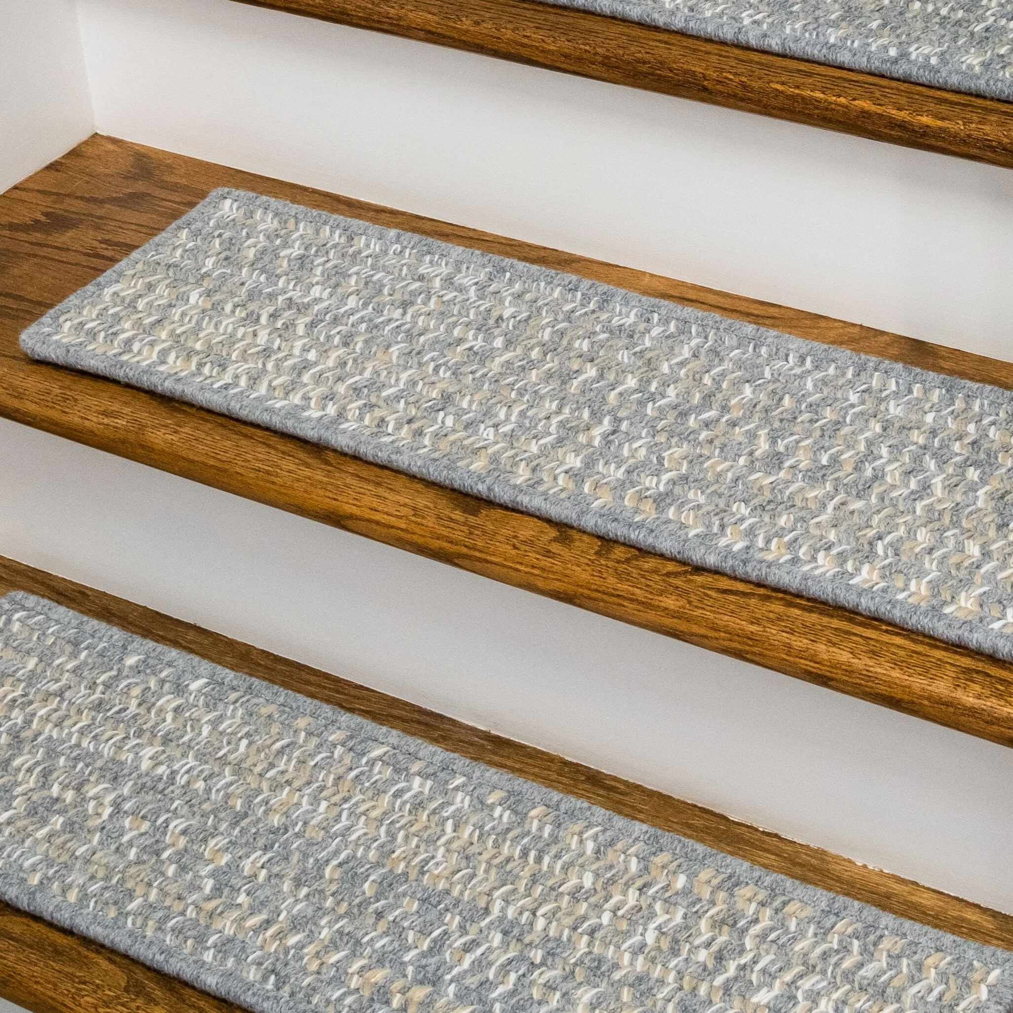 Soft wools blended into a multi-color woven tweed pattern. Soft, subtle style with a textured look and feel. Reversible stair treads. Wool yarns create a texturized, heathered look with unmatched quality, durability, and timeless style.