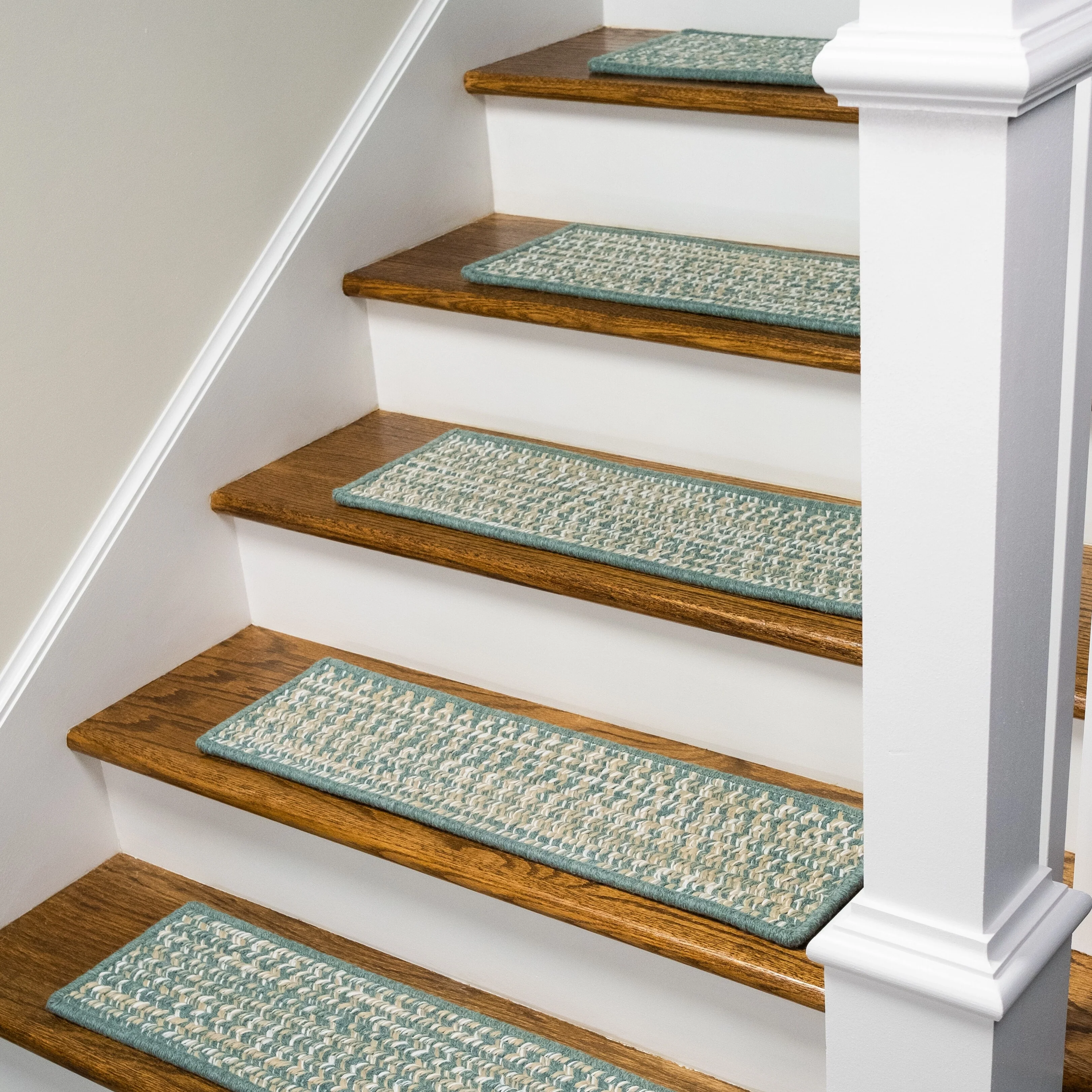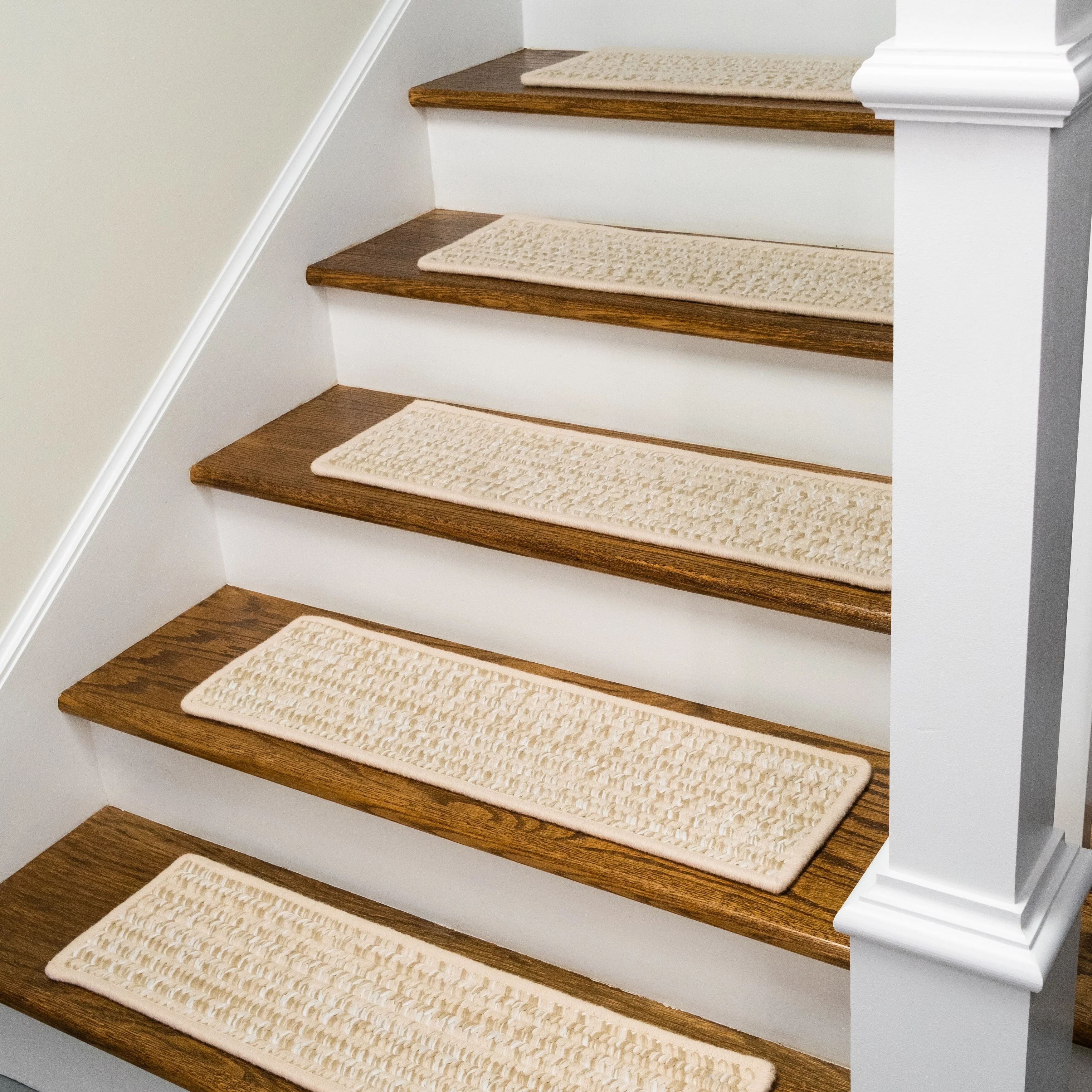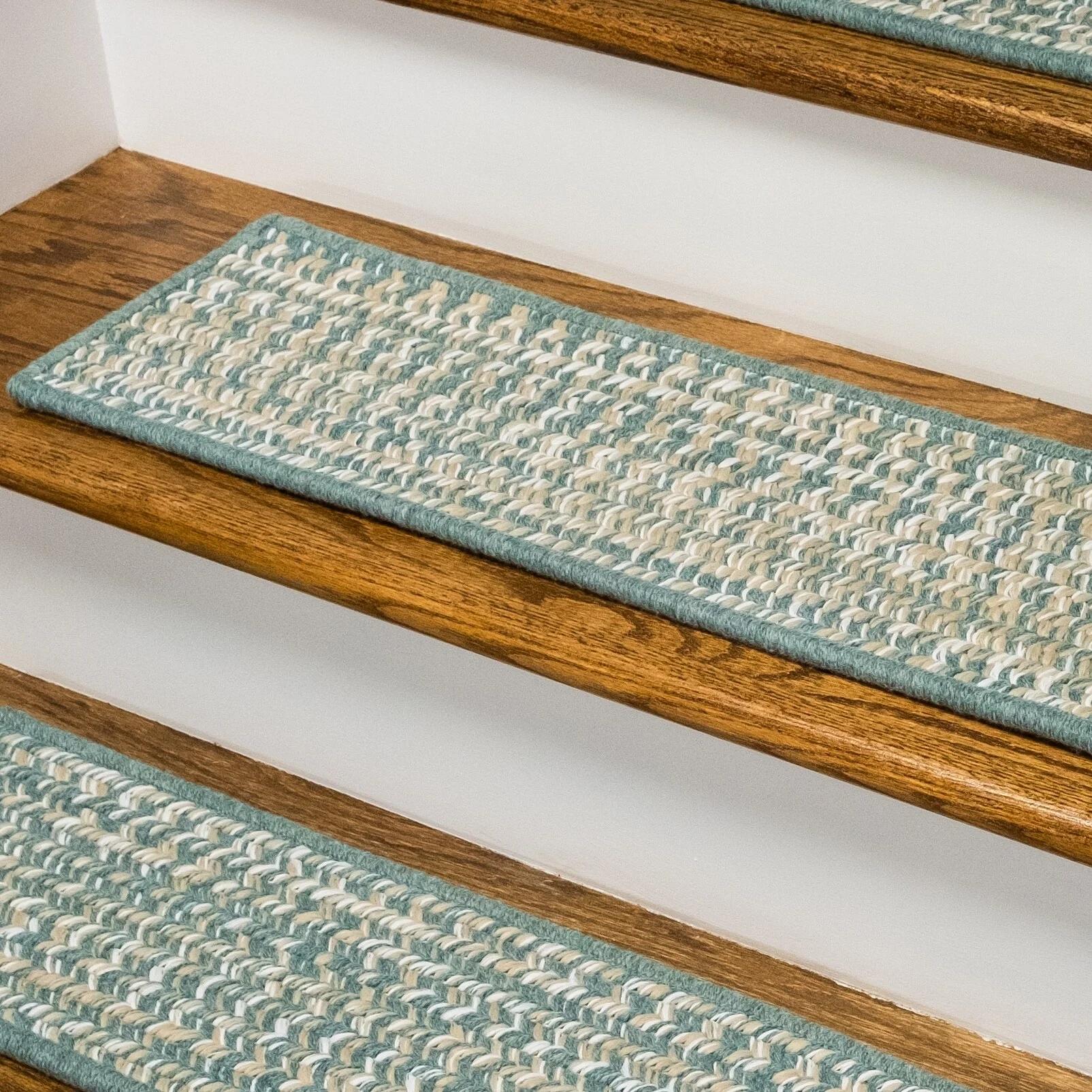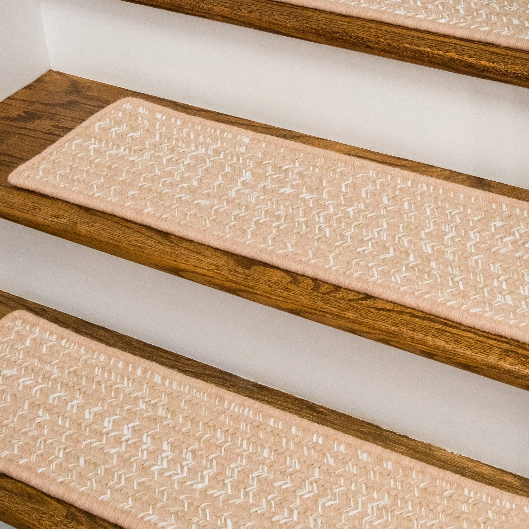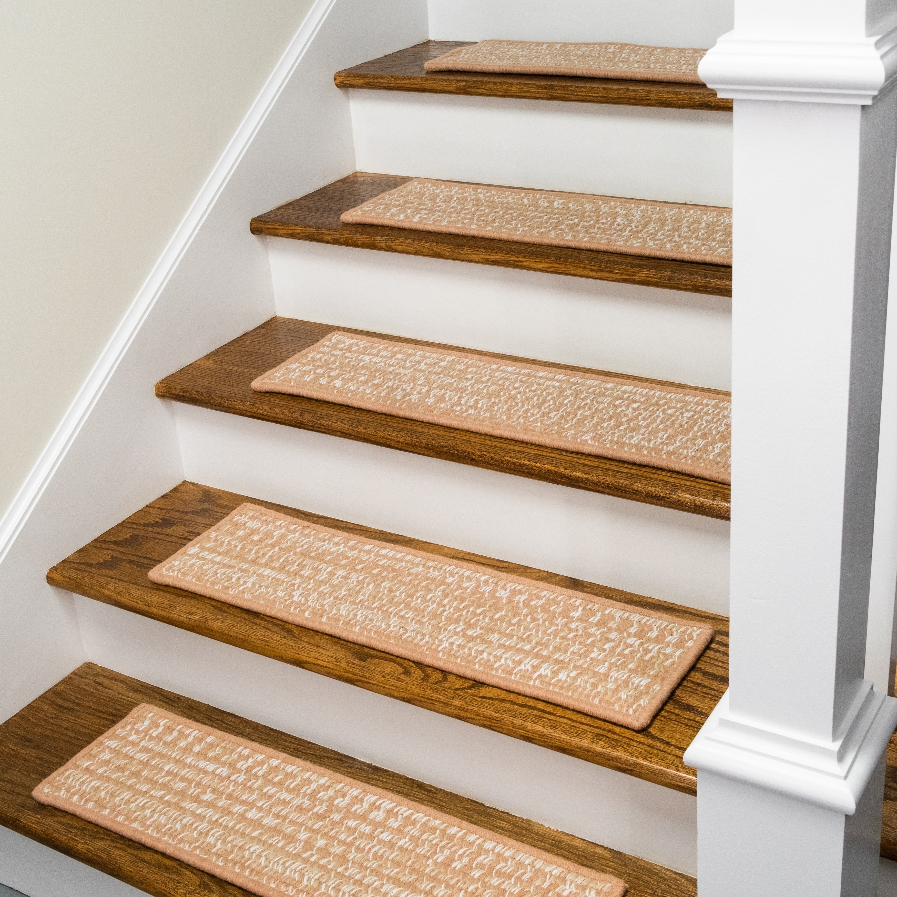 Soft wools blended into a multi-color woven tweed pattern. Soft, subtle style with a textured look and feel. Reversible stair treads. Wool yarns create a texturized, heathered look with unmatched quality, durability, and timeless style.