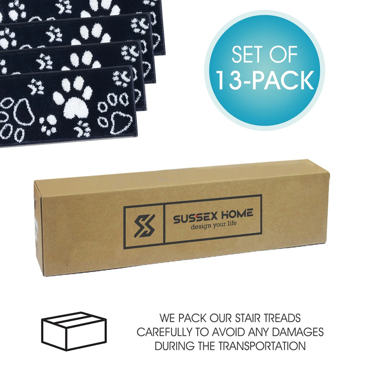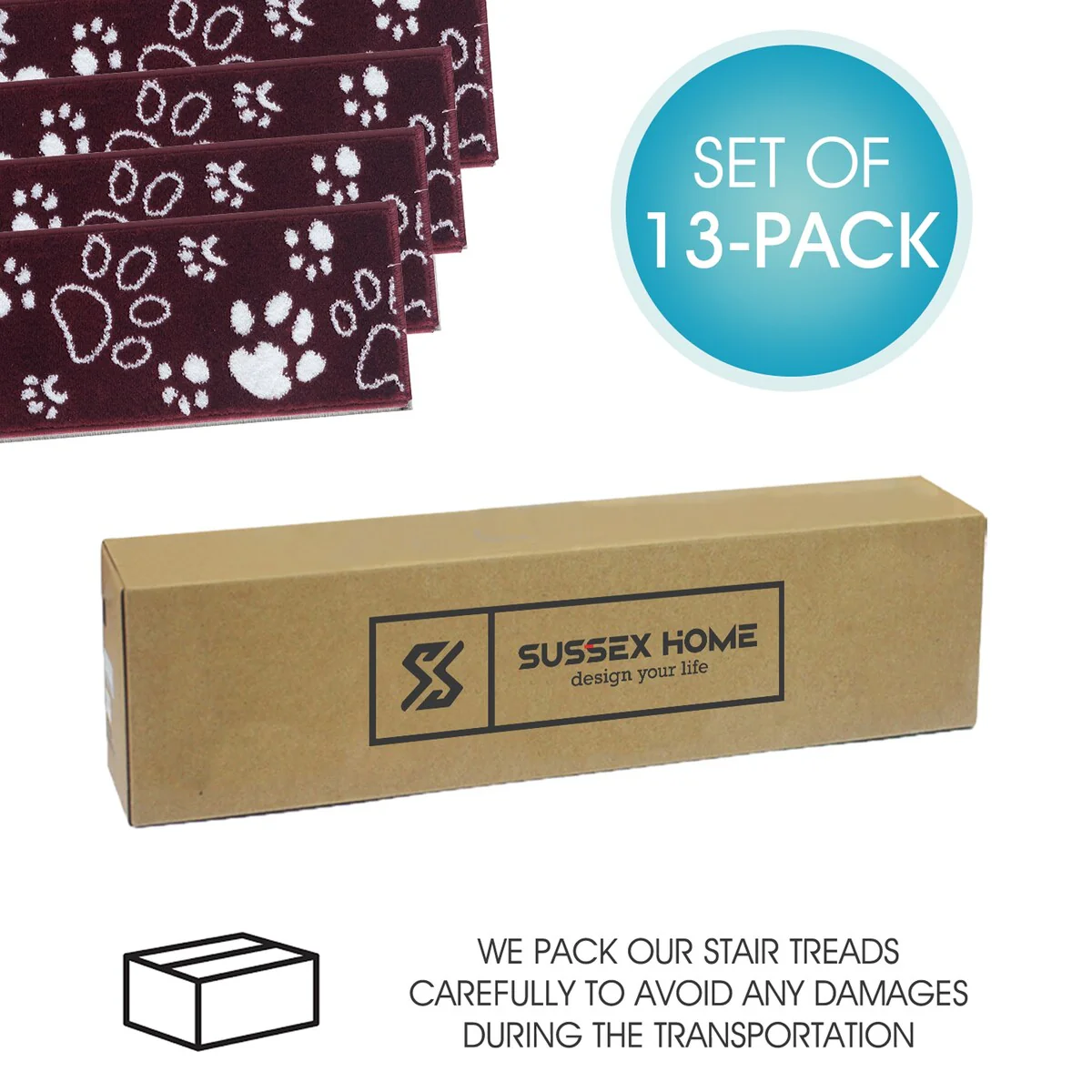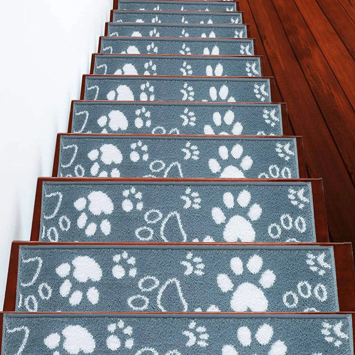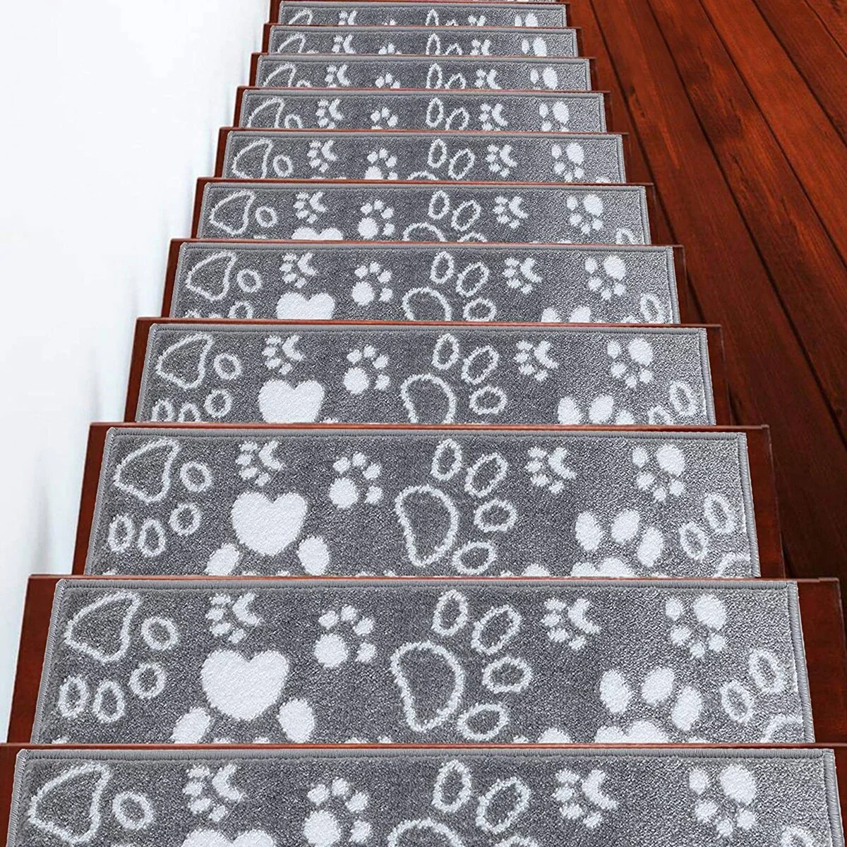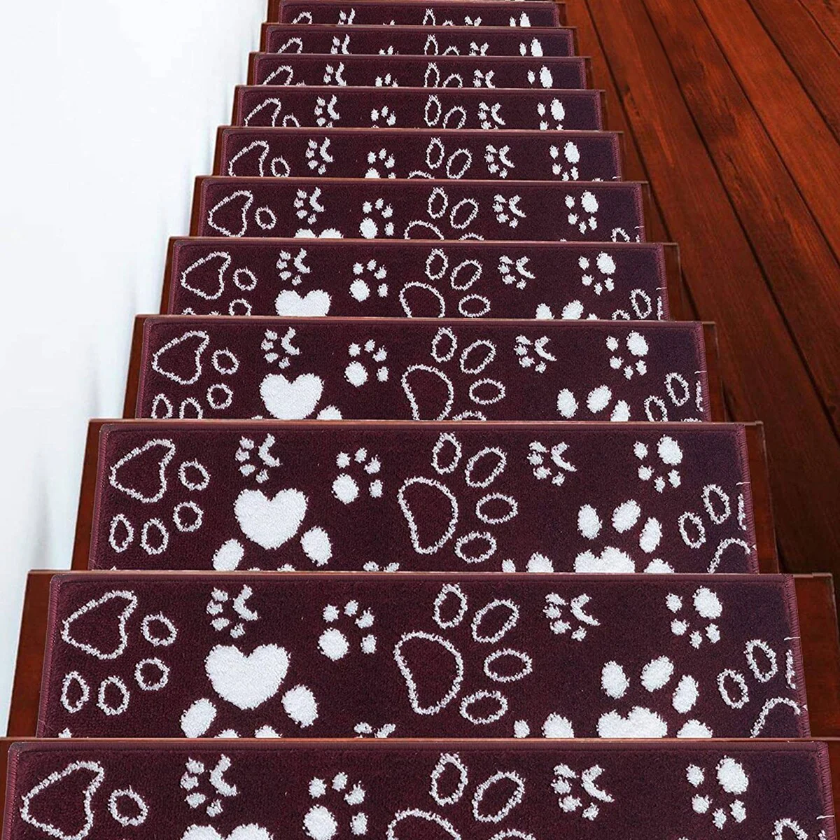 Make your hardwood staircase safer and more stylish with the Sussexhome Paw Collection Stair Treads for Wooden Steps. These non-slip stair treads are made from 100% polypropylene fabric, which is durable and gentle on bare feet. Each tread features a unique geometric pattern and is available in beige, black, brown, navy, red, teal, and gray. With a double-sided adhesive backing, installation is easy and requires no tools. Protect your stairs from scuffs and scratches while keeping your loved ones safe with these carpet stair treads.