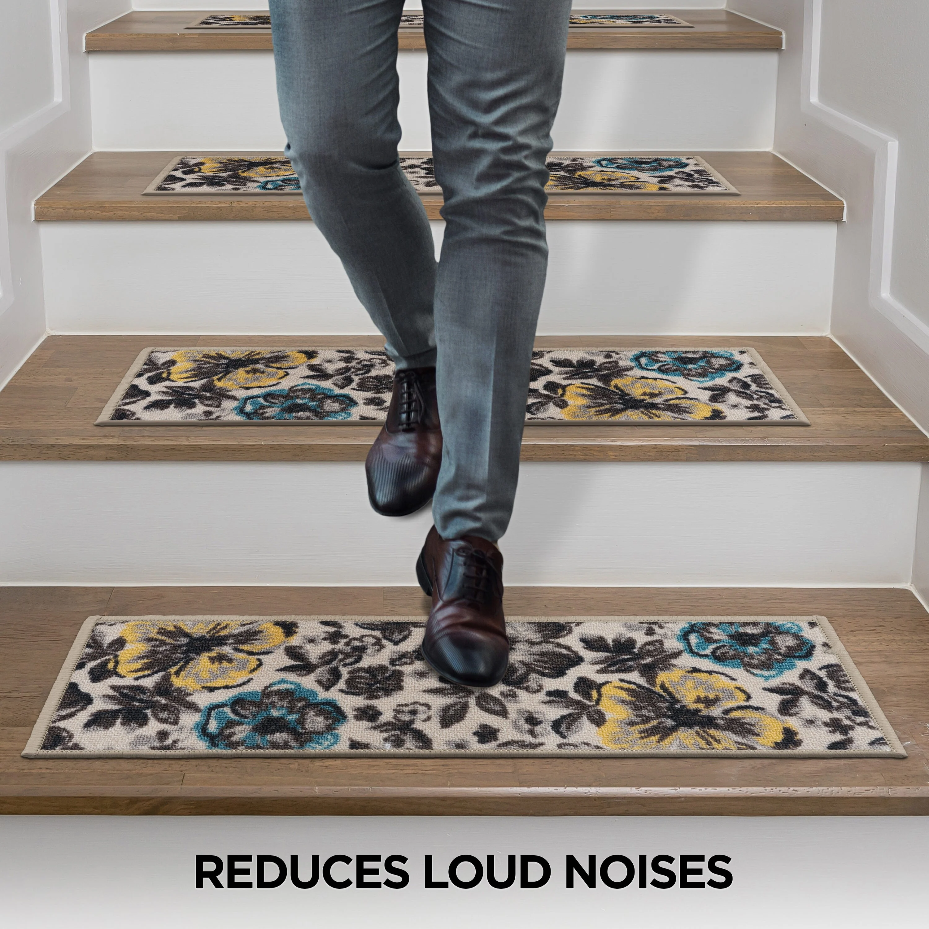 -Enrich your stairs with these stunning, yet practical and decorative, stair treads. The floral and paisley designs add interest and style to every step. The rubber backing provides additional safety for climbing kids and pets. At 26 inches x 8.6 inches, these machine washable treads are ideally sized for the majority of stairs.
