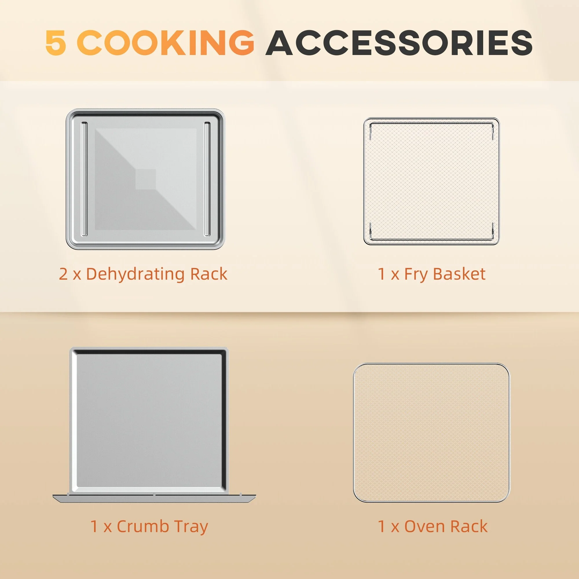 ACCESSORIES INCLUDED: 1 x fry basket, 2 x dehydrating rack, 1 x oven rack, 1 x crumb tray.