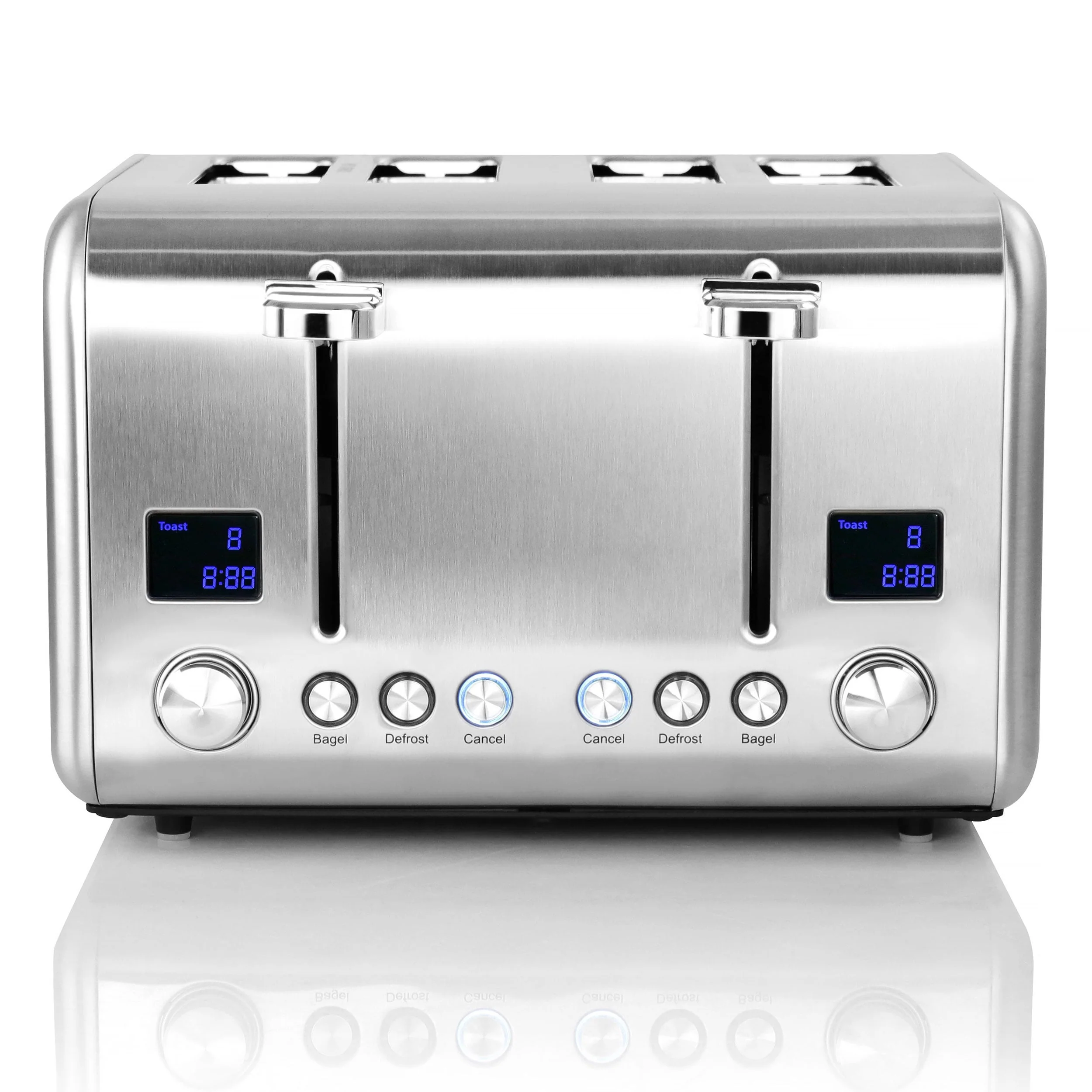 Create a delicious breakfast with this 4 Slice Stainless Steel Extra Wide Slot Toaster. Toast, heat and defrost all in one machine with one touch settings. Dual control panels are twice as fast, allowing you to create a breakfast for the entire family in a matter of minutes. 1.5 Inch wide slots are ideal for Waffles, Bagels, English Muffins and Texas Toast, breakfast jut got easier! Features 9 adjustable preset browning settings perfect for all your different breakfast creations. Brushed stainless steel housing is easy to clean and care for and matches every kitchen decor. LED screen shows how much time is left on your selection. Includes convenient slide out crumb tray allowing for quick and easy cleaning.Color: SilverPower: 120V/60Hz - 1800WSlot: 4Construction: Stainless Steel HousingDisplay: Digital LCDFunctions: Cancel, Reheat, Defrost, BagelIndicator LightAuto-electric Power Cut Off Function;9 Preset Timer Browning SettingsBread Centering FunctionRemovable Crumb TryCord StorageAnti-Slip Design