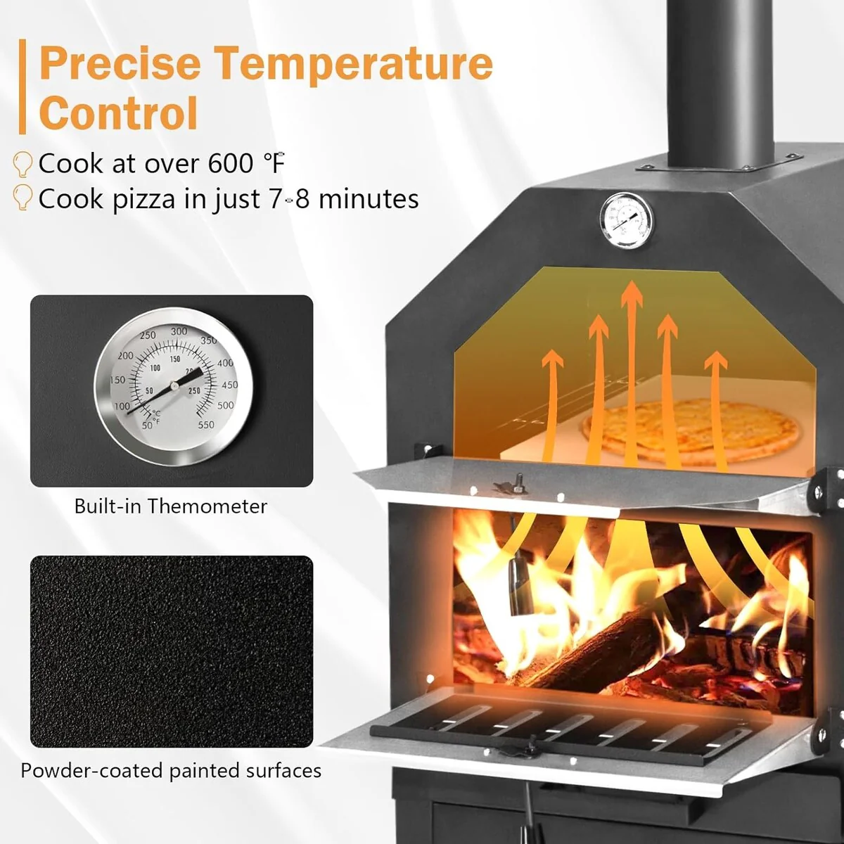 - Easy Temperature Control:To achieve optimal results, preheat the oven for 3-5 minutes until the temperature reaches 550°F before placing the pizza inside.The built-in thermometer lets you keep an eye on the temperature while cooking. And our pizza oven has an adjustable chimney and air outlet which can easily control the firepower and the smoke.
