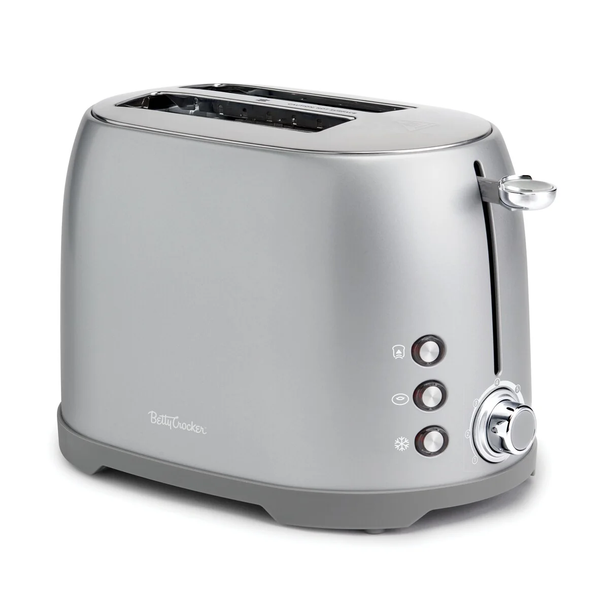 Not your ordinary 2 slice toaster! Betty Crocker’s deluxe toaster makes more than just toast. We offer a multifunctional slot toaster for sliced toast, thick bagels, delicious Belgian waffles and other toastable pastries. Our delightful compact toaster has 3 Illuminated buttons that light up when pressed to let you know they're on and working. Illuminated buttons include a bagel button designed for perfectly toasted bagels, reheat button for toasting cold bread and a cancel button that automatically stops toasting and lifts the slotted bread. Traditional push-down tab turns the toaster on and off while the extra-lift feature provides added lift of the slots to easily grab your contents. Cute toaster design with Brushed metallic finish is easy to clean while maintaining a wonderful shine that works well in any kitchen. Slotted toaster also features 2 bread centering guides in each slot and an adjustable shade dial with electronic shade sensor control & 7 settings. 800 watts. Bread toaster 2 slice comes with a slide-out crumb tray for easy removal of leftover crumbs. Pop up and welcome your new favorite kitchen appliance! Our Betty Crocker kitchen appliance makes a perfect toast to any new home, dorm room, apartment and living space with limited countertop space.
