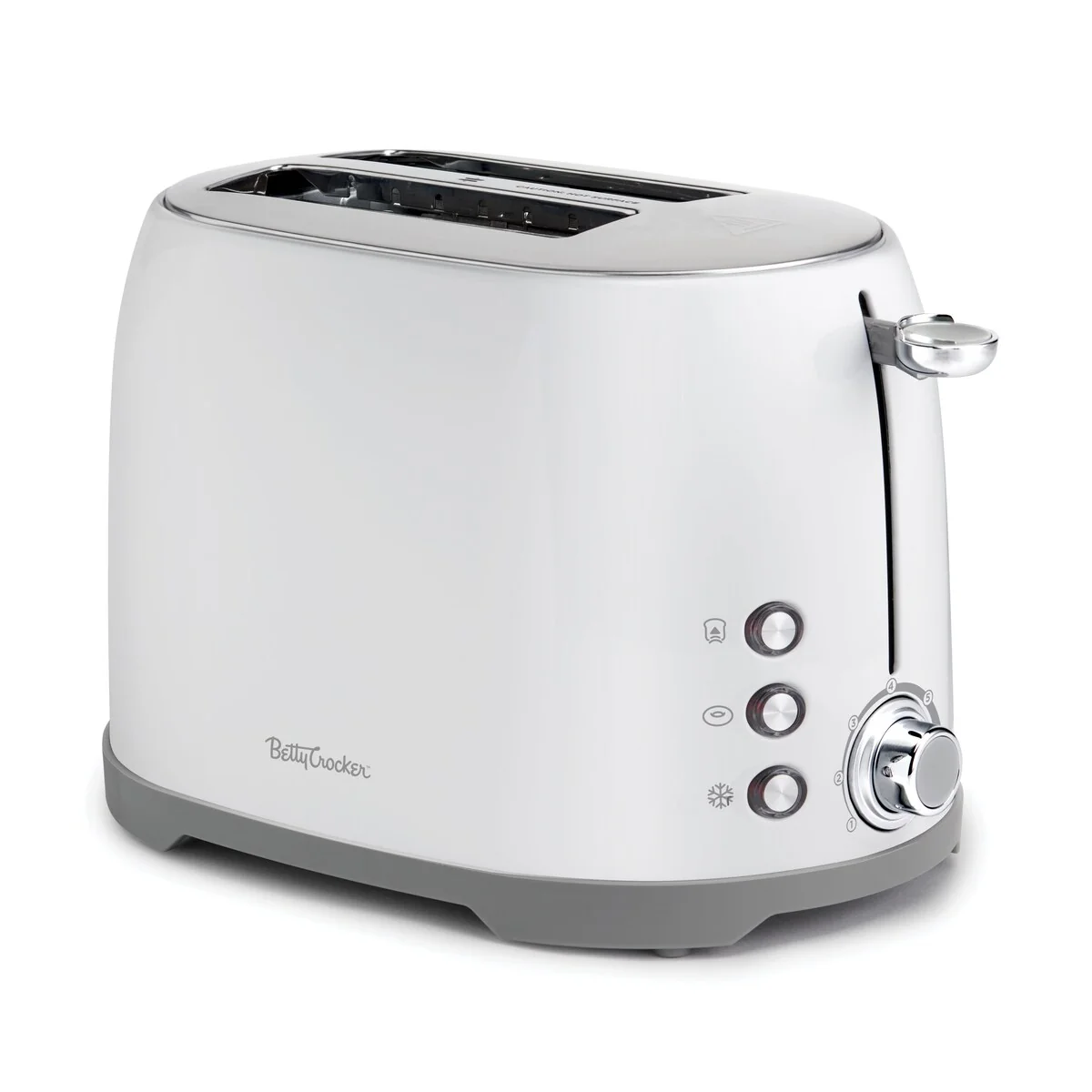 Not your ordinary 2 slice toaster! Betty Crocker’s deluxe toaster makes more than just toast. We offer a multifunctional slot toaster for sliced toast, thick bagels, delicious Belgian waffles and other toastable pastries. Our delightful compact toaster has 3 Illuminated buttons that light up when pressed to let you know they're on and working. Illuminated buttons include a bagel button designed for perfectly toasted bagels, reheat button for toasting cold bread and a cancel button that automatically stops toasting and lifts the slotted bread. Traditional push-down tab turns the toaster on and off while the extra-lift feature provides added lift of the slots to easily grab your contents. Cute toaster design with Brushed metallic finish is easy to clean while maintaining a wonderful shine that works well in any kitchen. Slotted toaster also features 2 bread centering guides in each slot and an adjustable shade dial with electronic shade sensor control & 7 settings. 800 watts. Bread toaster 2 slice comes with a slide-out crumb tray for easy removal of leftover crumbs. Pop up and welcome your new favorite kitchen appliance! Our Betty Crocker kitchen appliance makes a perfect toast to any new home, dorm room, apartment and living space with limited countertop space.