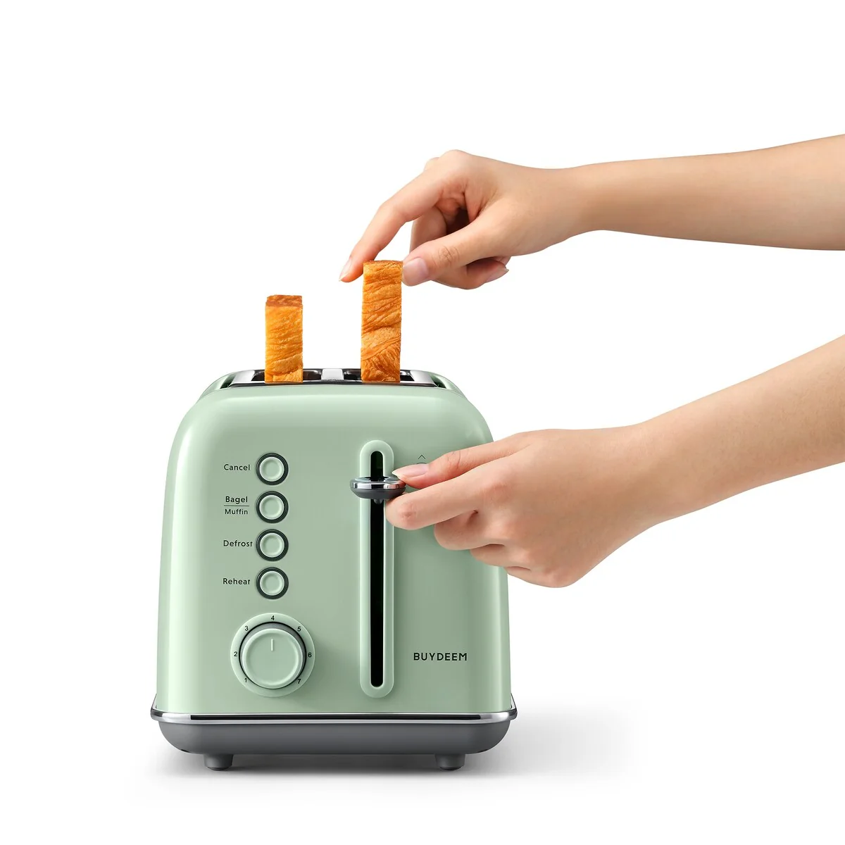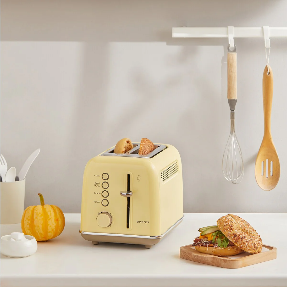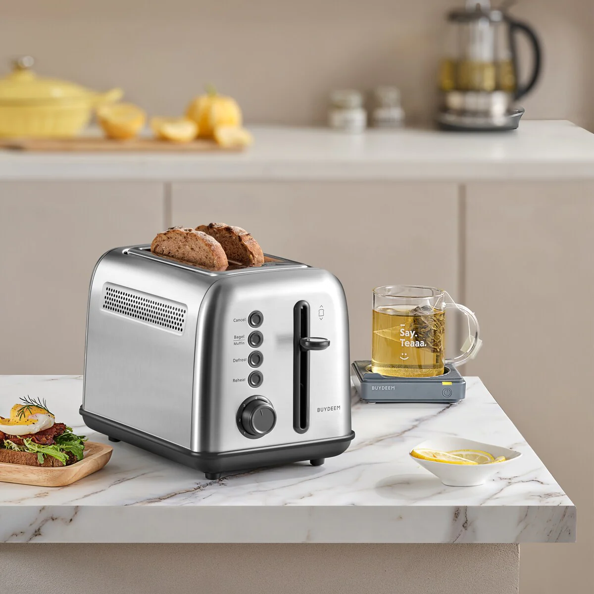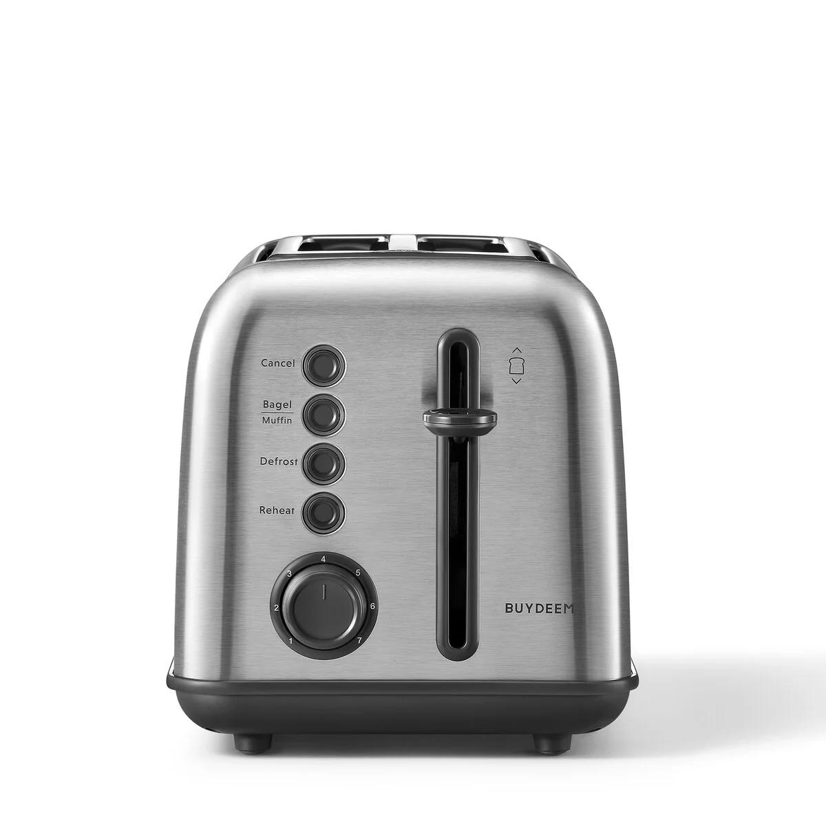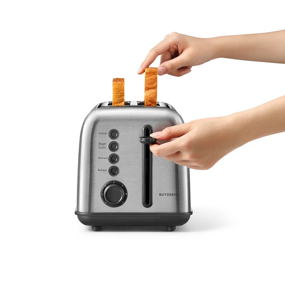 Introducing our buydeem latest toaster,designed to elevate your breakfast experience to new heights.Featuring 2 extra-wide slots, this toaster ensures that even the thickest slices of bread or bagels can be toasted to perfection. With 7 shade control settings, you have the freedom to customize your toast exactly to your liking, whether you prefer a light golden brown or a deep, rich caramelized finish. But that's not all – our toaster also comes equipped with 4 convenient pre-set programs: Cancel for stopping the toasting process at any time, Bagel for toasting only one side of your bagel while keeping the other side warm, Muffin for gently warming your favorite breakfast pastries, Defrost for thawing frozen bread or pastries before toasting, and Reheat for quickly warming up toast without further browning. And when your toast is ready, our toaster features automatic pop-up functionality with a high lever lift, making it easy and safe to retrieve your toast without burning your fingers. Say goodbye to soggy or unevenly toasted bread – with our toaster, every slice is toasted to perfection, every time.