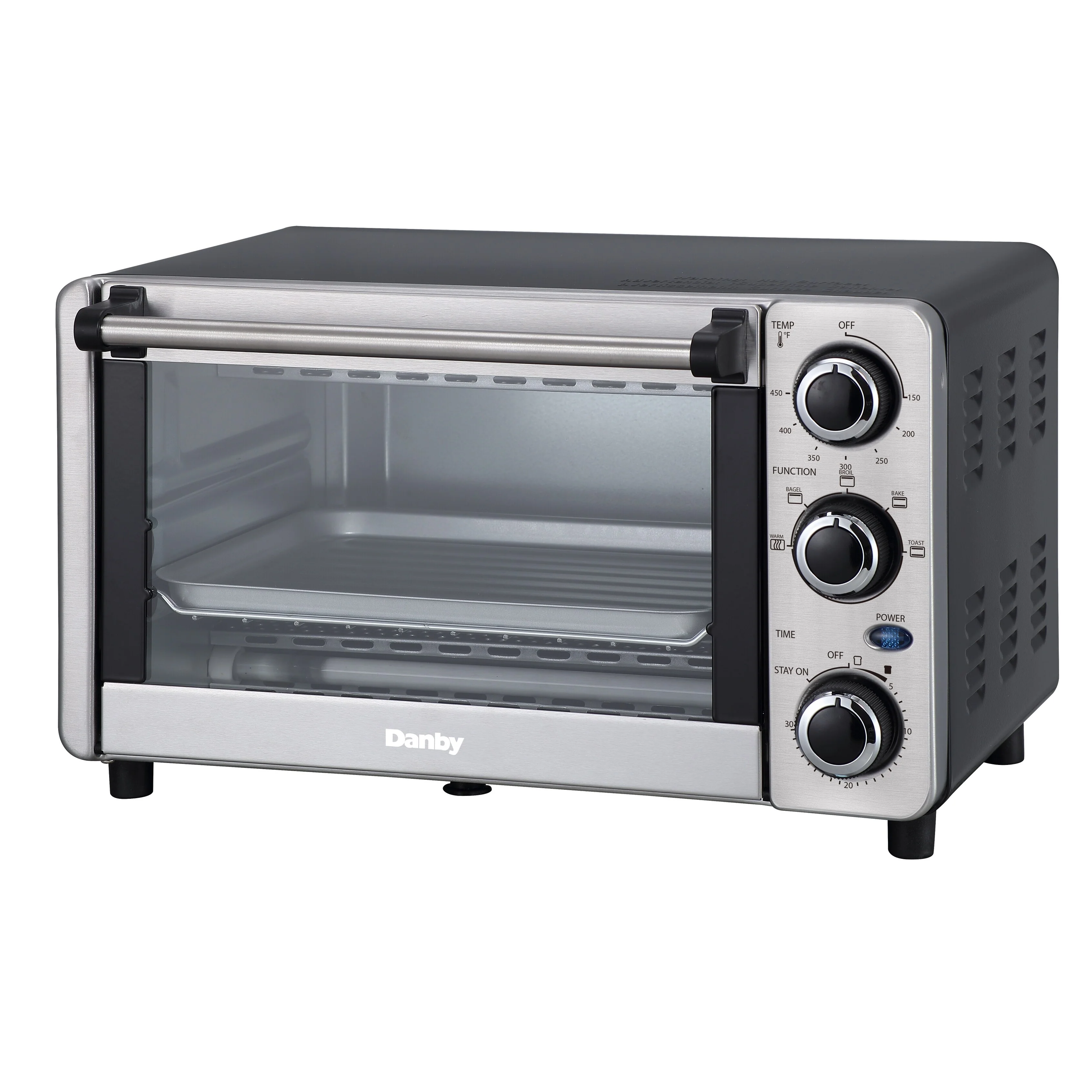 Introducing the 0.4 cu. ft. (12 L) stainless steel toaster oven by Danby! Choose from 4 pre-programmed cooking functions toast, bake, broil, and keep warm which provide a wide range of cooking versatility! This model comes with 1100 powerful watts for fast and even cooking, a temperature range of 150-450°F, a 30-minute timer, and at this capacity you could fit 4 slices of bread or a 9' pizza. Also included in your purchase is a baking rack and baking tray, and a 2-year limited warranty. Discover the convenience of cooking at home with this beautiful new toaster oven from Danby!