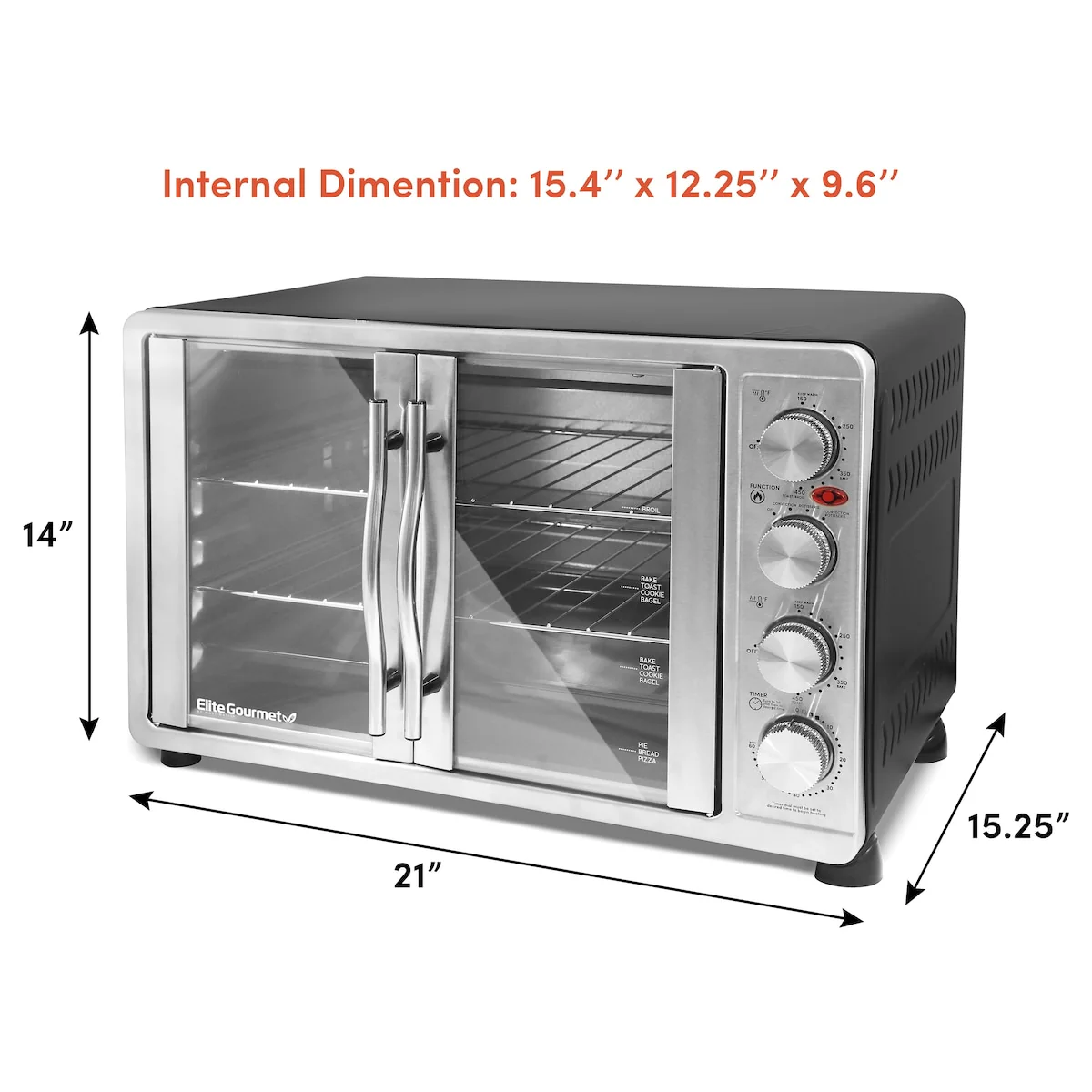 The Elite Platinum Double Door Oven with Rotisserie and Convection is the ultimate countertop oven that can replace or supplement your traditional oven. With its versatile functionality, you can toast, bake, broil, and rotisserie your way to delicious meals and desserts. The spacious interior features 4 rack positions that can accommodate 2 x 12' pizzas and a casserole, all at the same time. The top and bottom heating elements can be independently controlled with separate temperature dials, while the convection feature circulates hot air inside the oven for flakier crusts and tender meats in less time. The rotisserie spit and fork assembly rotates food to perfection. The oven also has a 60-minute timer with a signal that turns it off automatically. The stylish stainless steel door handle, frame, and panel add elegance to your kitchen.